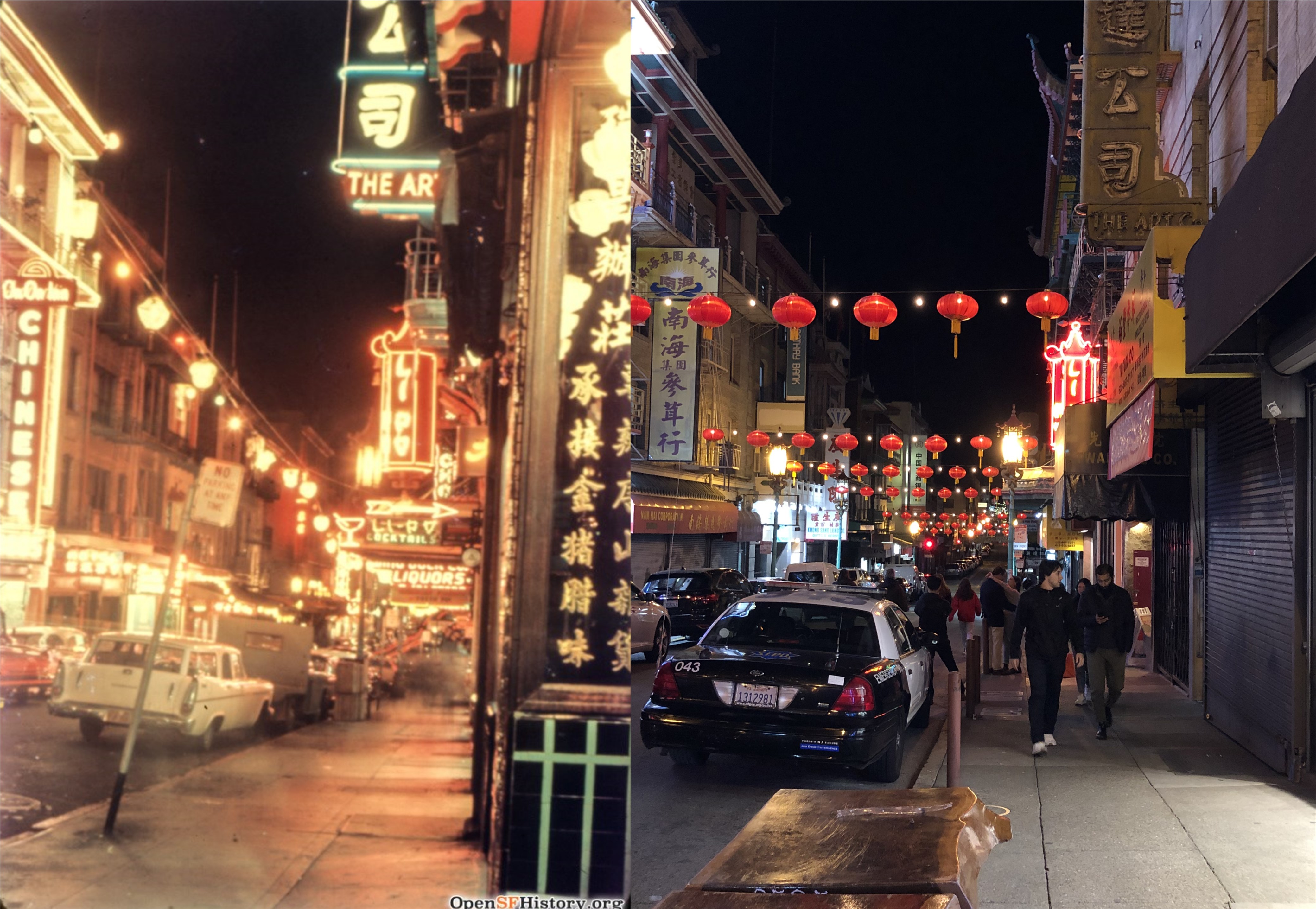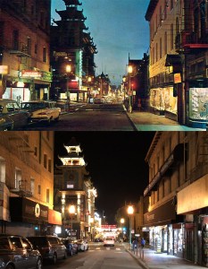 Grant Avenue near Pacific Avenue during the 60s: Near Broadway, this used to be a favorite dining area in Chinatown at night, but it’s kind of quiet now.