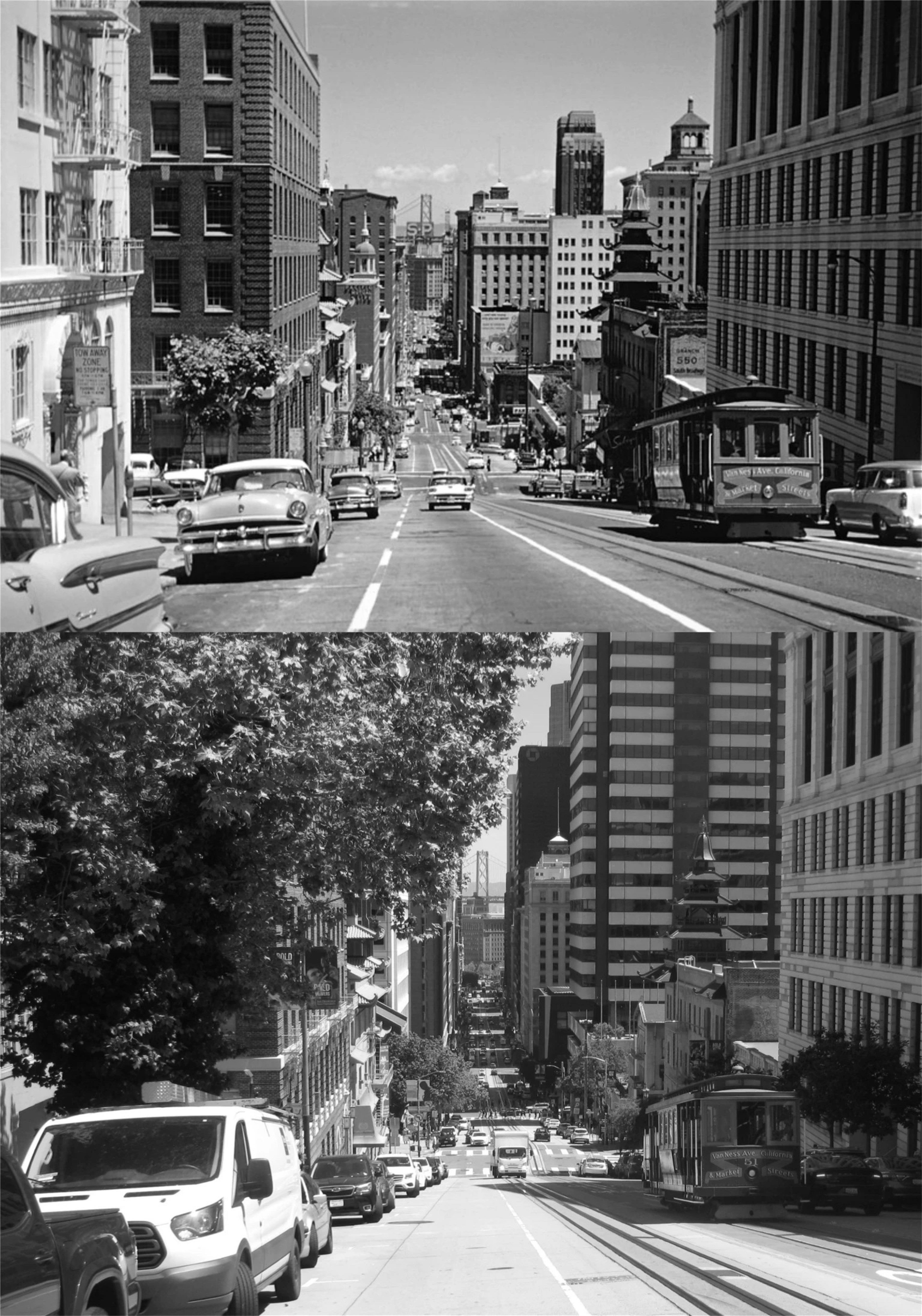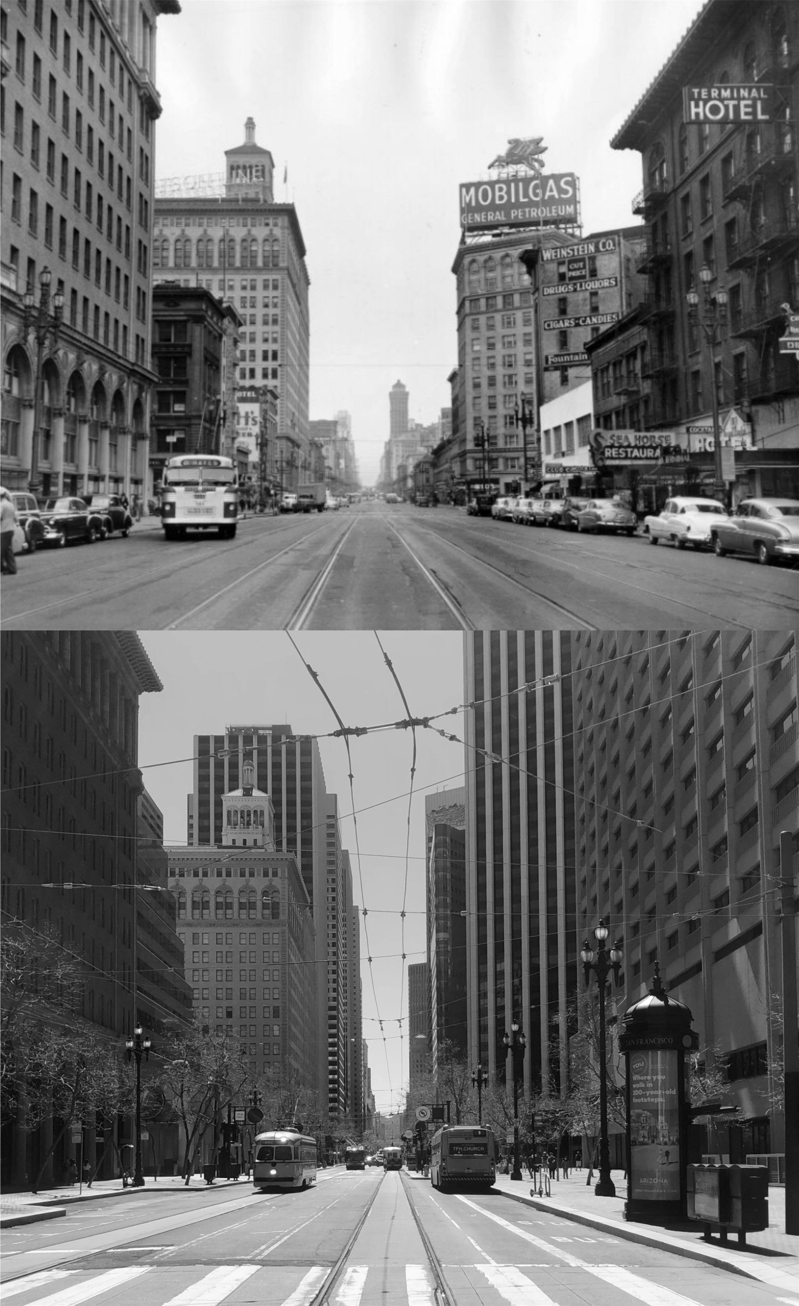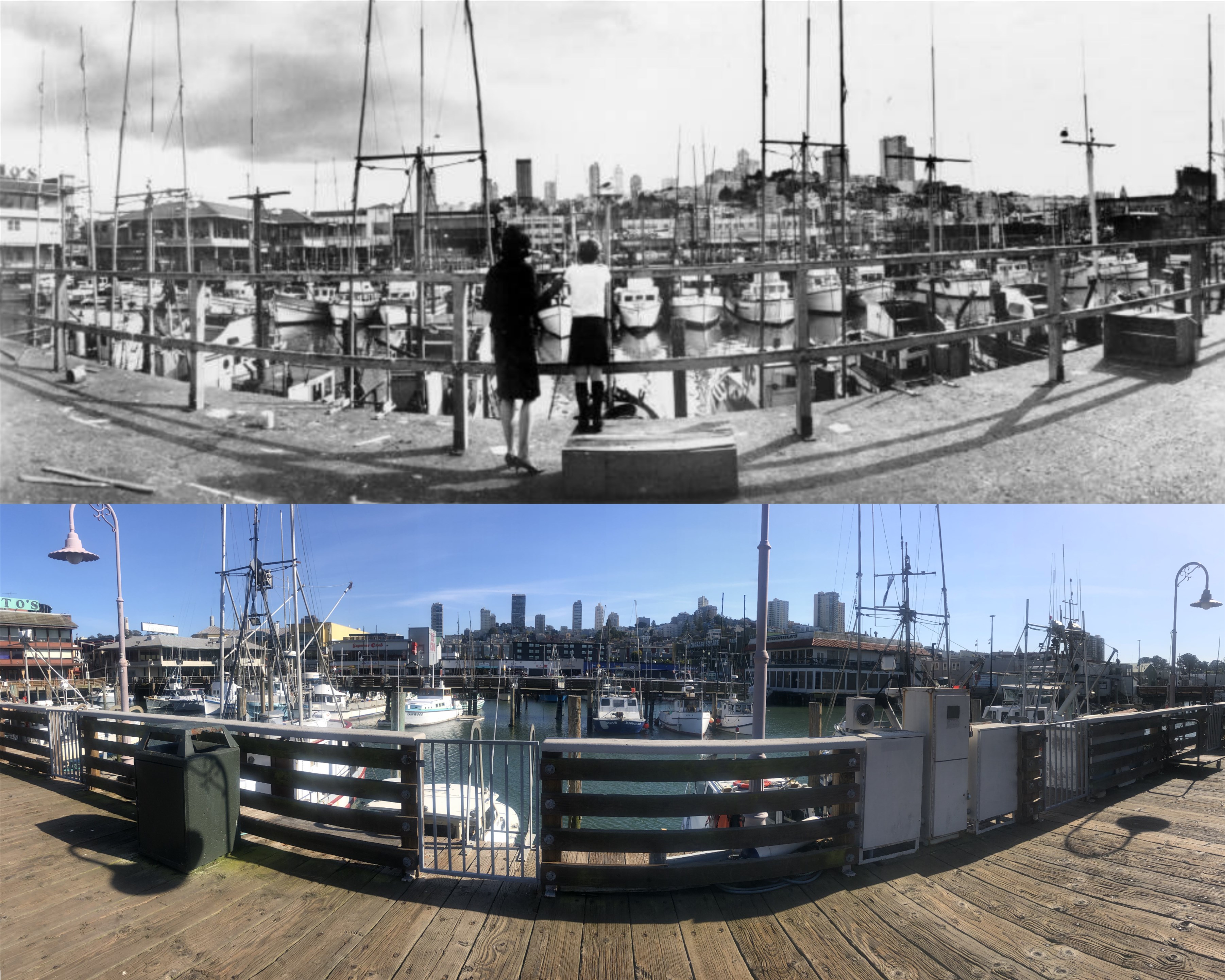 The Fisherman’s Wharf Boat Lagoon in the 1960s; It wasn’t a bad attempt of “stuplicating” the old wide angle photo. (San Francisco Public Library Archives)