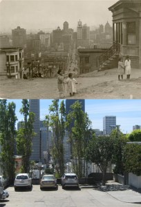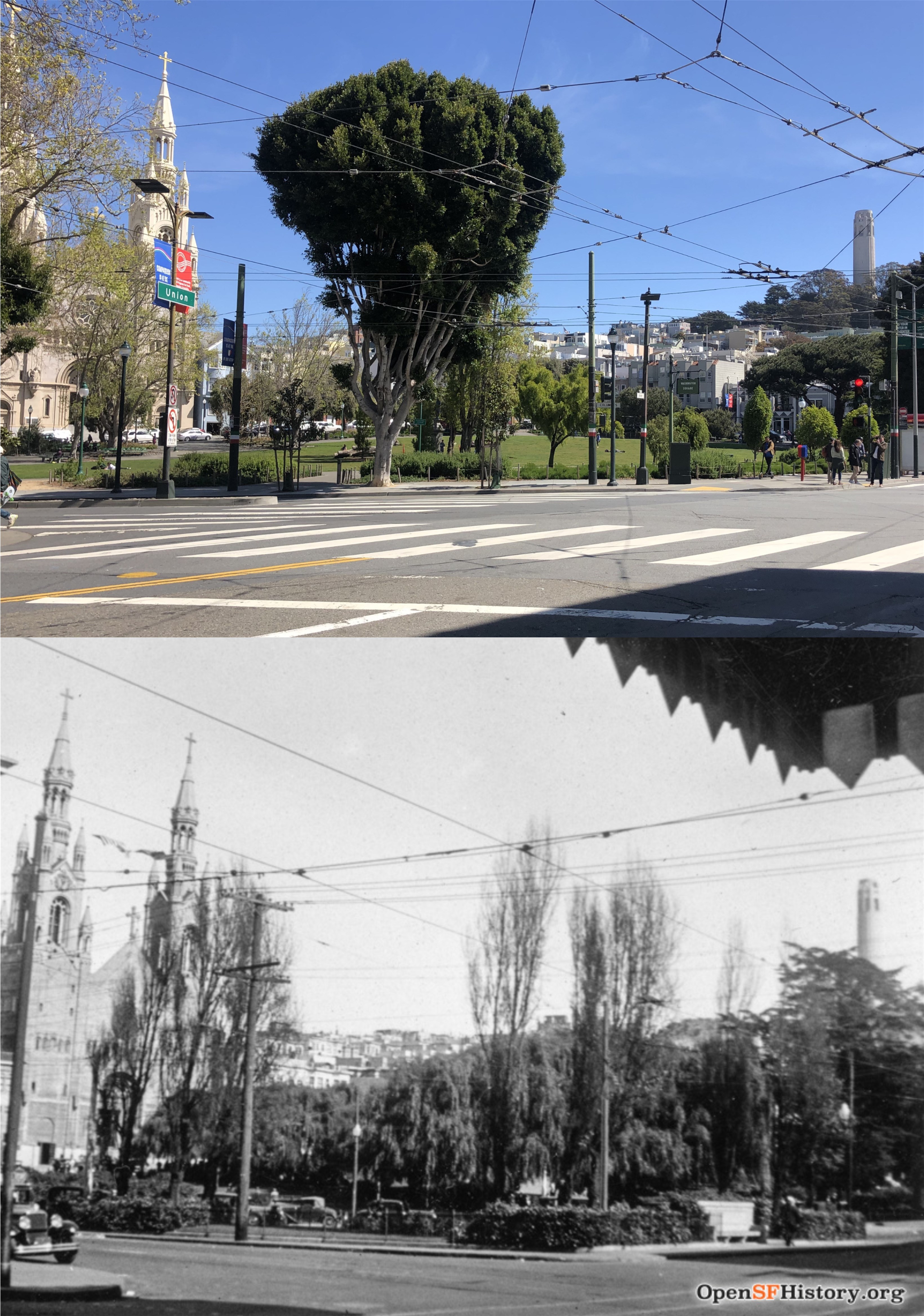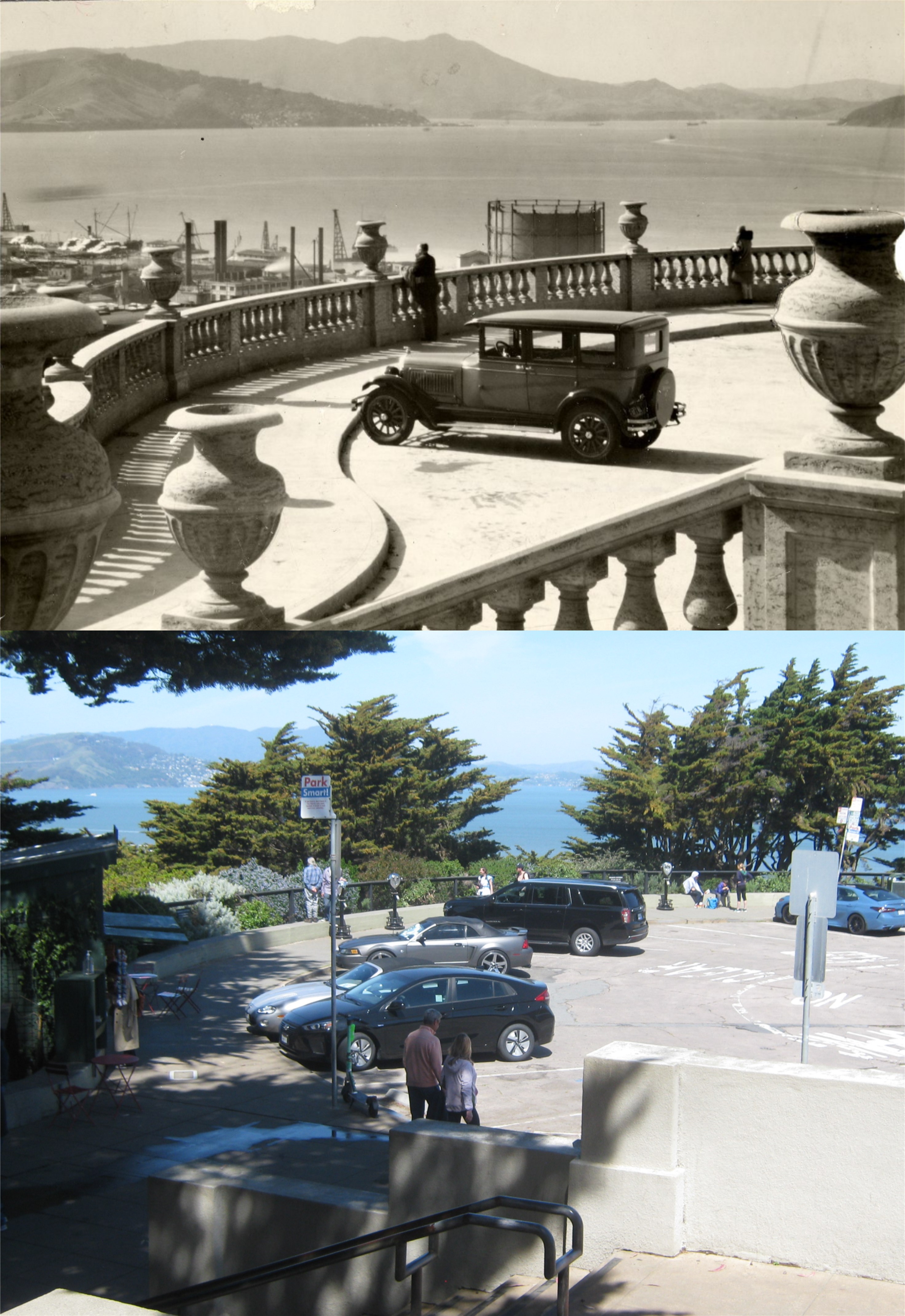 When I was up on Telegraph Hill last week, I took a picture of Fisherman’s Wharf through the unnecessarily high trees surrounding the Coit Tower parking lot. This is about the only spot you can see Fisherman’s Wharf from the parking lot anymore. When I was searching for Fisherman’s Wharf pictures on the San Francisco Library Archives site, I found this close lineup of the Wharf from the parking lot, taken probably during the 1960s.