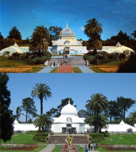 I like the color scheme of this vintage picture of the Conservatory Building in Golden Gate Park, which is probably known as ‘3D schéma de couleur’.