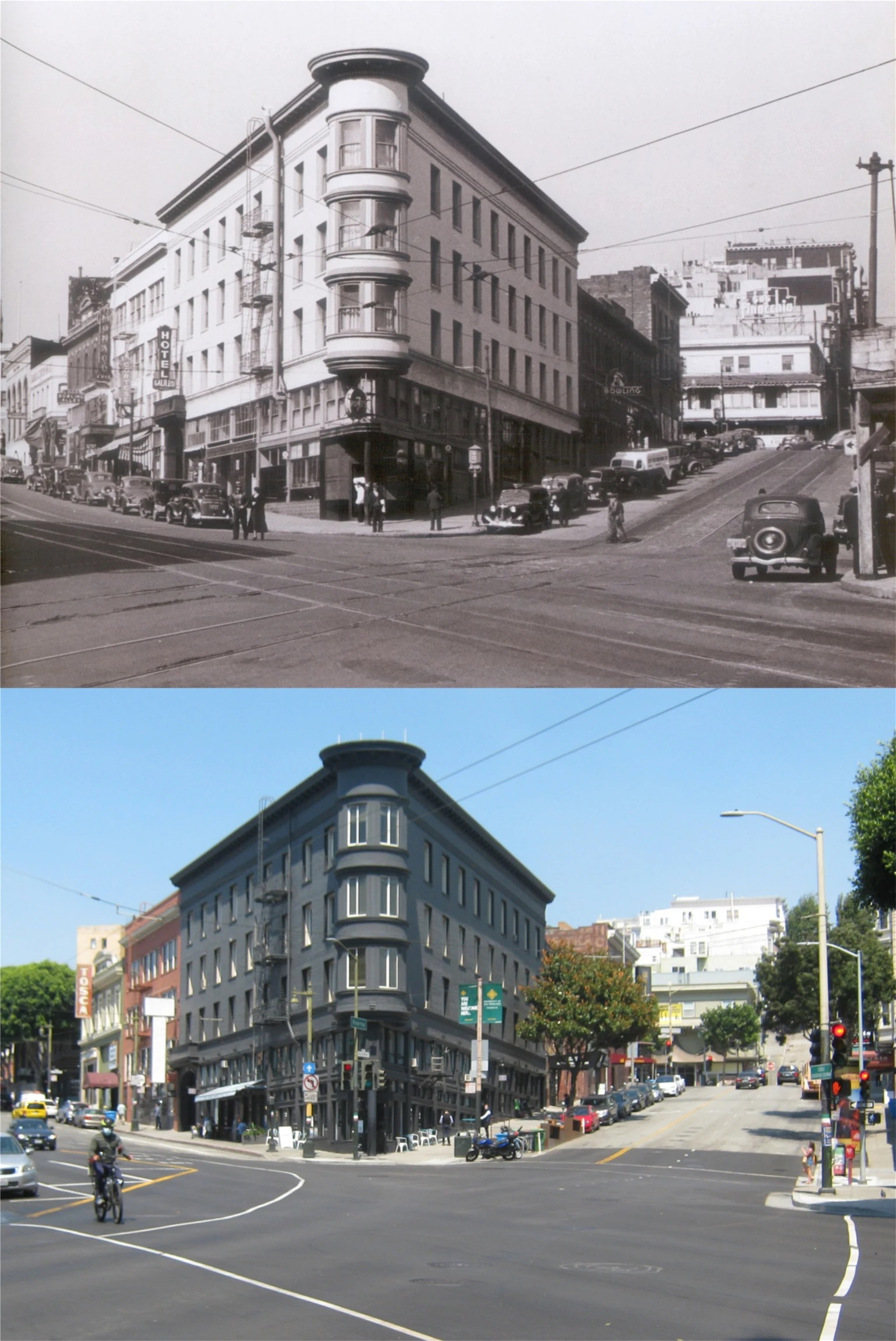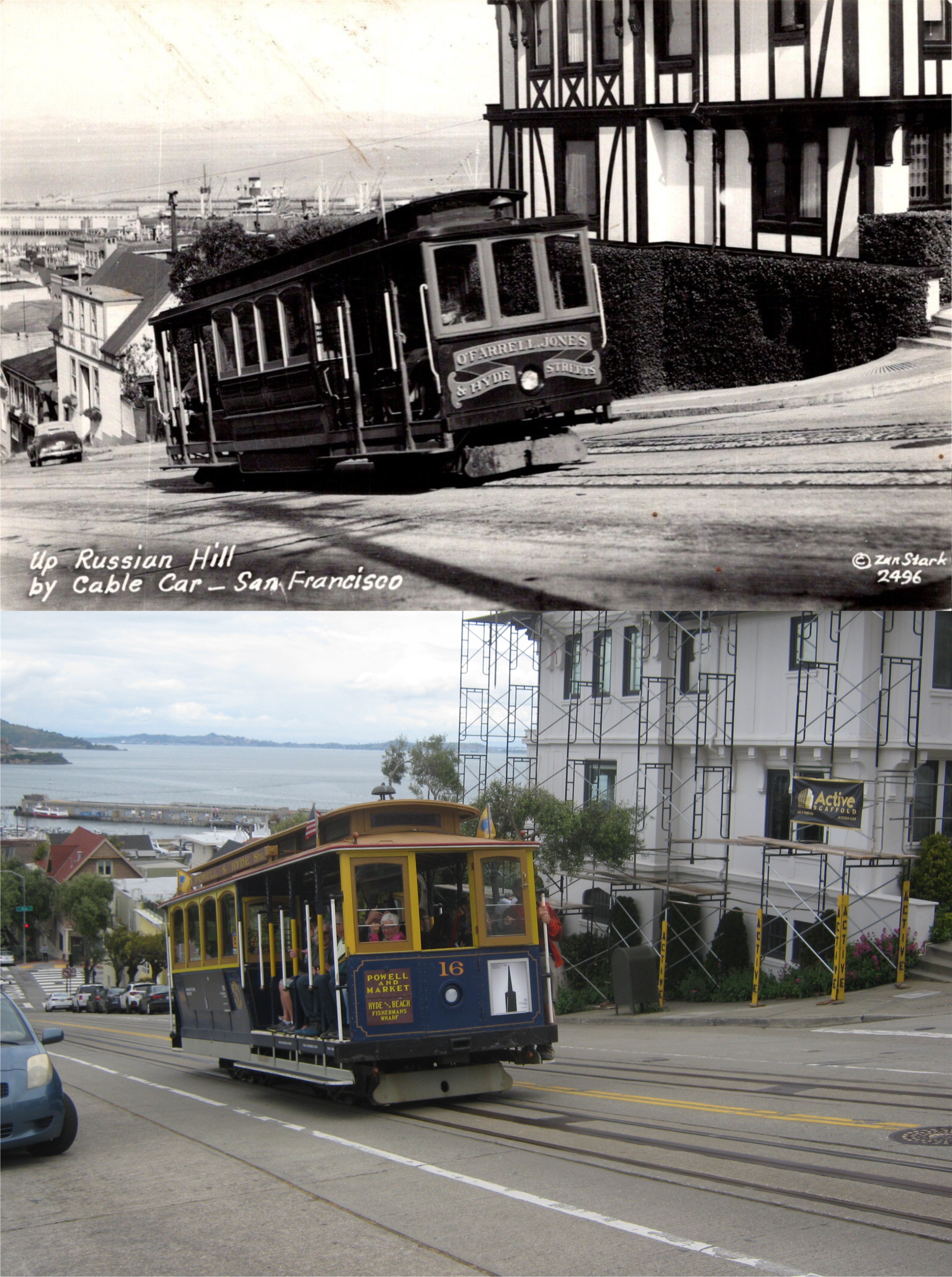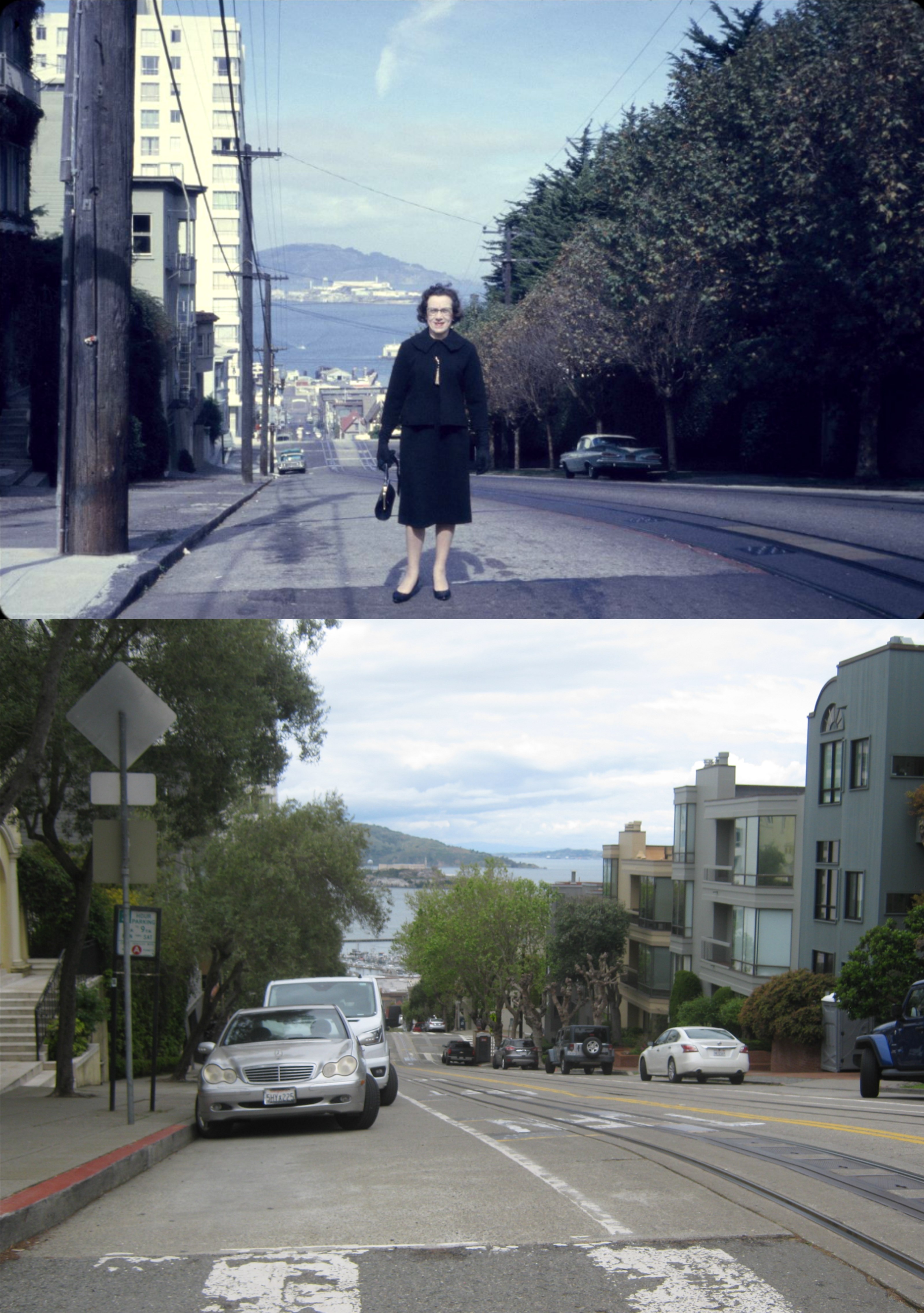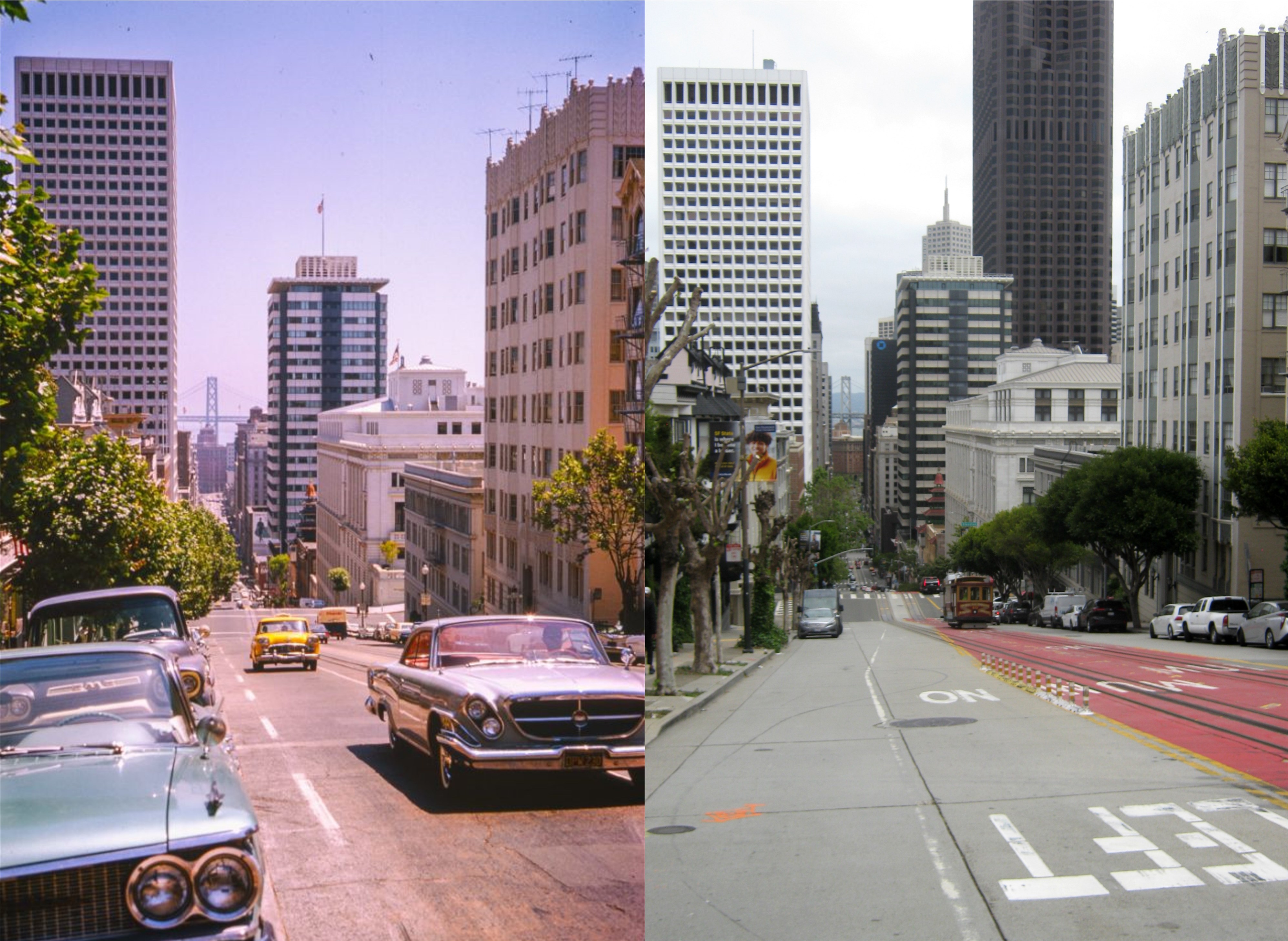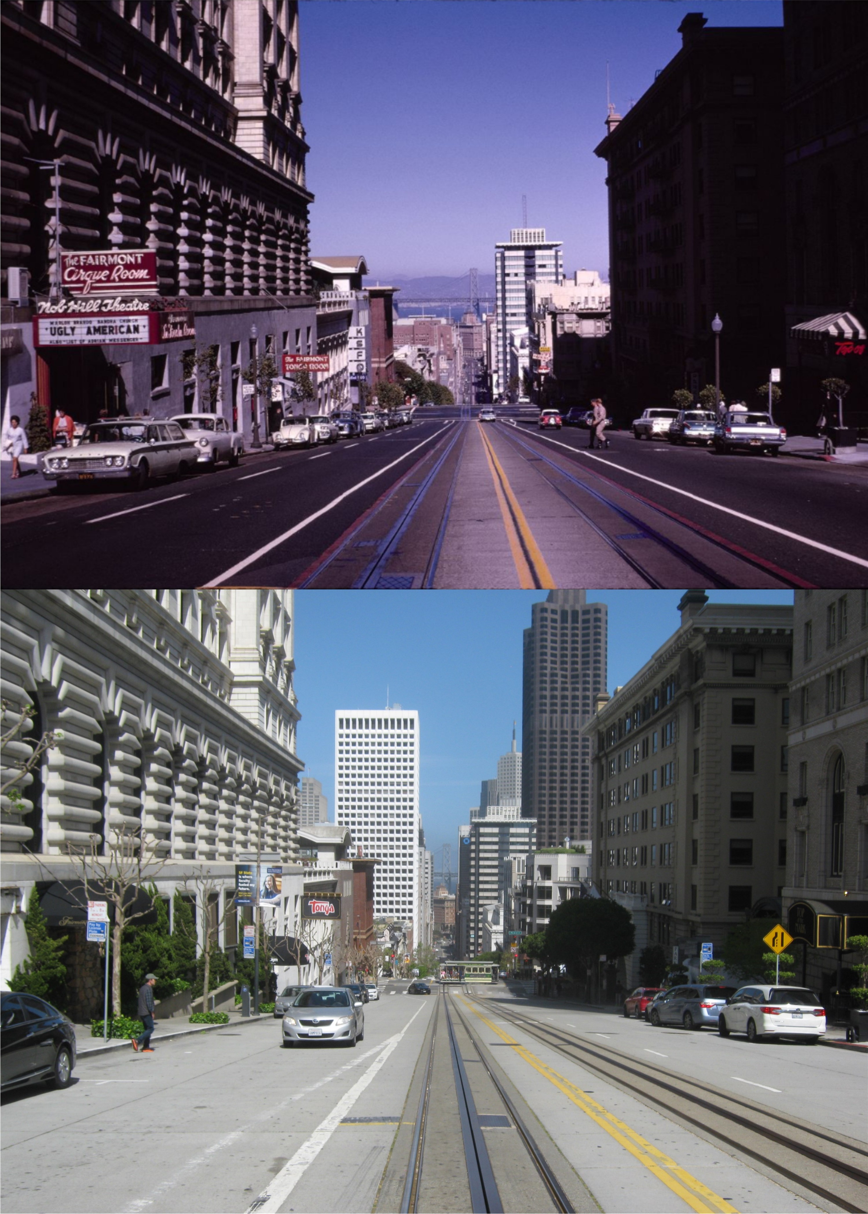 On the 25th I took Muni #1 up to Nob Hill and headed down California Street to Chinatown. The cars and the monstrous Bank of America Building are about the only differences from this view. (Vintage Everyday)