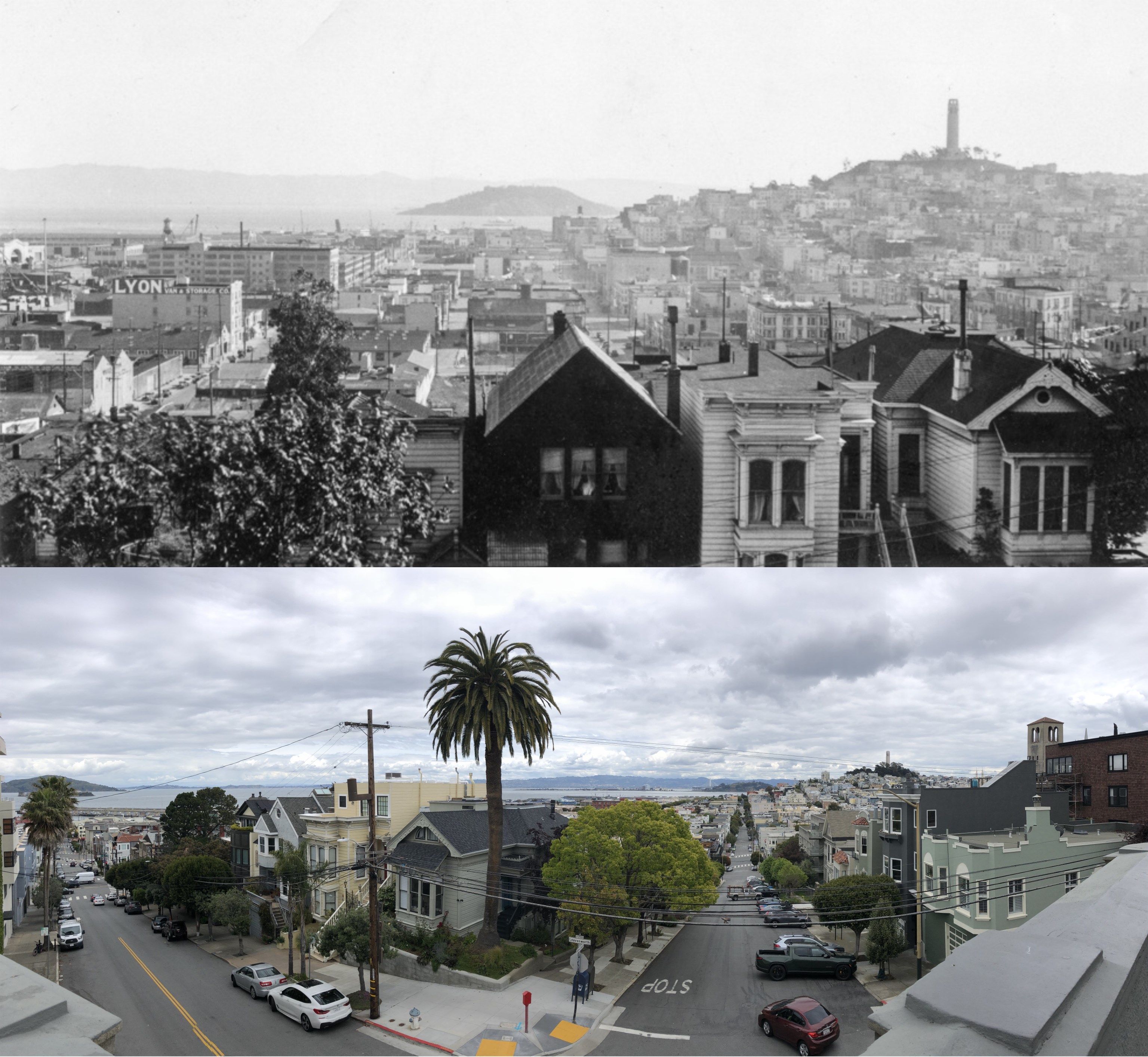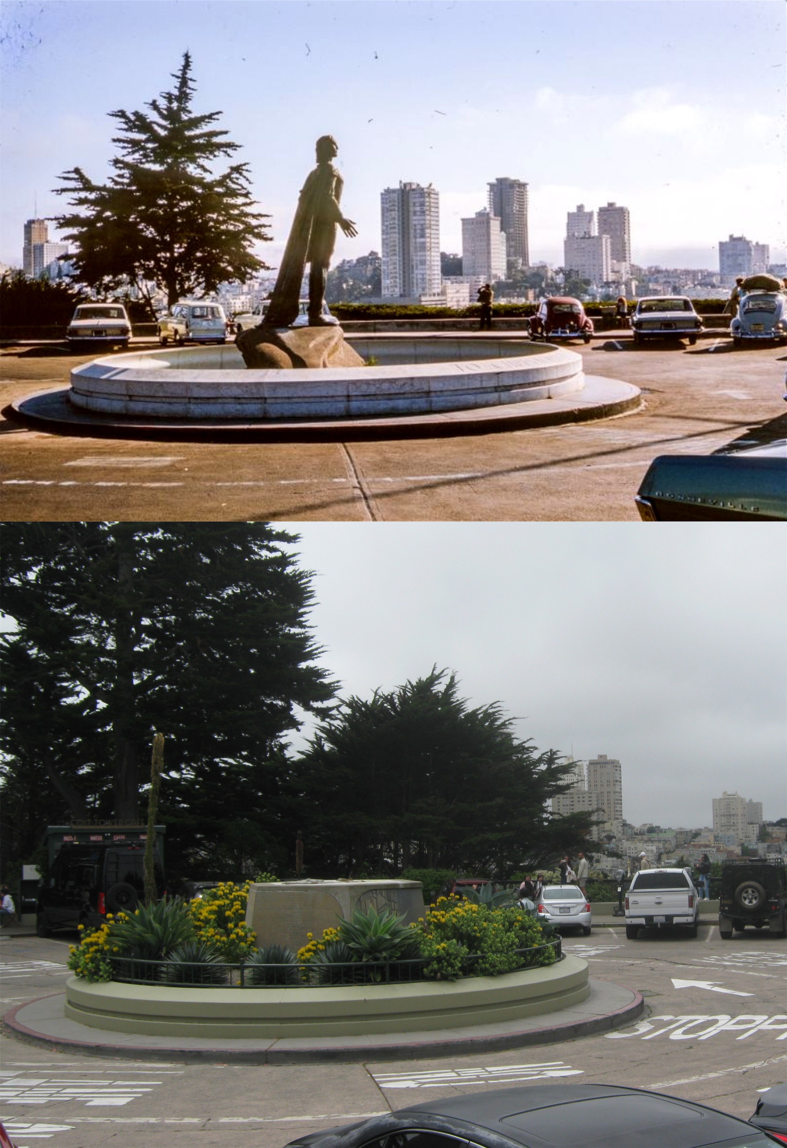 To start out the Memorial Day weekend, I headed back up to the top of Telegraph Hill on Saturday to update this picture of the Columbus Statue in front of Coit Tower, removed in 2020 before vandals tore it down. If you want to get mad about something, get mad about the fact that there is almost no view from here anymore because they won’t cut down the trees blocking the scenery. (Vintage Everyday)