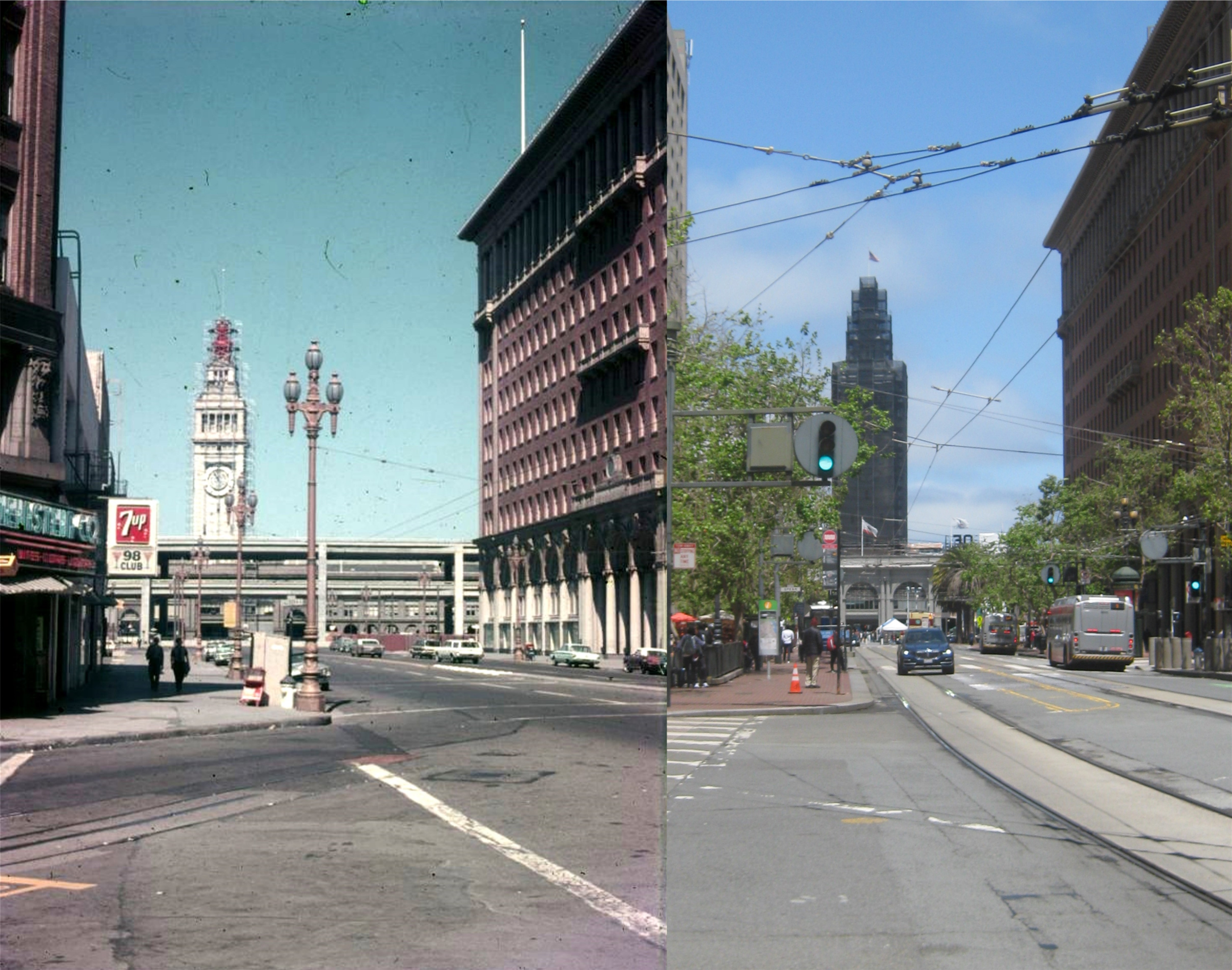 At the bottom of Telegraph Hill, I took the F Line streetcar back along the Embarcadero to Market Street, just in time for the sun to come out. This photo from where California and Drumm Streets come in to Market, although poor quality, shows what looks to be scaffolding around the Ferry Building then, as well; although it may just be a double exposure.