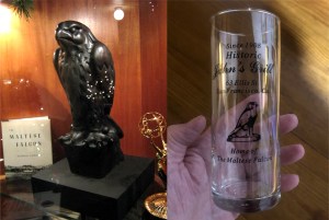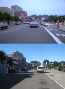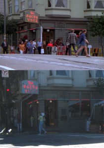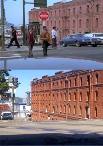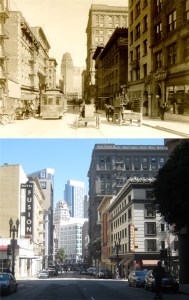 Another one of Kinkade’s masterpiece wannabes: His paintings always make me want to run up ‘Old Glory’ somewhere when I see one, but I really like this one of Market Street before the 1906 Earthquake. The domed Call Building, on the right it the painting, survived the 1906 Earthquake, but was remodeled down in the late 1930s to nothing of its classy look nowadays. The Gothic looking Mutual Saving Bank Building on the left also survived the 1906 disaster, but kept its original look. You can see part of its red roof in my picture. (CV Art and Frame)