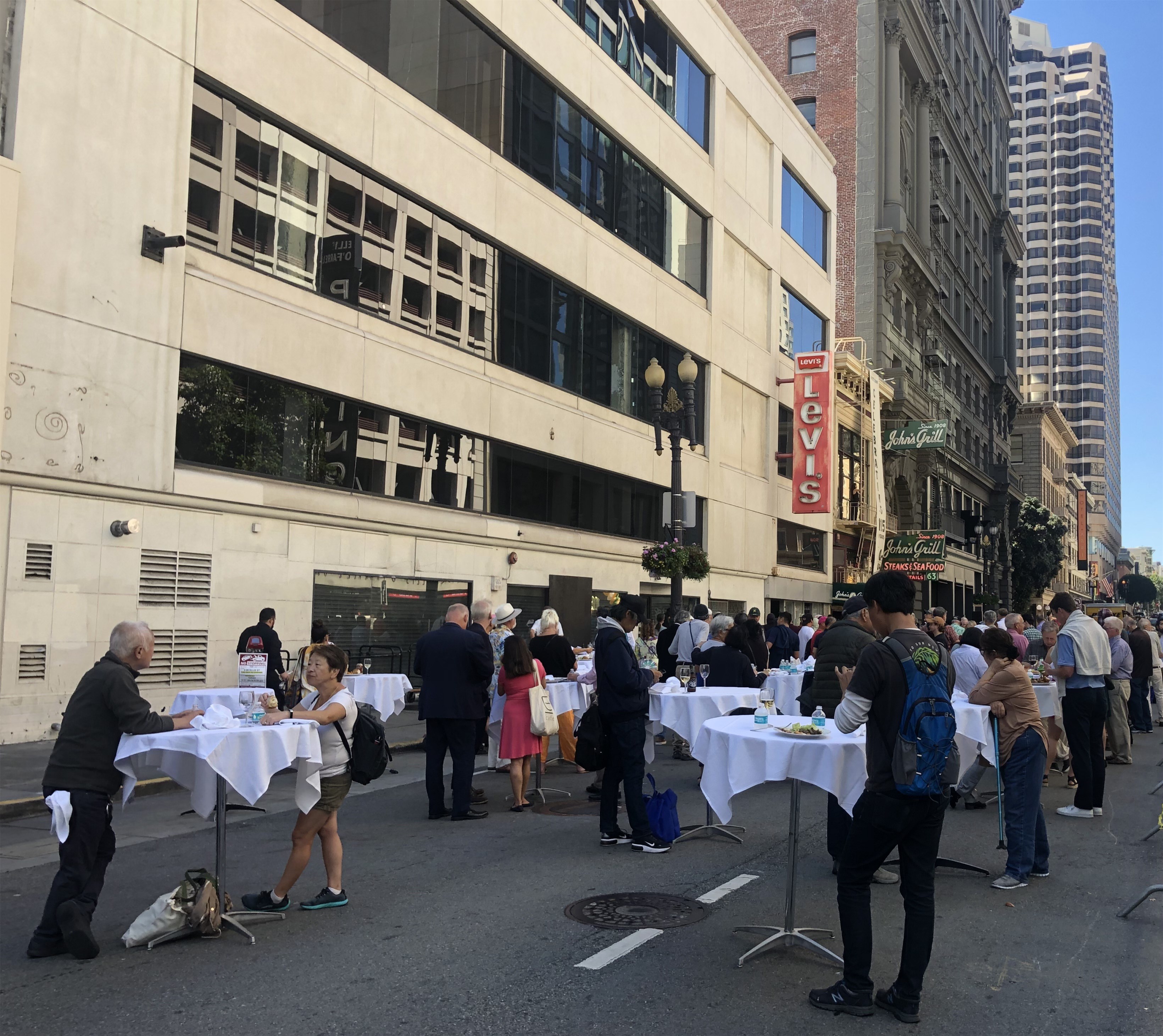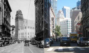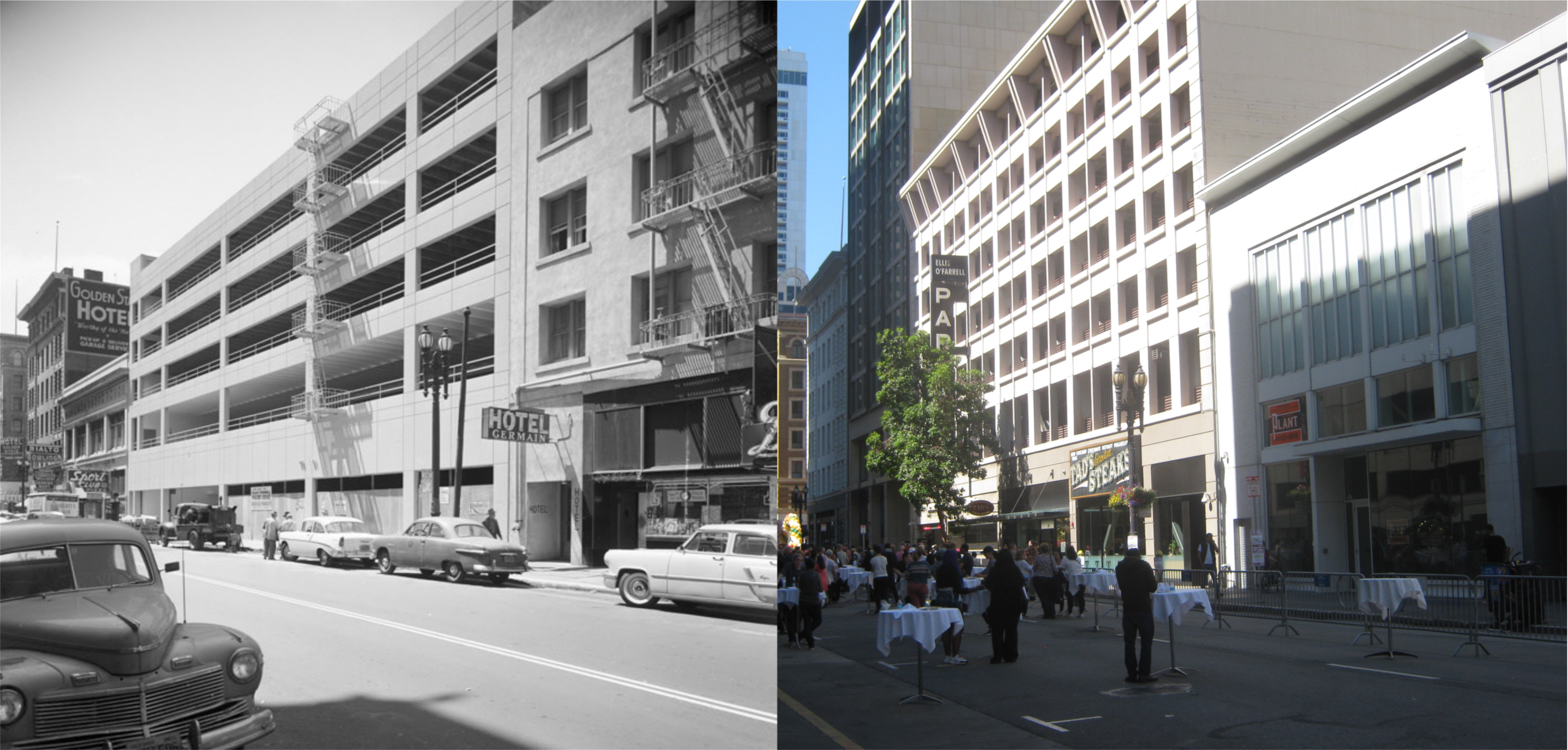 Market Street in front of the Palace Hotel during the early 1960s, when it was known as the Sheraton-Palace Hotel: The clock is still there, but the Pig ‘n Whistle Restaurant on New Montgomery, one of Herb Caen’s most frequented places in San Francisco, is no longer here. (Phil Palmer)