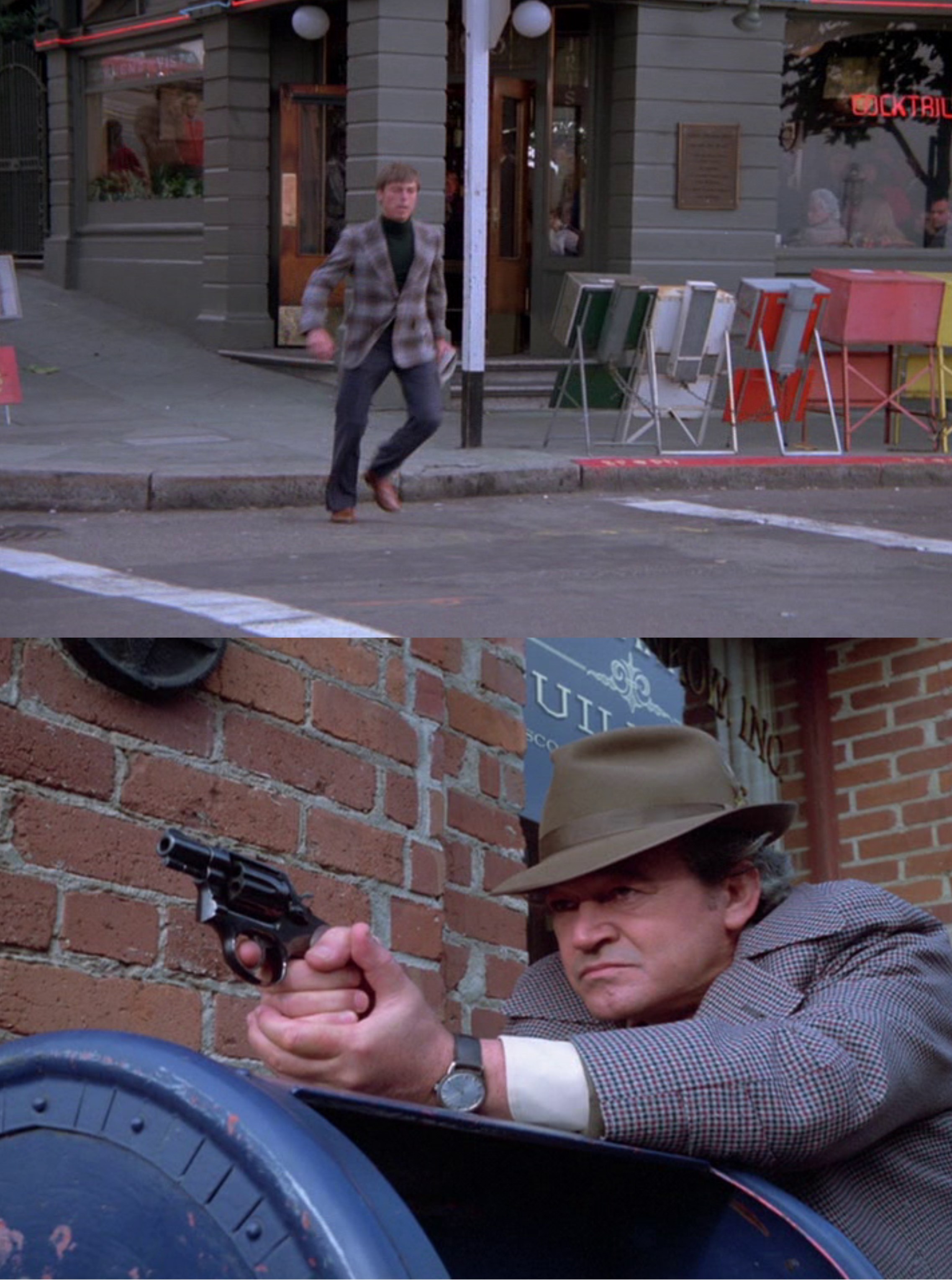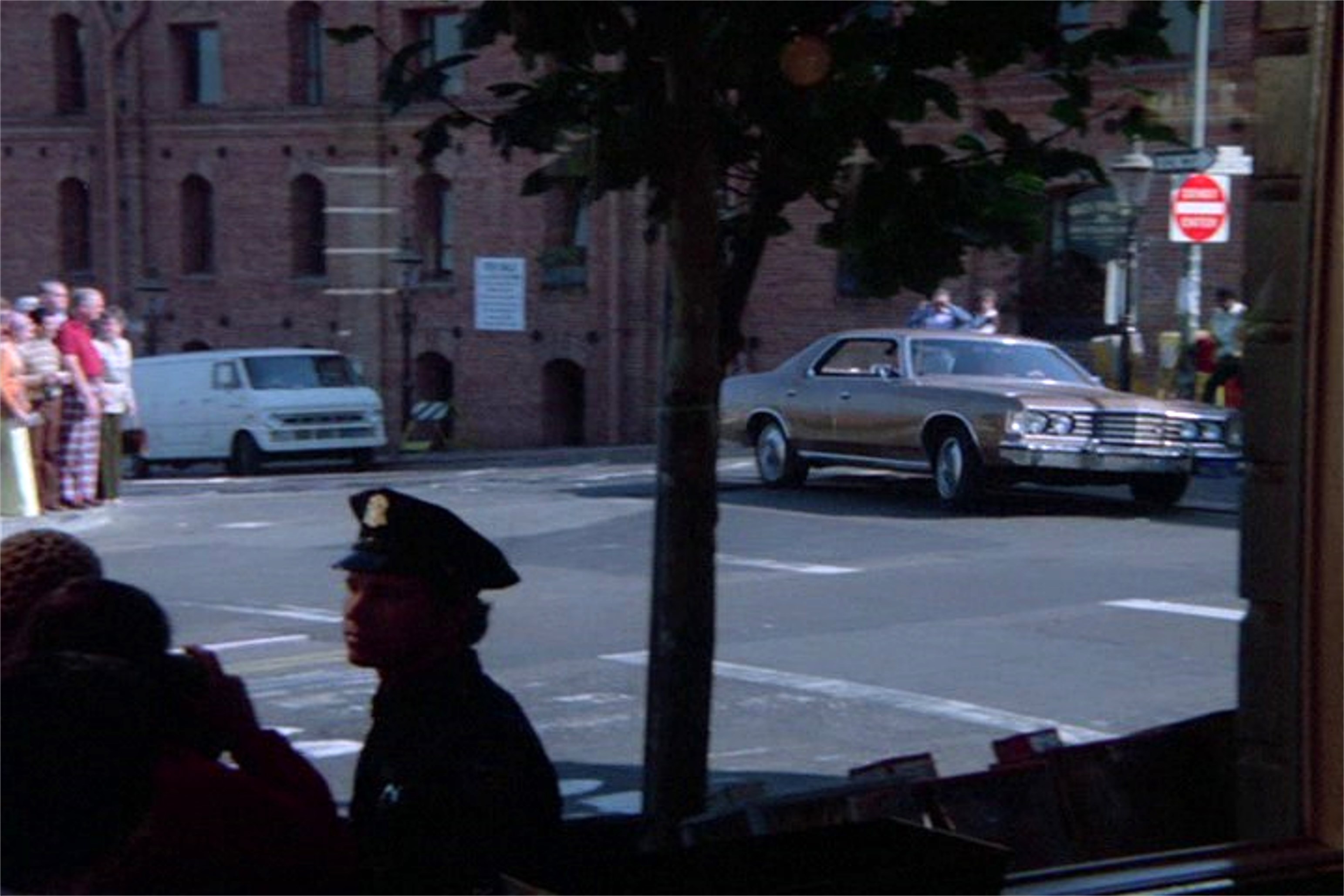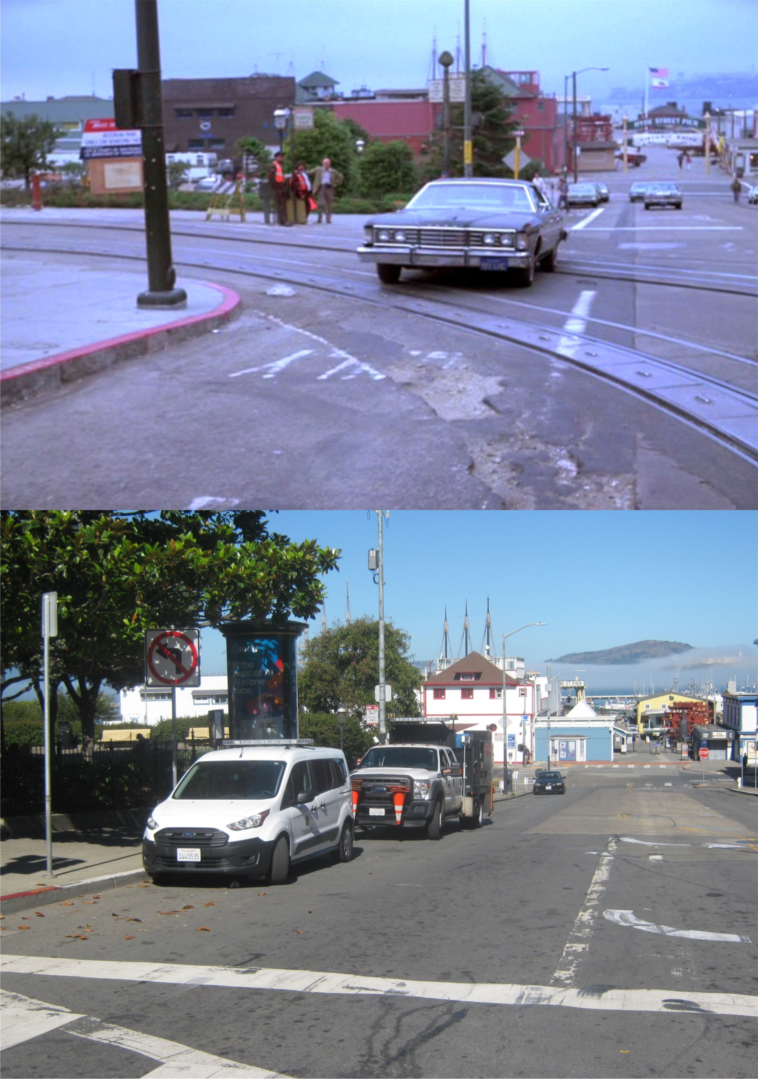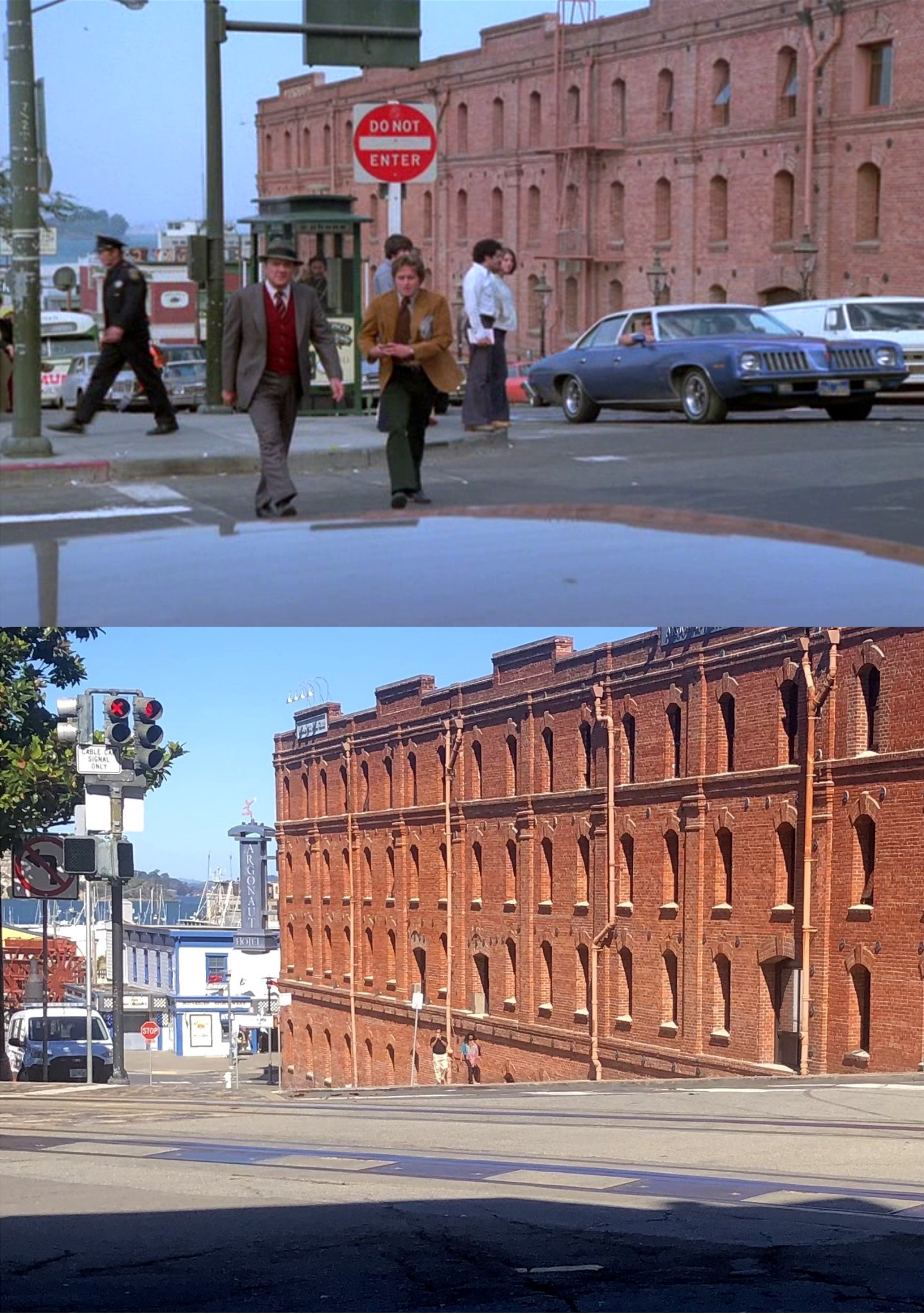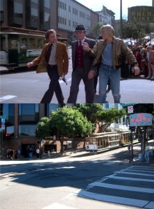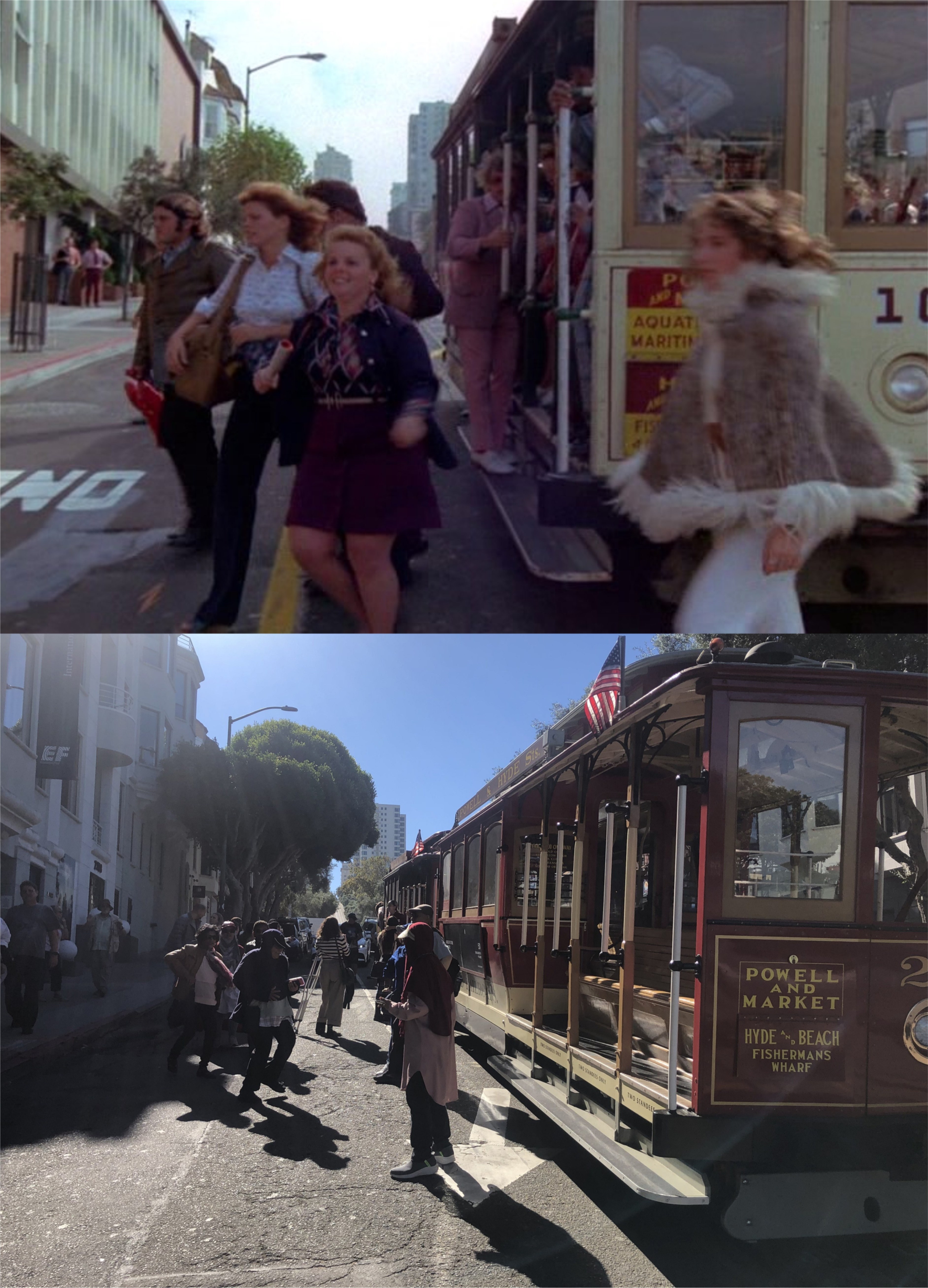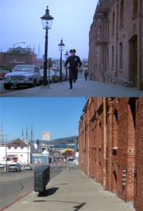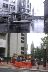 A California Street cable car, pulling up to or leaving from, Market Street on a rainy 1940s day: Cable cars don’t pull all of the way up to Market Street anymore, so I couldn’t get much of the Southern Pacific Building, on the right, in my picture.