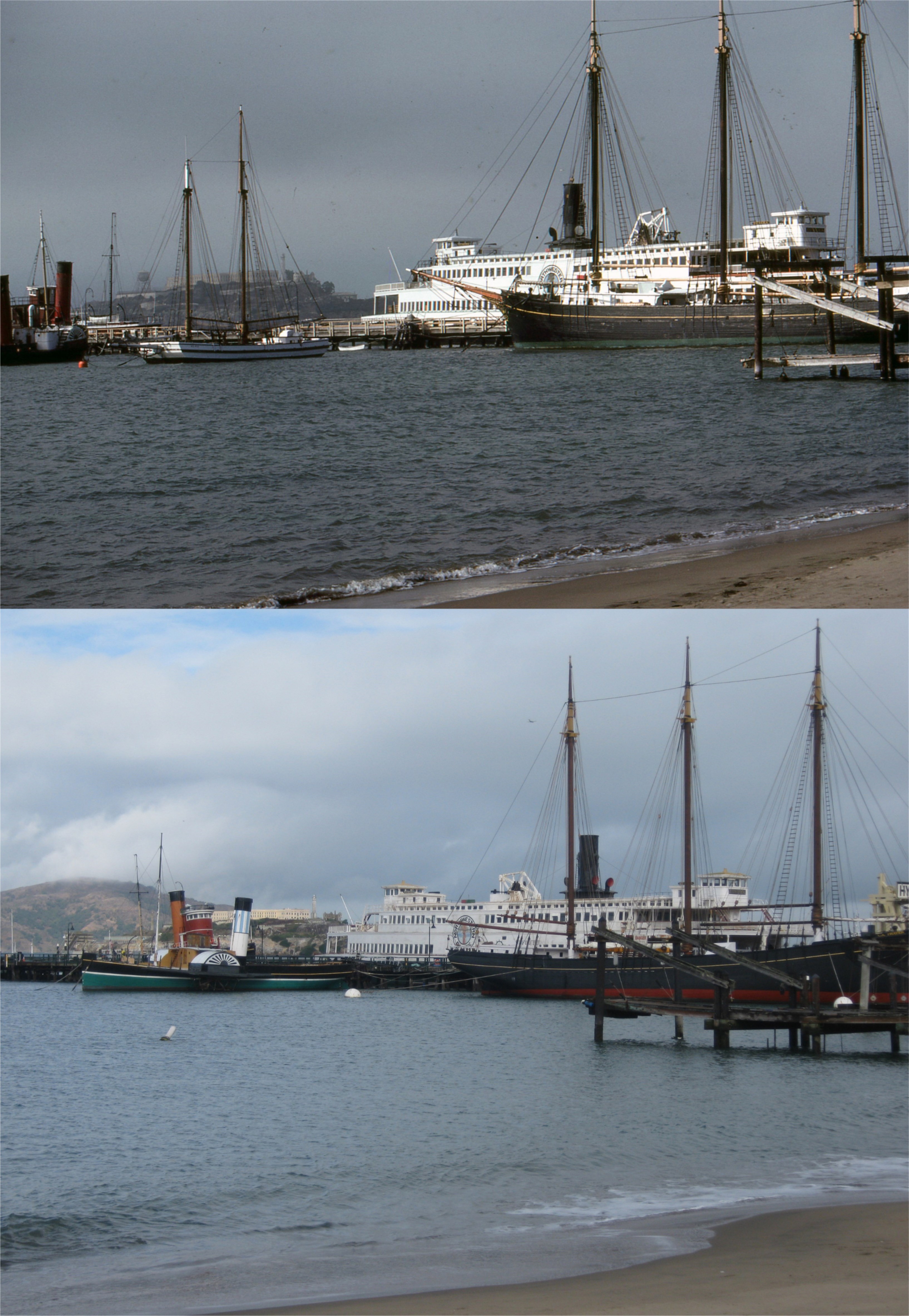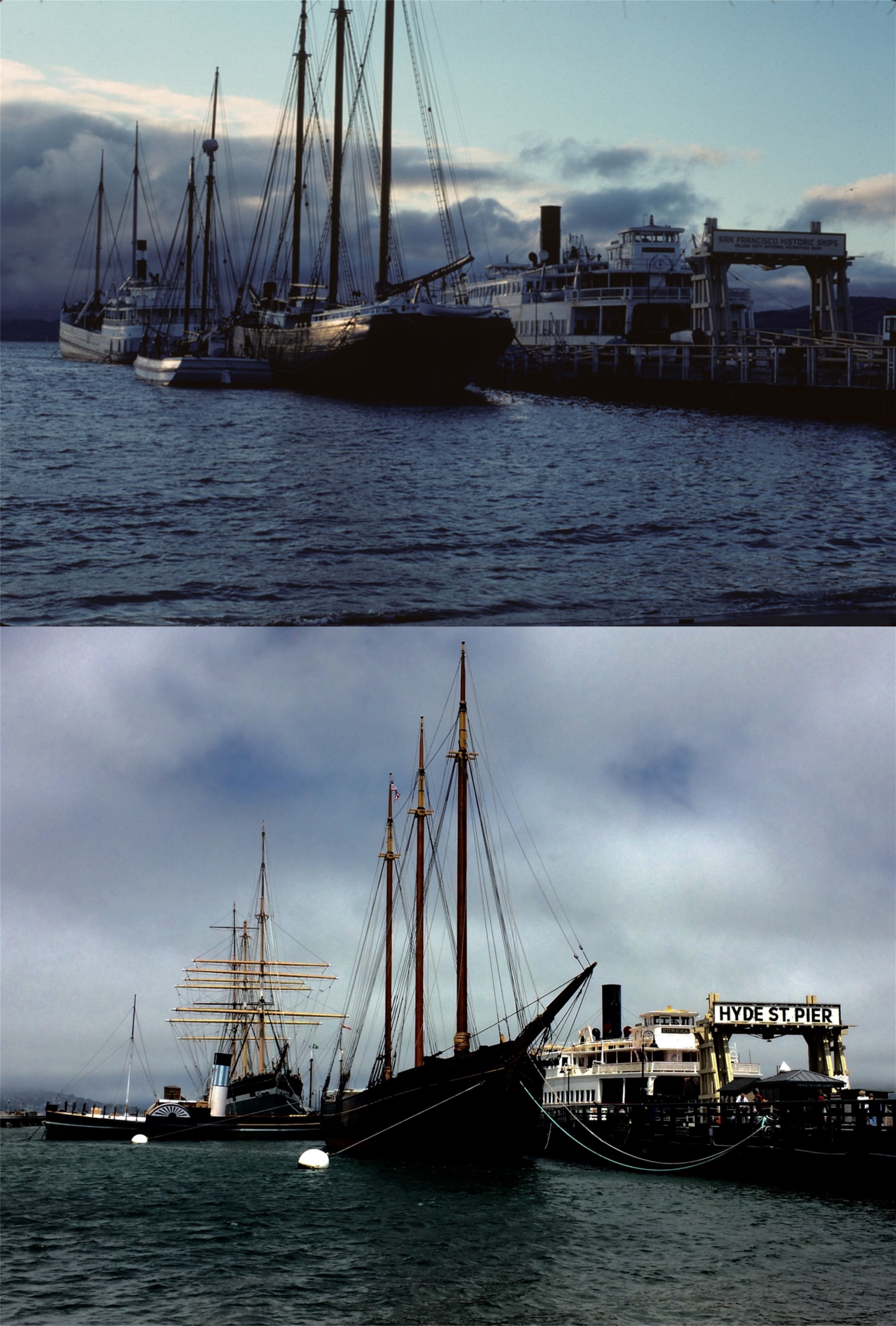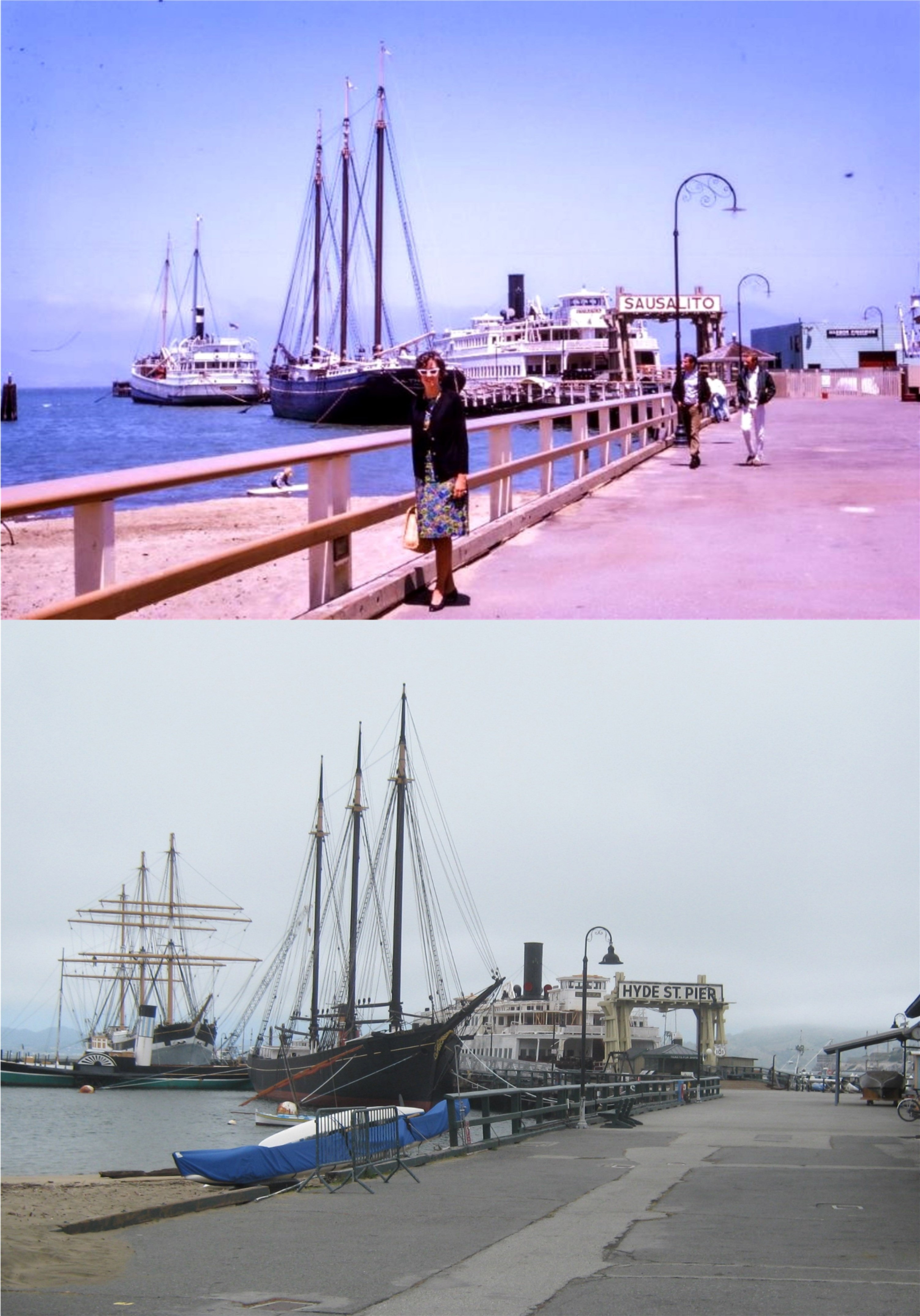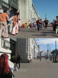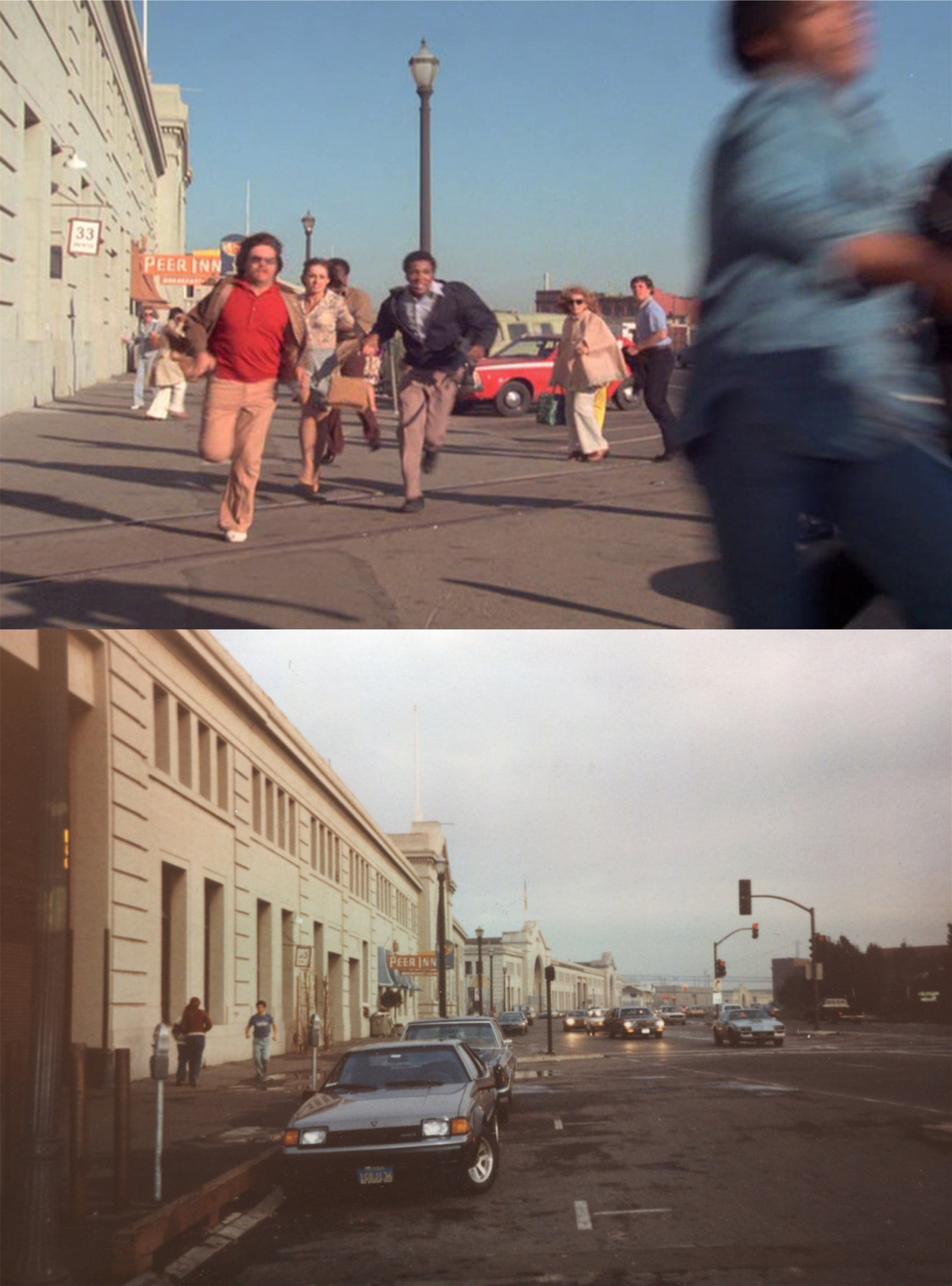 As the terrorists run along the Embarcadero, you can see the old Pier Inn Cocktail Lounge between Piers 33 and 35 in the background. They bottom picture with the Pier Inn in the background is a snapshot I took on a rainy late afternoon in the late 1980s.