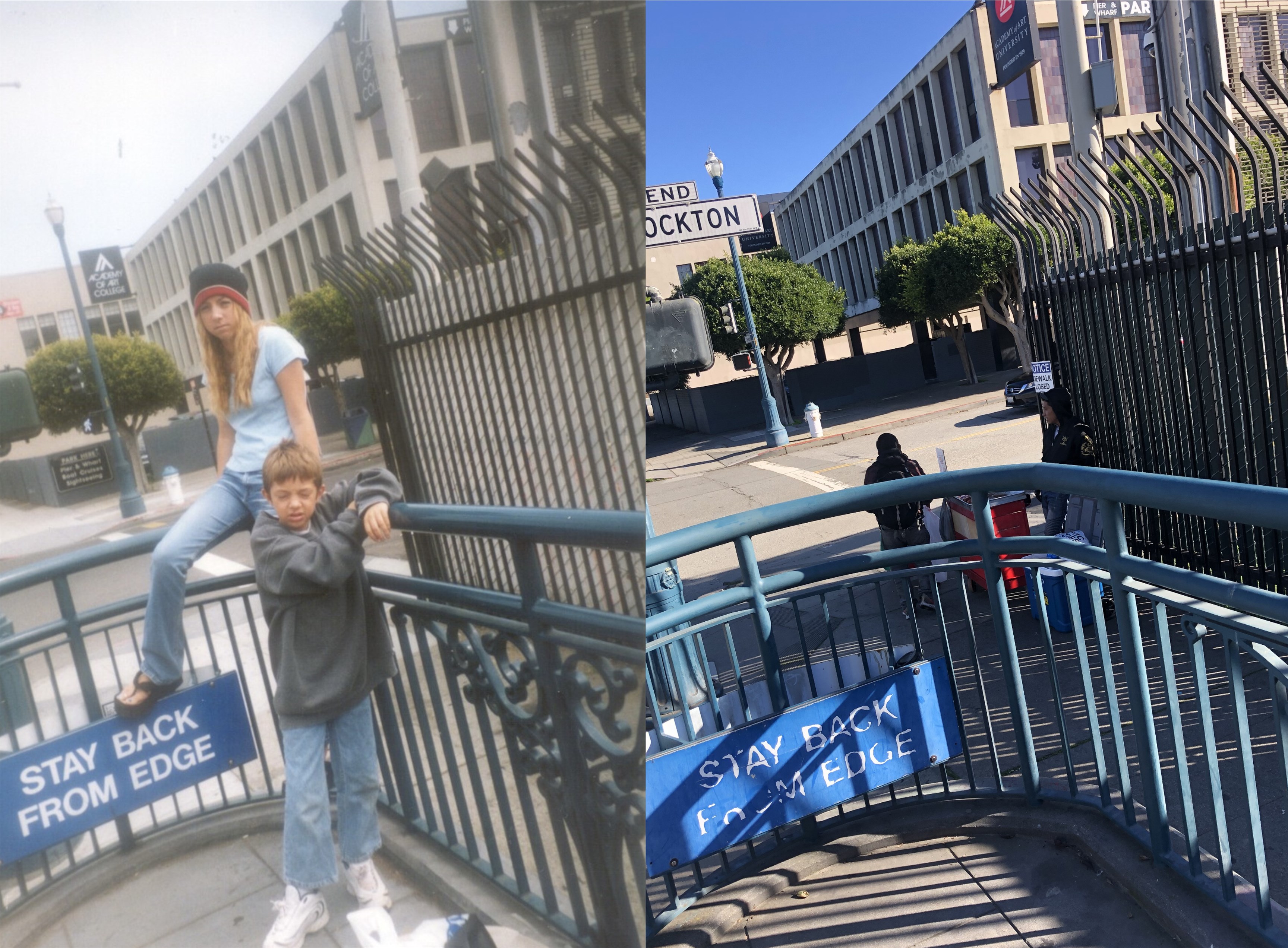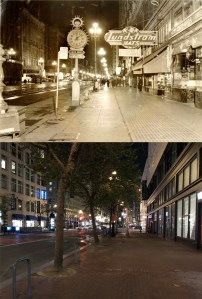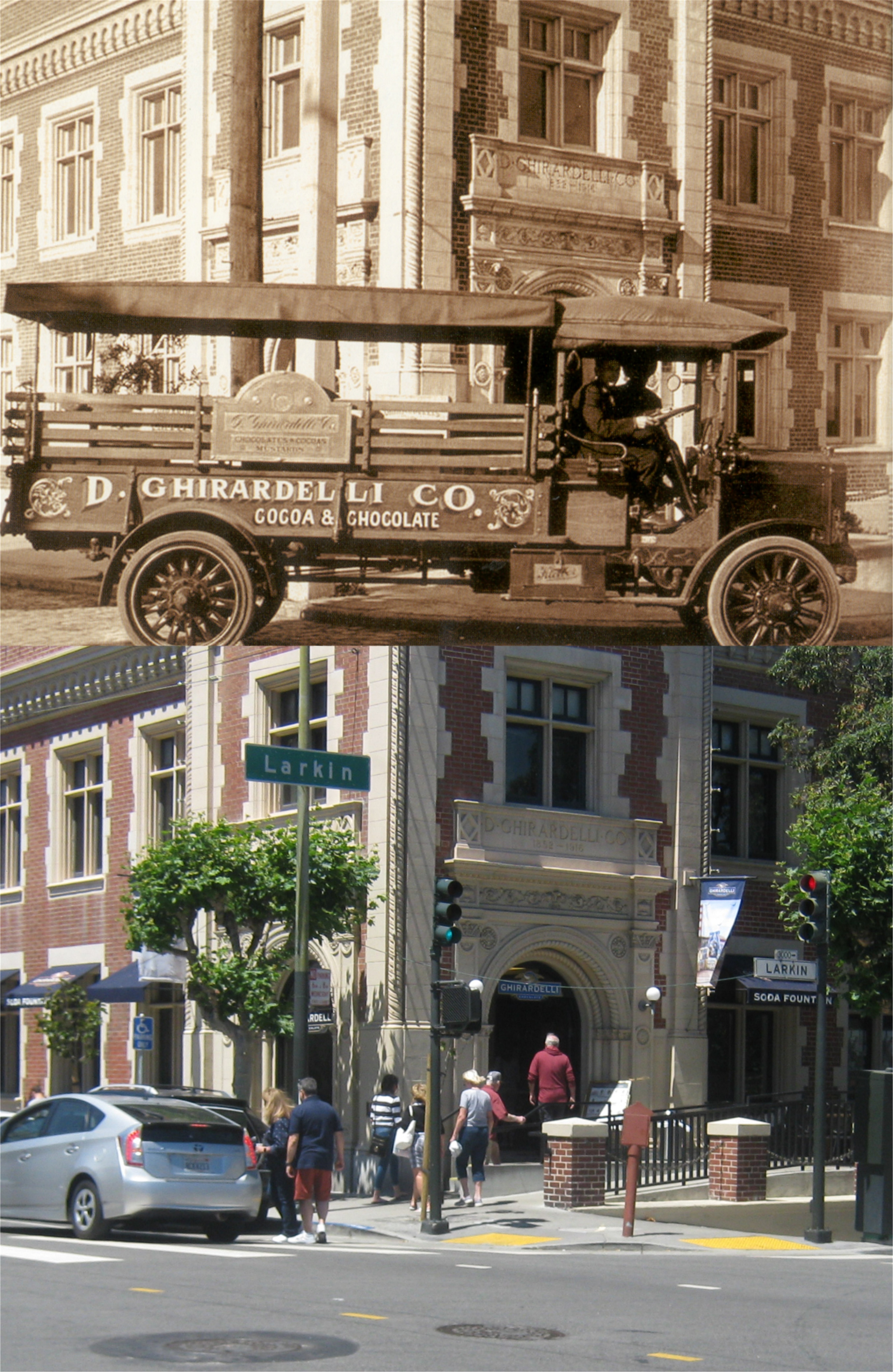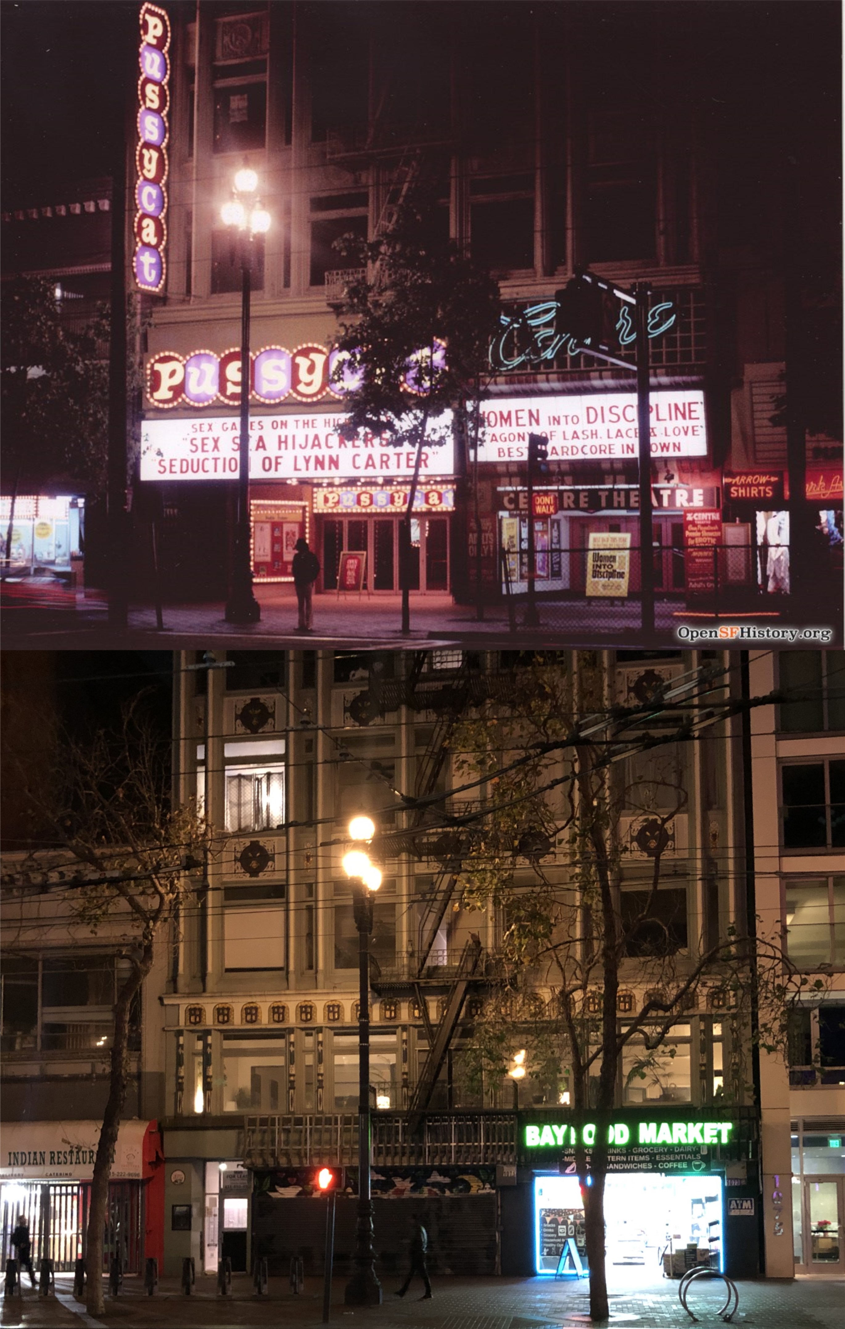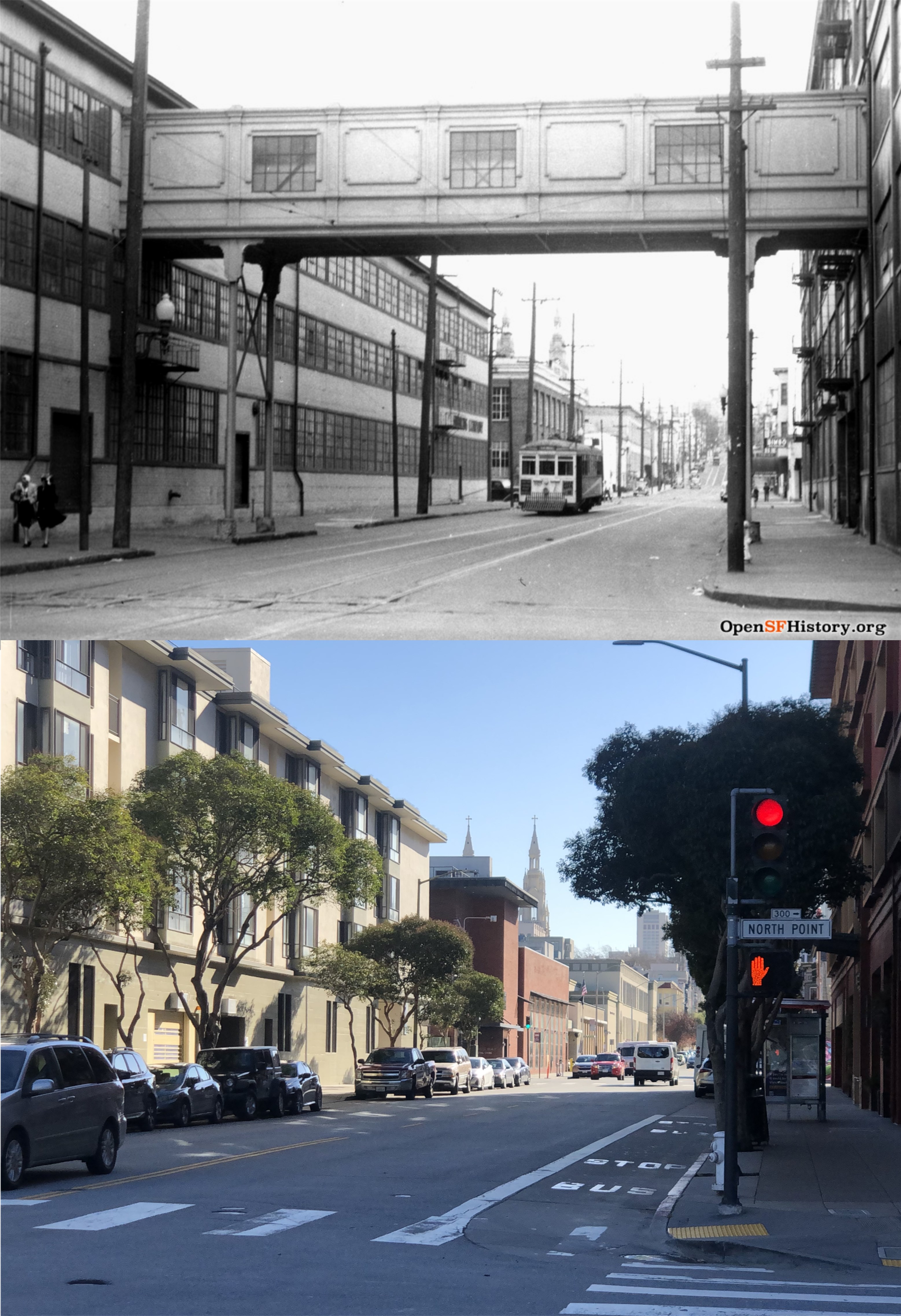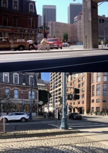 The pursuit continues south underneath the Embarcadero Freeway. Their van crashes into a pile of boxes on the corner of Mission Street and the Embarcadero at the old Audiffred Building.