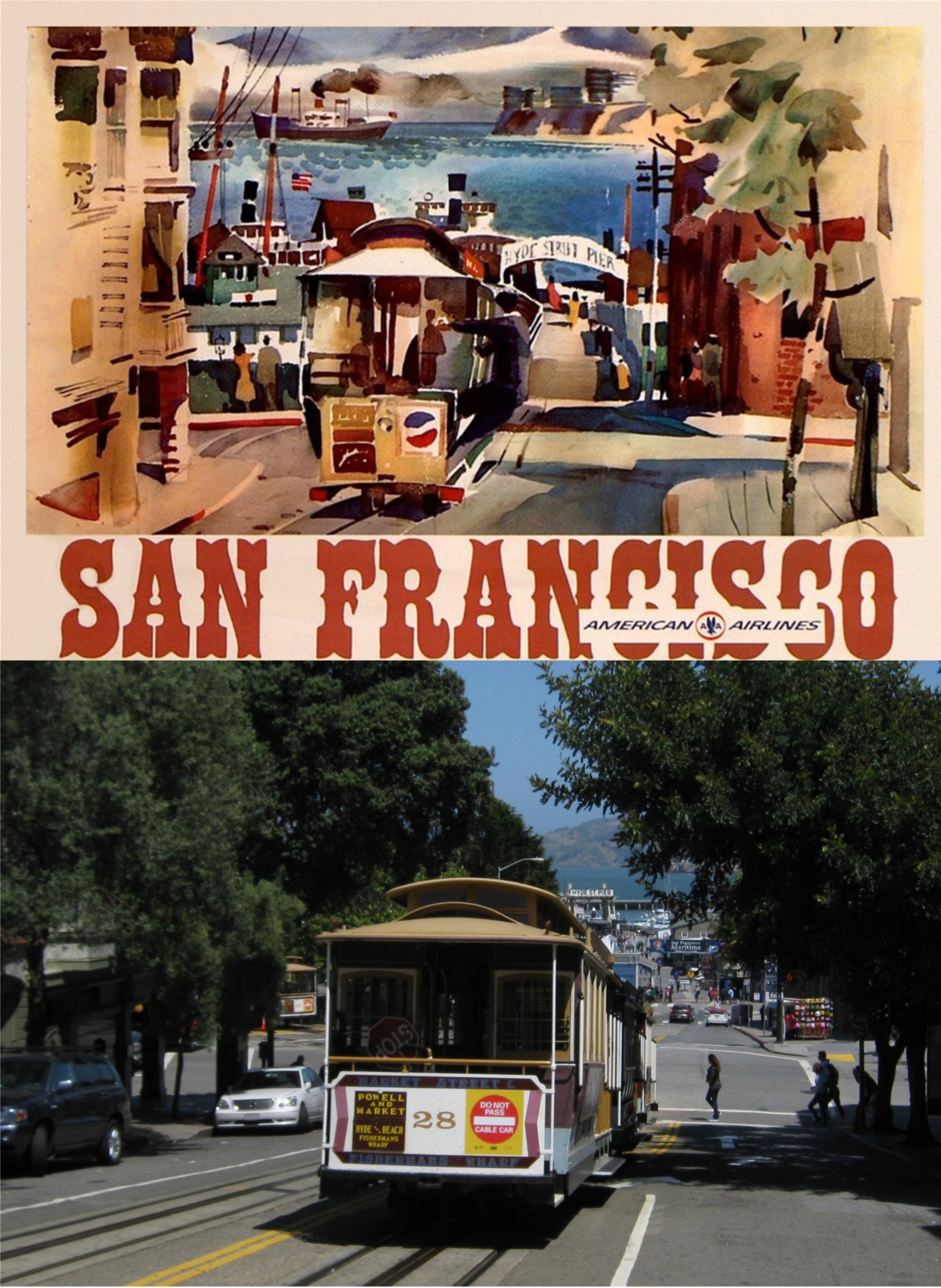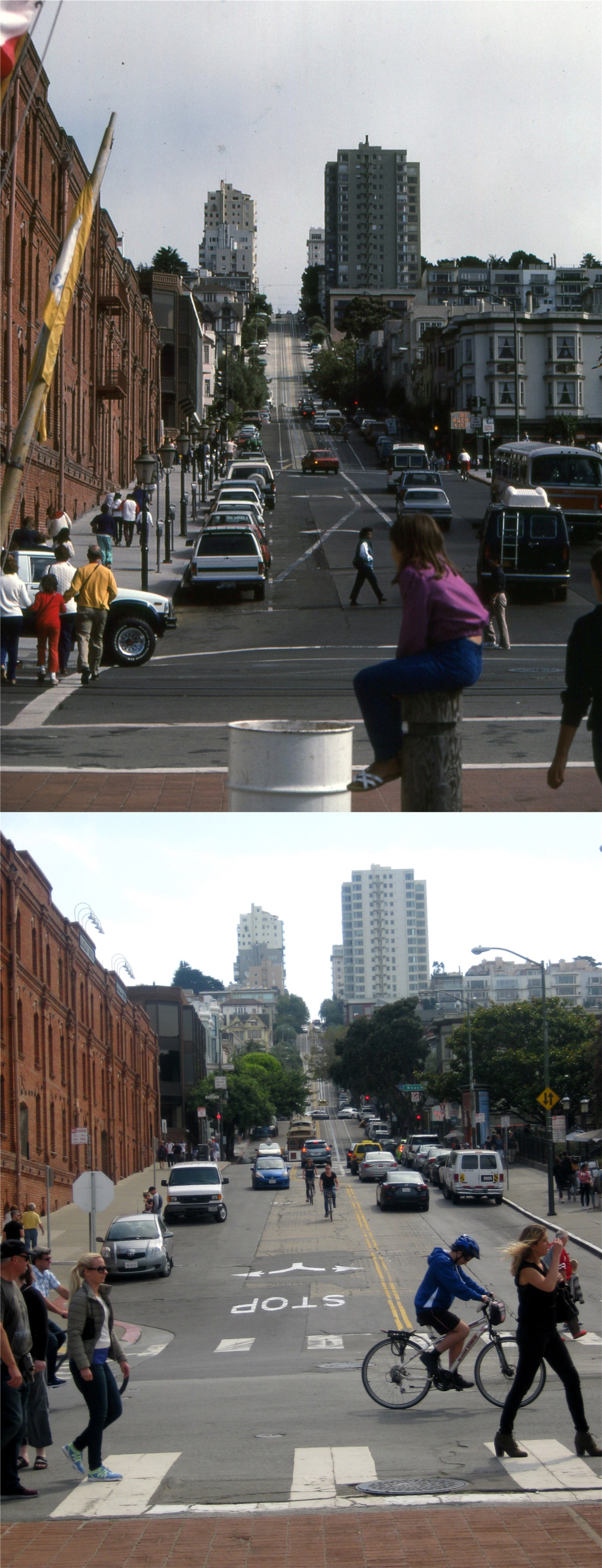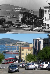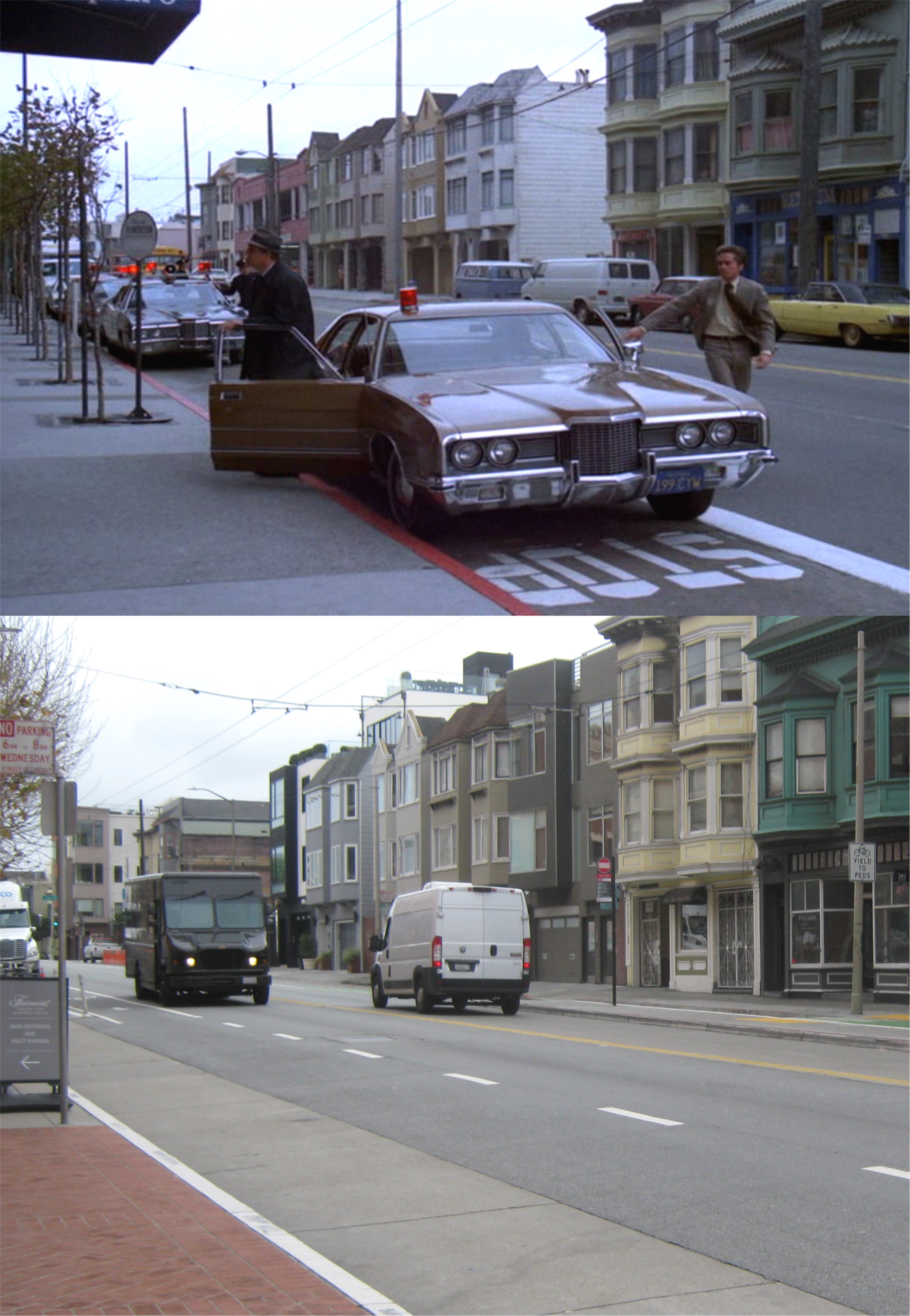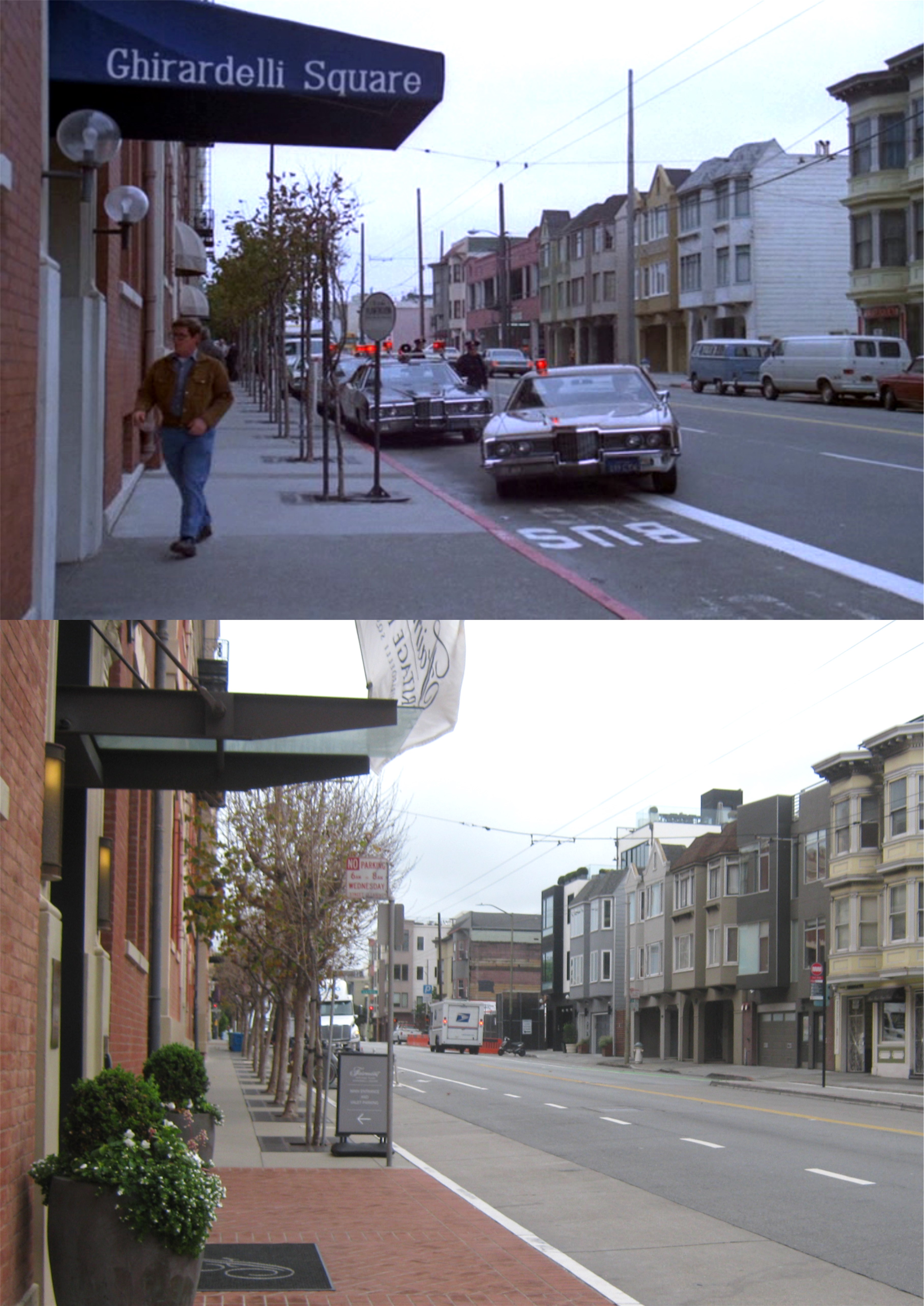 The criminals jump into a red van and head down the Embarcadero followed by multiple police cars, including Stone and Keller. In this three set you can see the now gone Piers 37 and 39 in the upper right of the top photo. In the middle picture you can see the mast of the sailing ship, the Balclutha when it was berthed at Pier 43 on the far right.