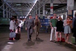The bad guys (and girl) try to smuggle their explosive cameras past customs, but an alert agent smells a rat. When he motions an armed guard to come over, the terrorists make a break.