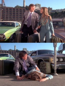 As the terrorists make their break, they grab some hostages. Yeah, they did that in 1974 too. The girl is the one we saw inside Pier 35.