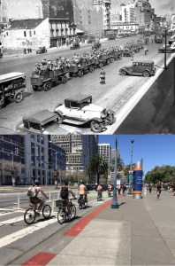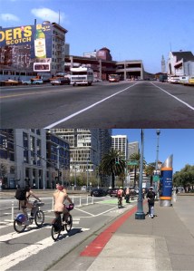 The riders circled Rincon Park and headed north on the Embarcadero. My picture was taken at the tail end of the ride. I’m getting very awkward with my sentences! The top picture is a close comparison from a 1972 episode of the television show ‘The Streets of San Francisco’. The YMCA Building is in the background of both photos; to the left of the Winnebago is the old Seaboard Hotel, scene of the attempted assassination in near the beginning of the 1968 film classic ‘Bullitt’.