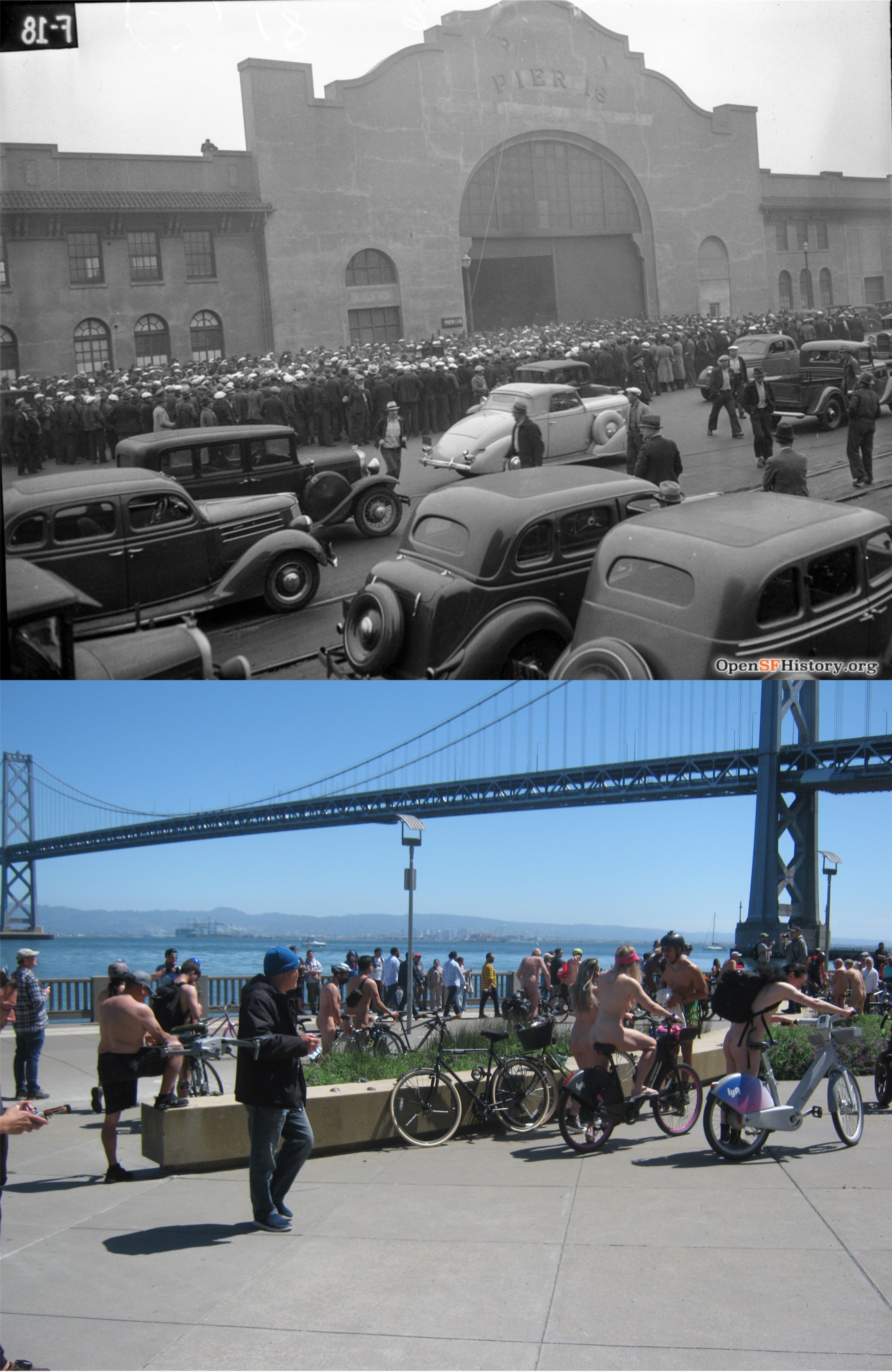 While recovering from one of the most stressful income tax filing seasons, (I’m getting too old for this job, and don’t I know it) I headed over to the Embarcadero last weekend to take in some of the scenery (!) They were staging another ‘Naked Bike Ride’ that started from Rincon Park, south of the Ferry Building. The last time I saw one of these was, I think, 2012, and I was glad to see that I wasn’t the only one who’s gotten more out of shape since then. Rincon Park stretches from Howard Street to Folsom where the old Piers 16, 18 and 20 used to be. Like the rest of the Embarcadero, this area used to be bustling with waterfront activity long past. (Thumbnail images)