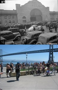 About the middle of Rincon Park here is where they starting taking off from. (Another poor choice of words) Right about here was where Pier 18 was. The vintage picture was taken in September of 1937, during a labor dispute by teamsters that didn’t get as out of hand as the 1934 issue, but other photos from the opensfhistory.org website show that it was getting pretty scary.