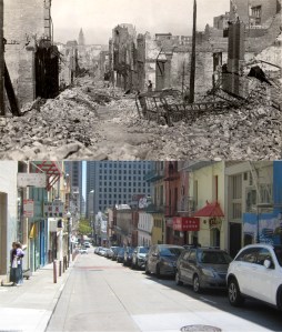 Commercial Street, looking down from Grant Avenue after the 1906 Earthquake and Fire: (UC Berkeley Library Archives)