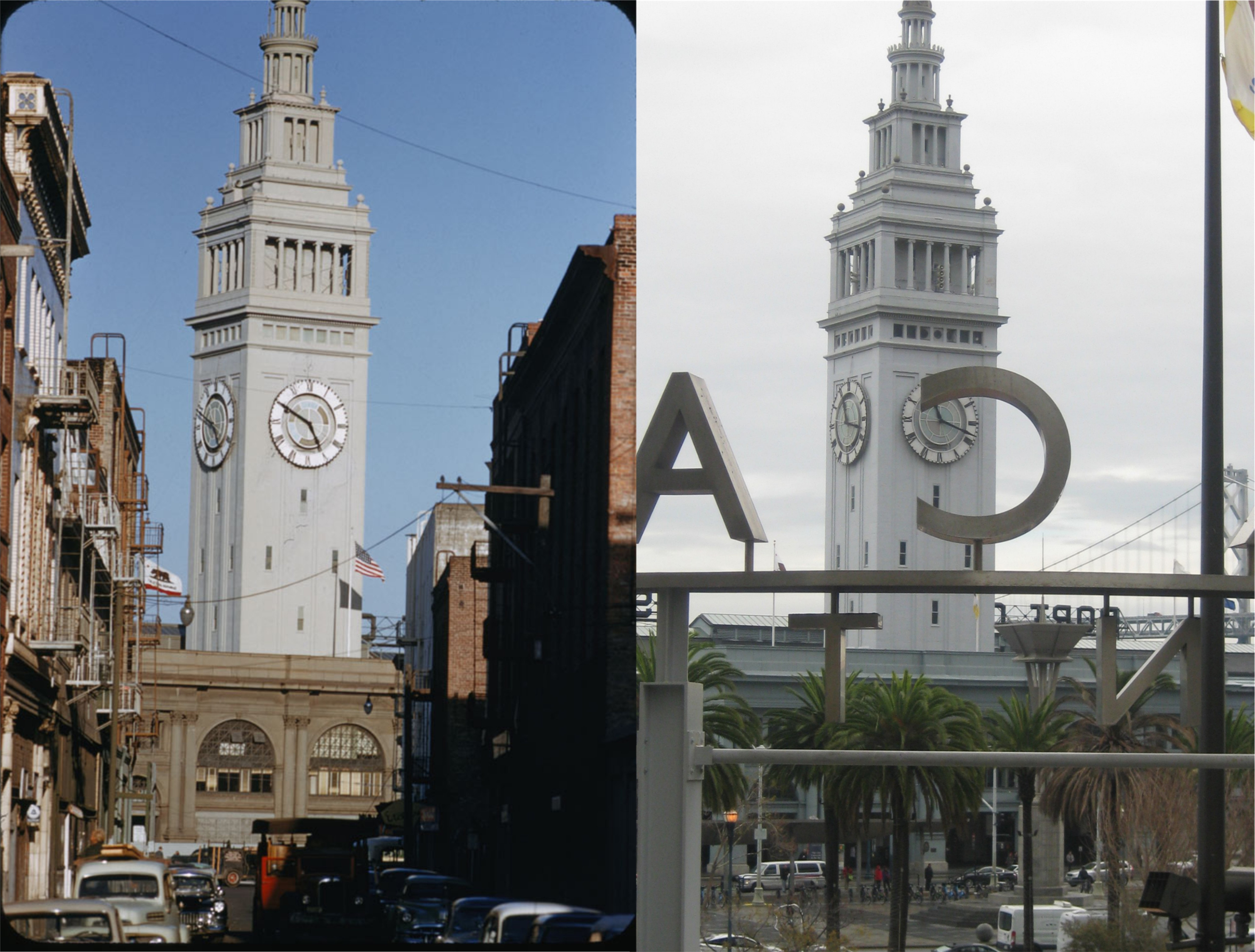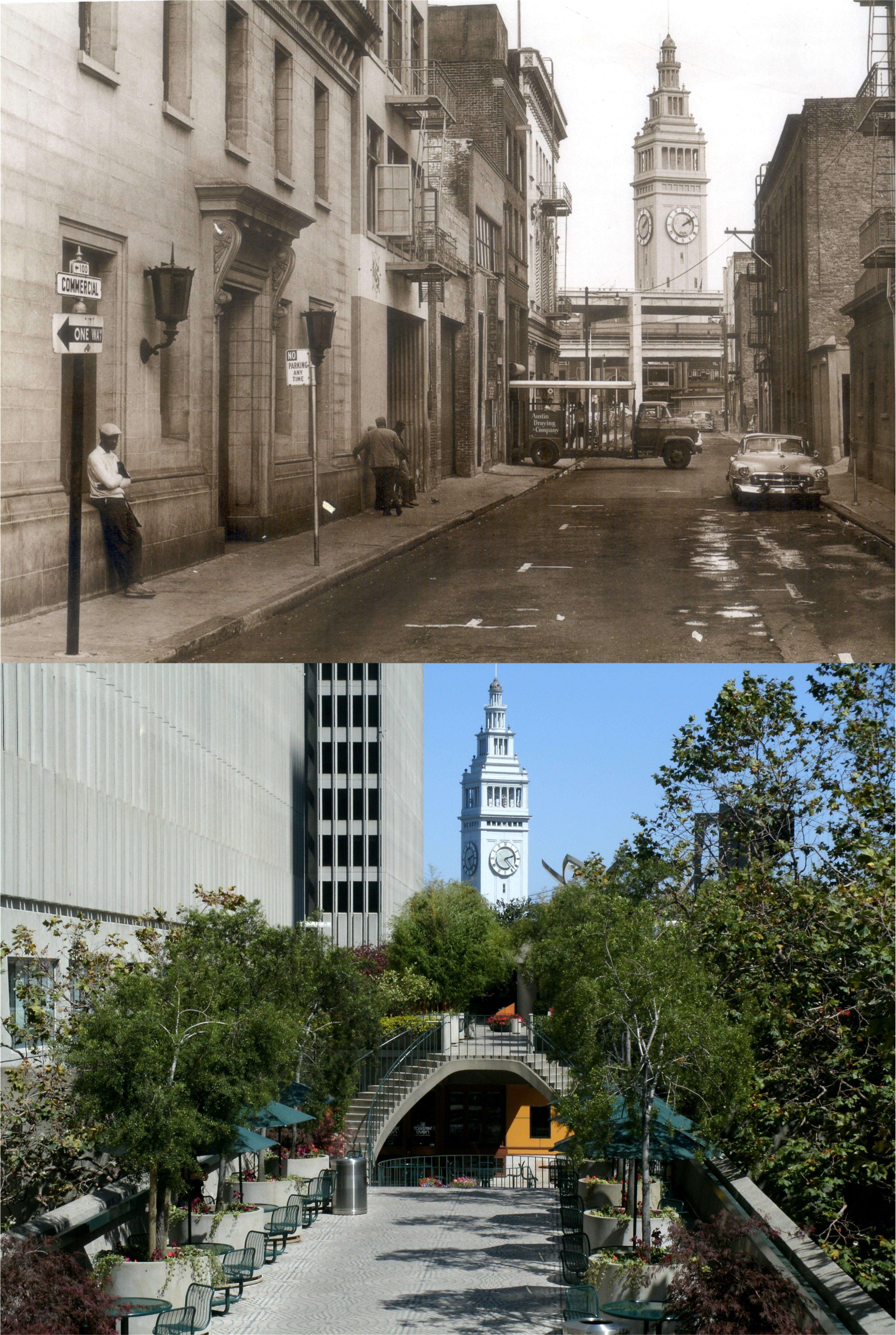 This is where Commercial Street emptied into the Embarcadero before the Embarcadero Center was build. The vintage picture is from the Charles Cushman Archives.