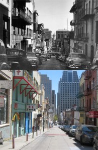 Commercial at Sansome Street in 1959: If you look hard enough….. you’ll notice that you can’t see the Ferry Building from here anymore. Actually, you probably still could if it wasn’t for that tree that they seemed to be so fascinated by in last Sunday’s picture. (opensfhistory.org)