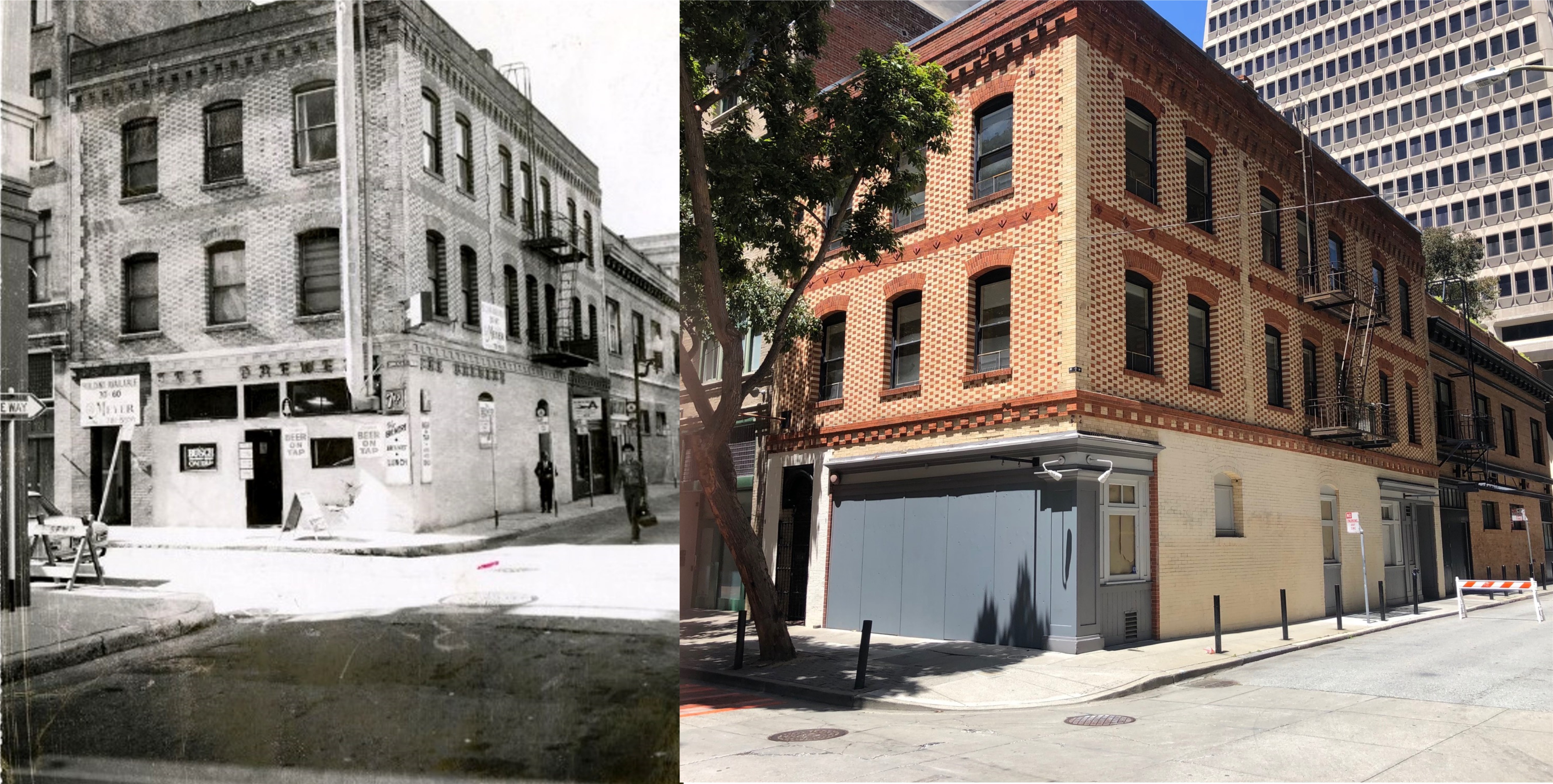 An undated picture of an old brewery on Commercial at Leidesdorff Street, taken before the Transamerica Pyramid Building the background was constructed in 1972: (San Francisco Public Library Archives)
