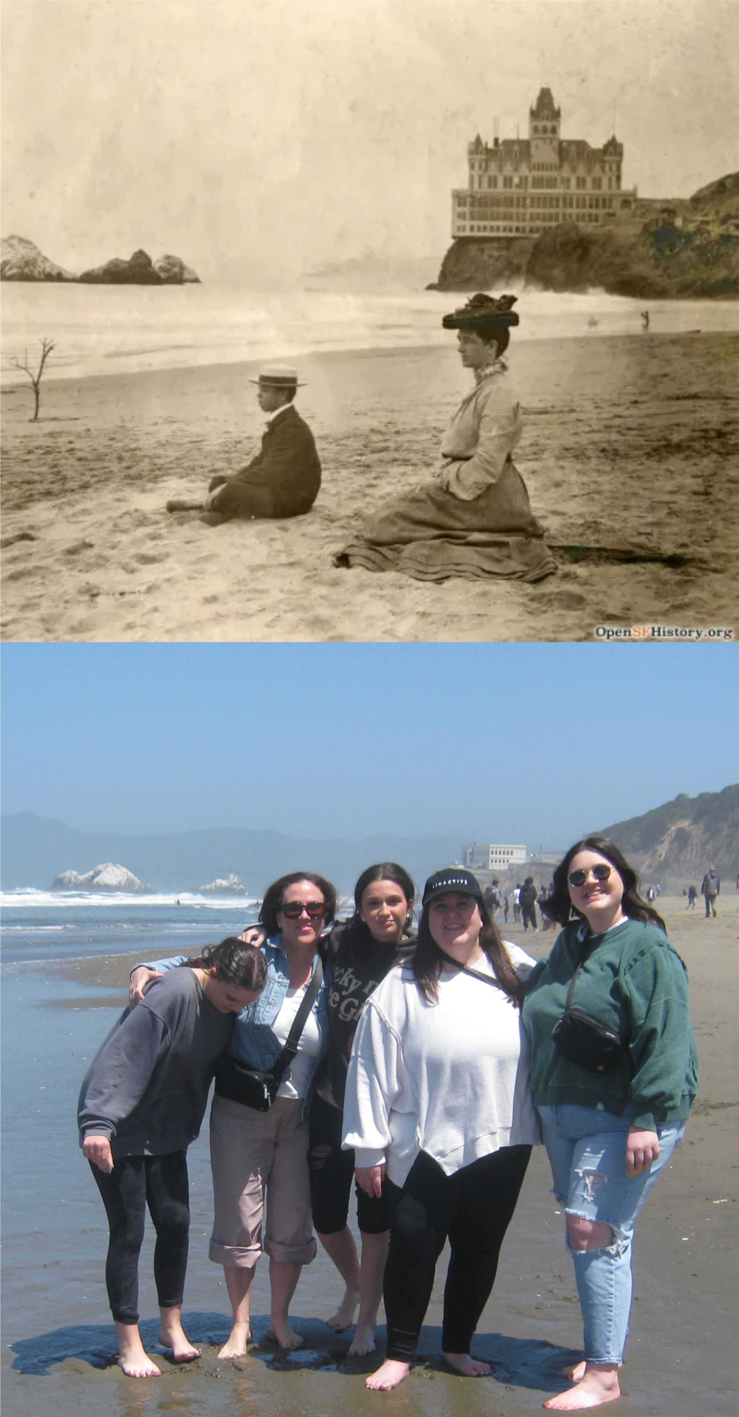Now we’ve reached what used to be the 100 block of Commercial Street. The Embarcadero Freeway is in the background of the vintage picture from Nancy Olmsted’s book ‘Ferry Building: Witness to a Century of Change’.