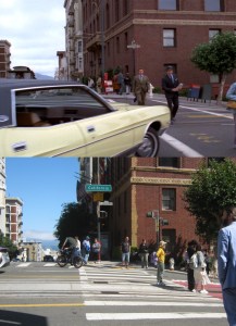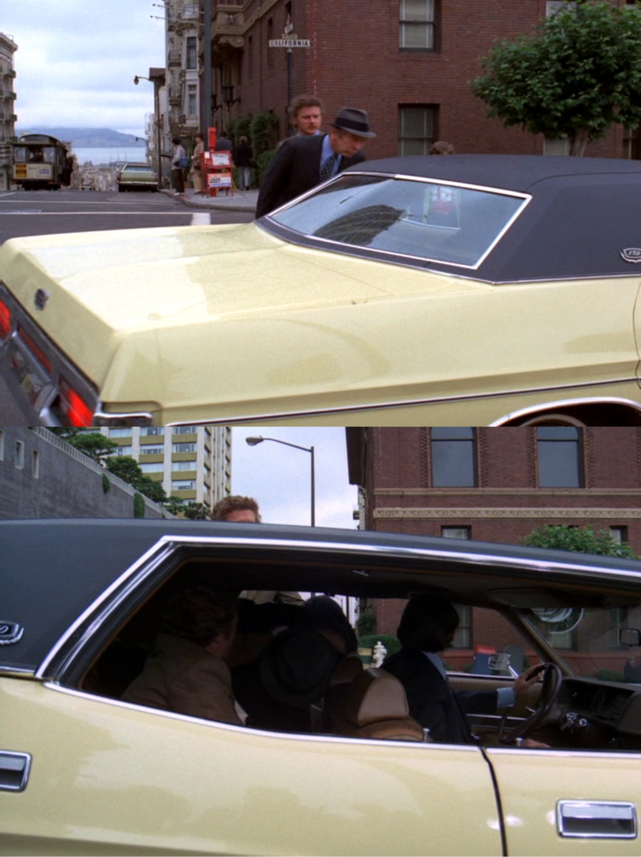 And now, to the main Joice Street story. I did a post in 2018 that covered, in part, what I think was one of the best episodes from the 1970s TV show ‘The Streets of San Francisco’ entitled ‘In the Midst of Strangers’ that showed part of, but not the actual murder on Joice Street, of a cable car passenger. Here’s the set up. The fellow in the hat holding a newspaper has just gotten off of a cable car and is crossing California Street south on Powell Street, followed behind him by the man in the tan suit who knows that he’s carrying a lot of money. The passengers in the yellow car are accomplices of the thug following the cable car passenger.