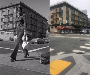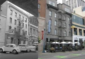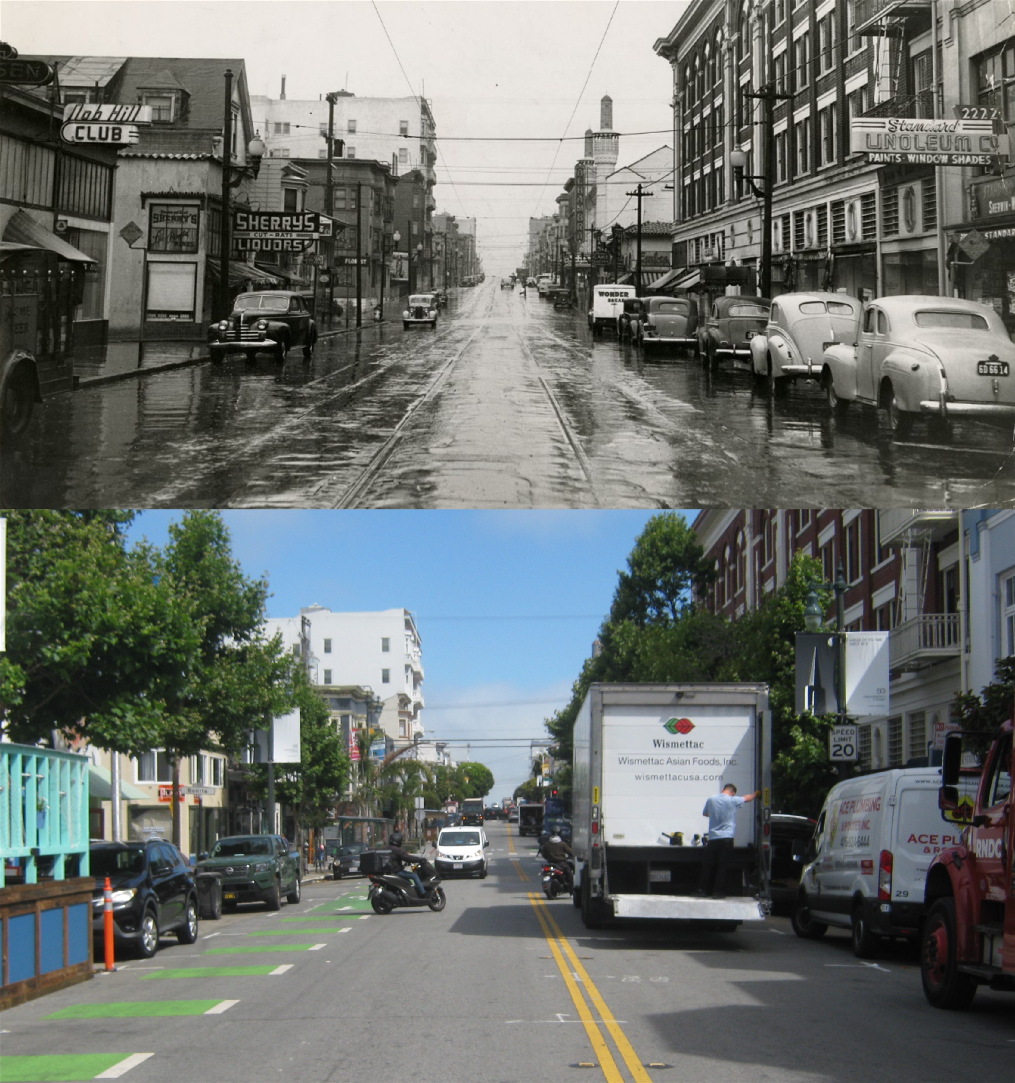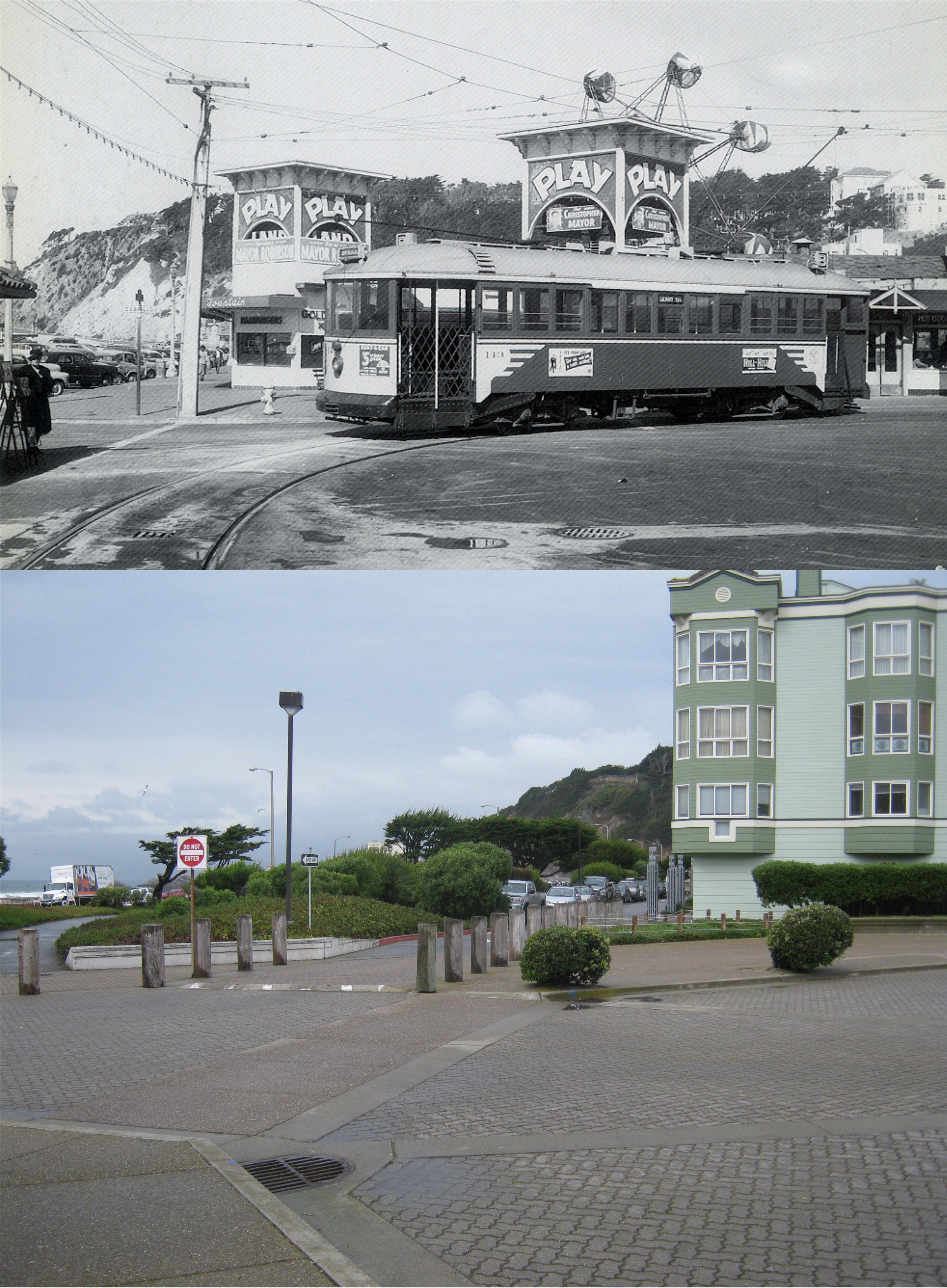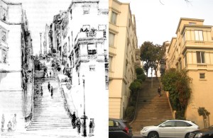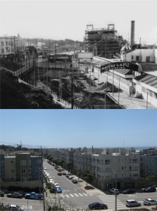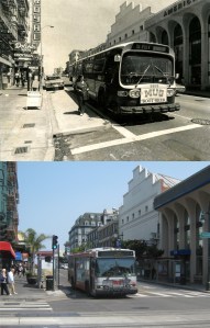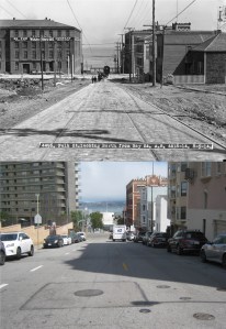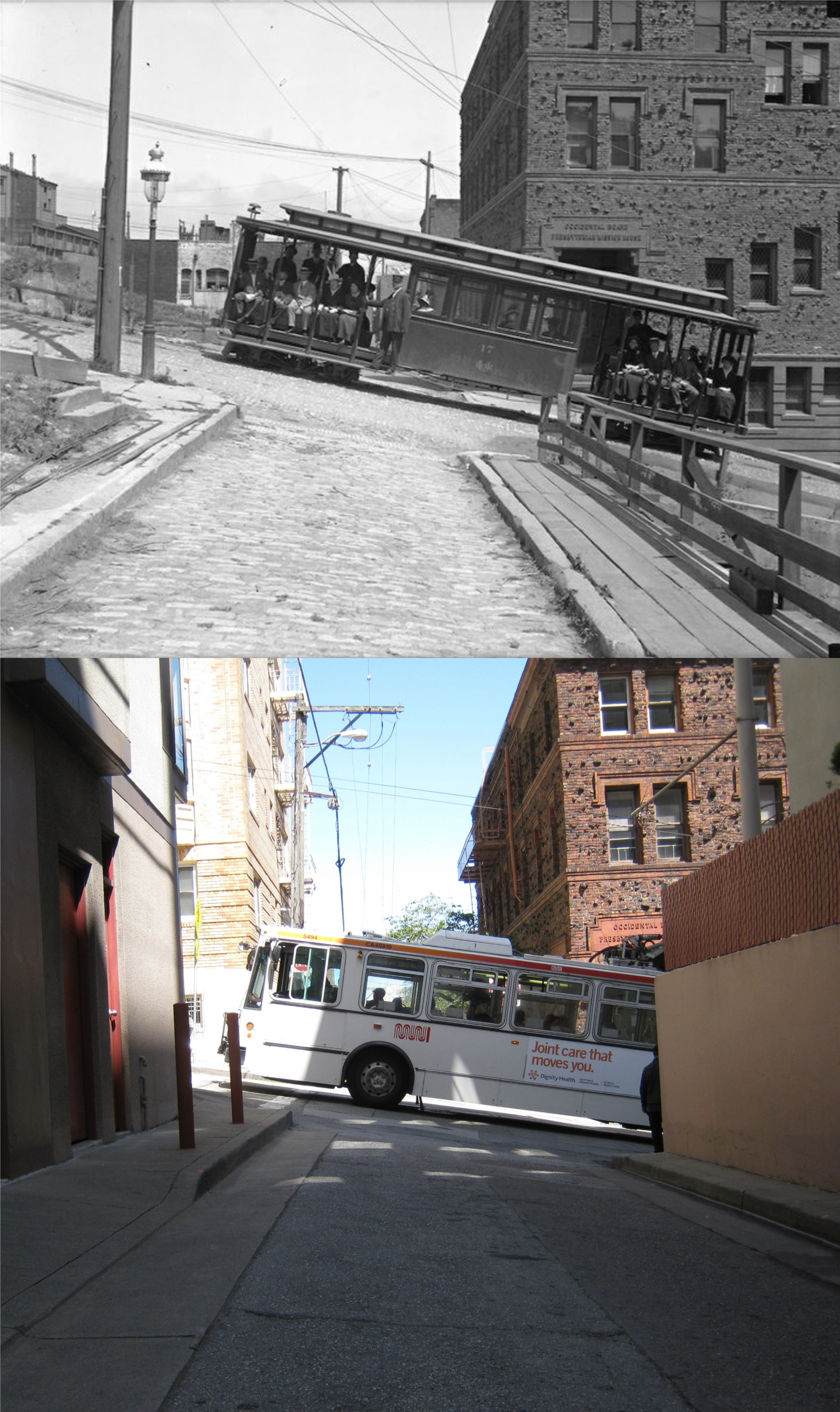 Believe it or not, I wasn’t trying to line this bus up with the cable car in the older photo, taken from Joice Street looking toward Sacramento Street, but the MUNI #1 came by at just the right time to make a nicer comparison. The Cameron House is on the right in both photos.