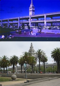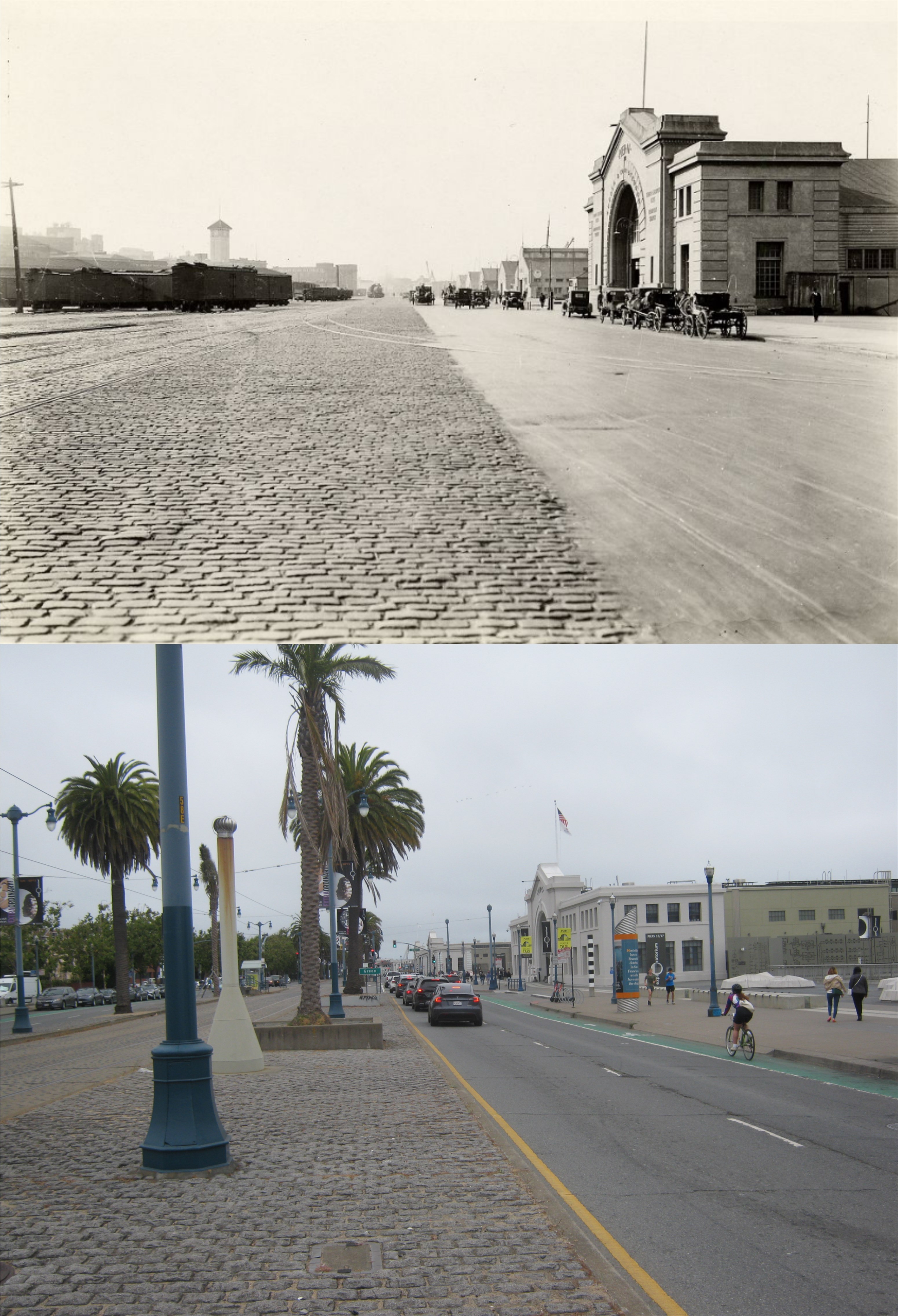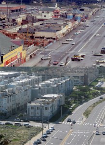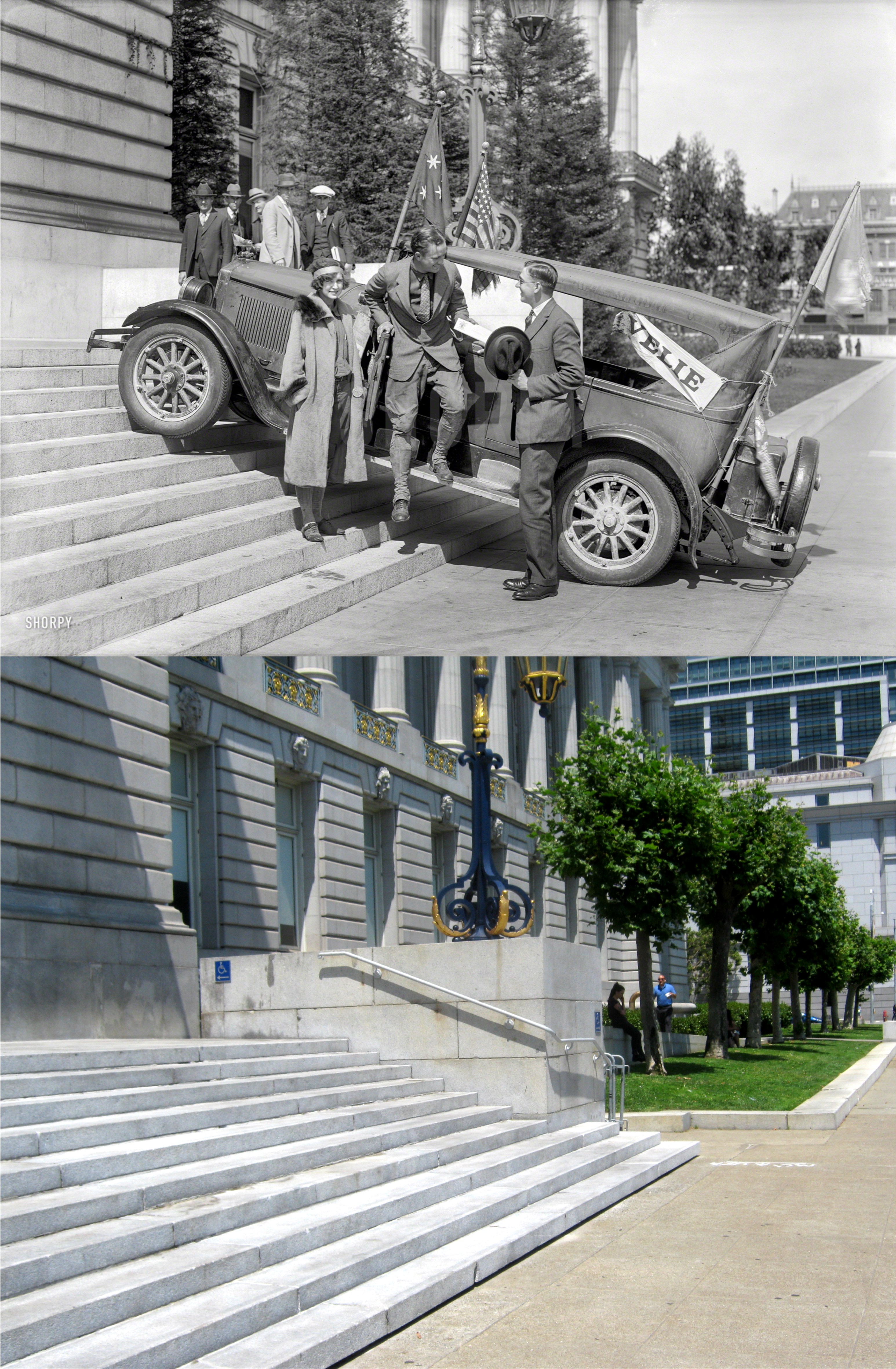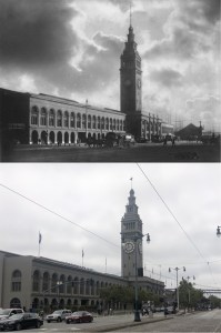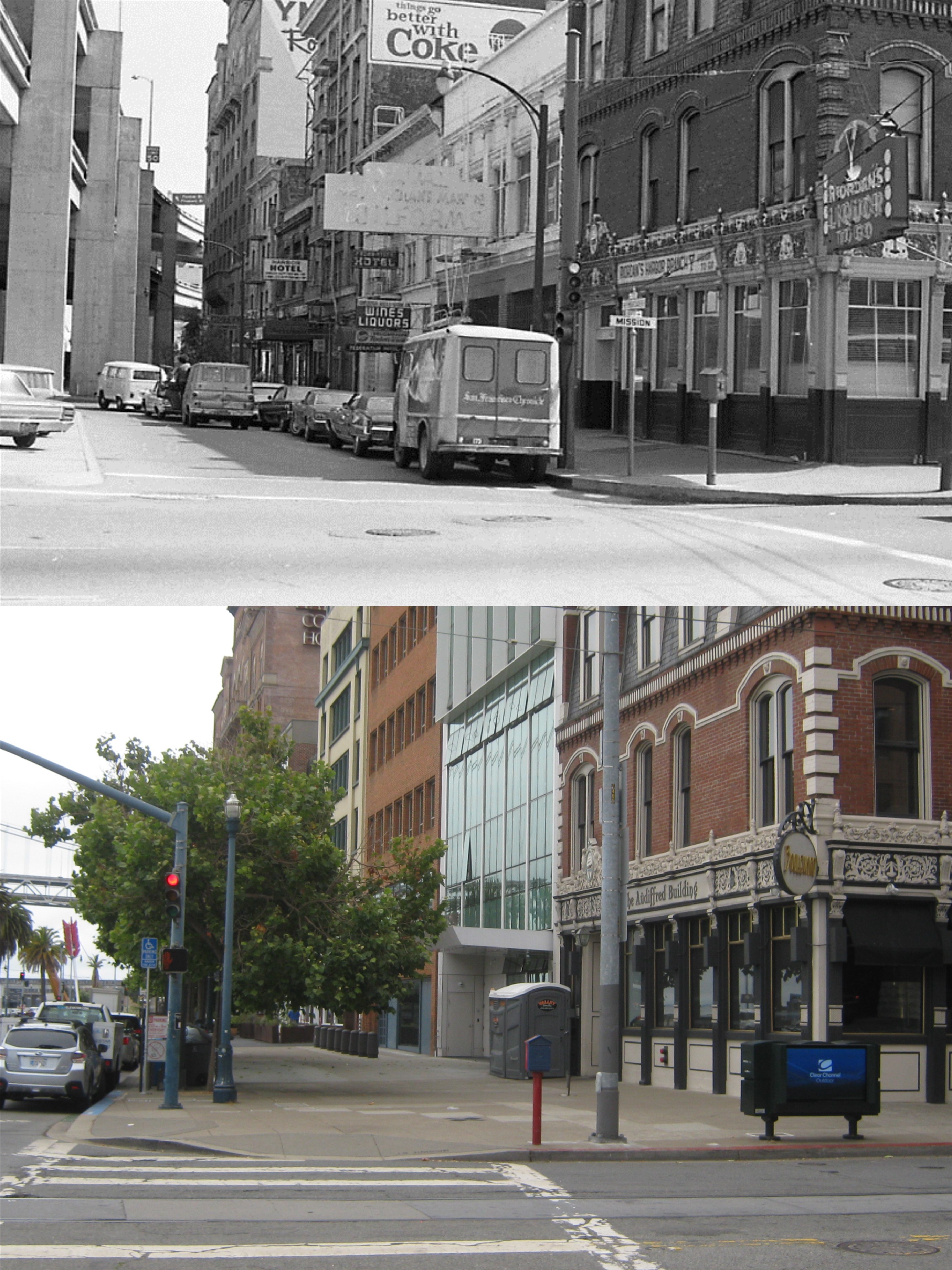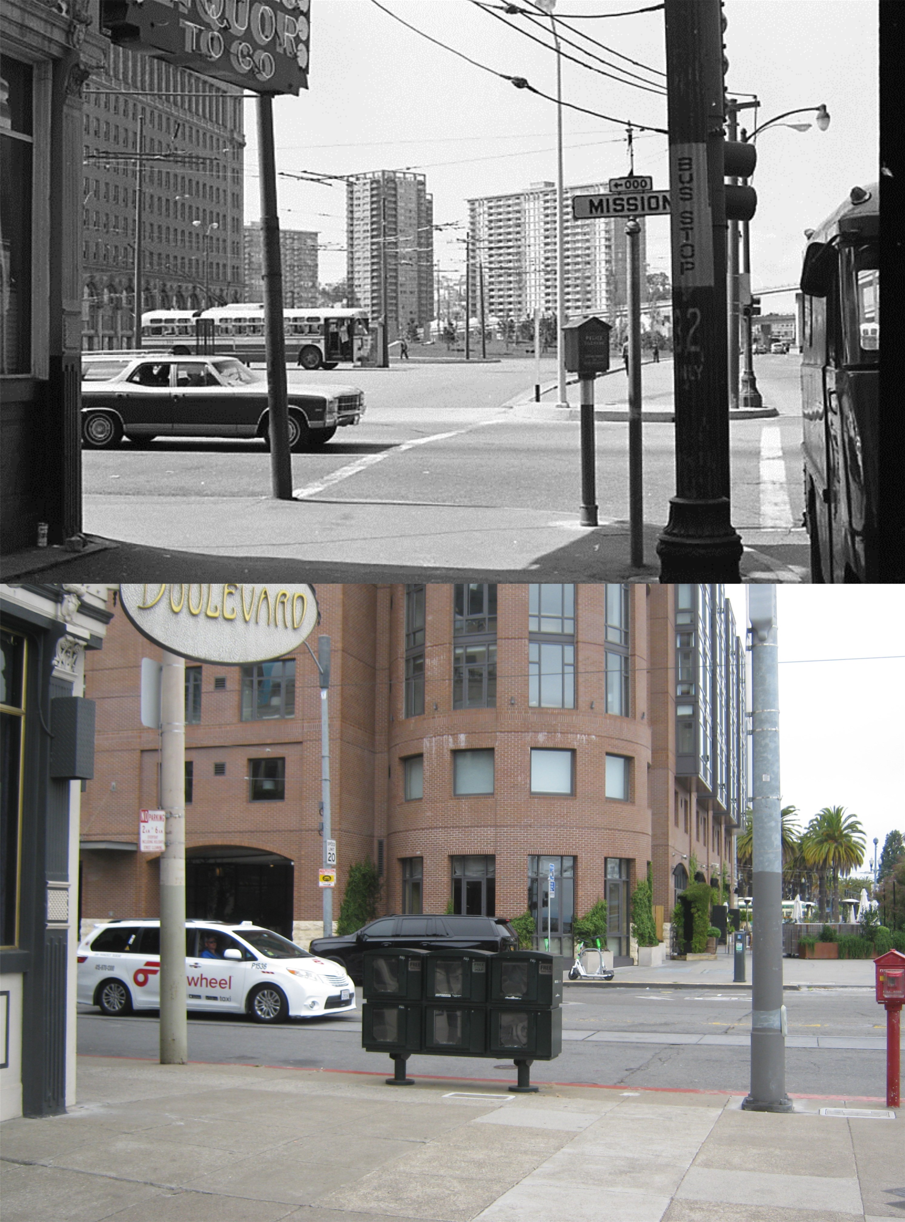 Believe it or not, I wasn’t trying to line this bus up with the cable car in the older photo, taken from Joice Street looking toward Sacramento Street, but the MUNI #1 came by at just the right time to make a nicer comparison. The Cameron House is on the right in both photos.