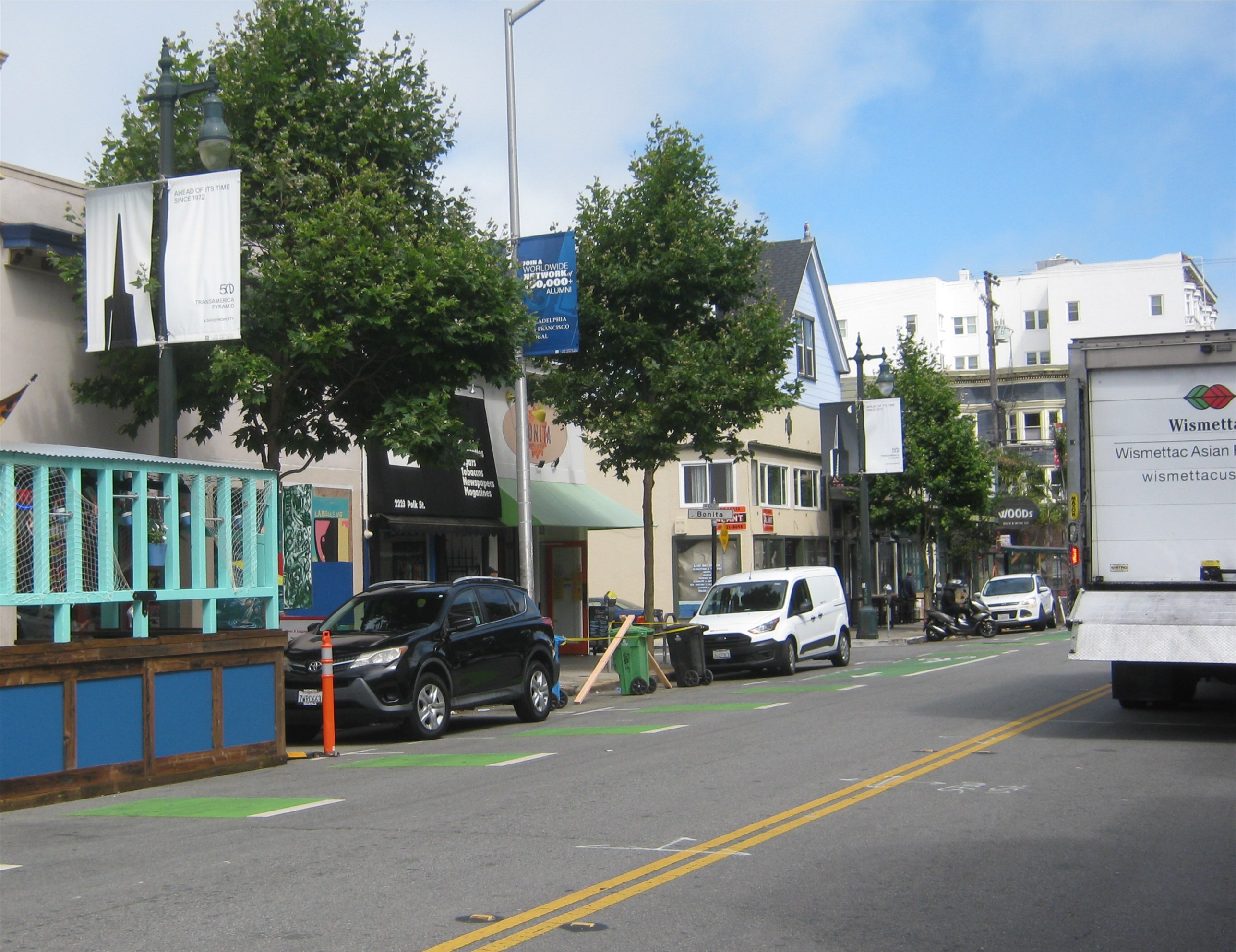 They head down Joice Street toward Sacramento Street past what appears to be another obligatory 1970s Volkswagen parked on the right.