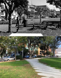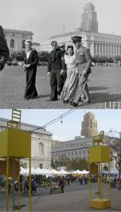 A Life Magazine picture at Civic Center during World War Two: They were walking about where the San Francisco Library Building is now; I’m standing at the entrance to the library. The Empire Hotel Building is in the right background of both pictures. I first did an update of this Life photo on Halloween of 2014, as San Francisco was getting ready for a parade to celebrate the San Francisco Giants third World Series Championship.