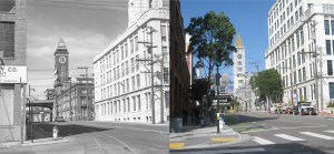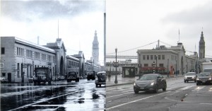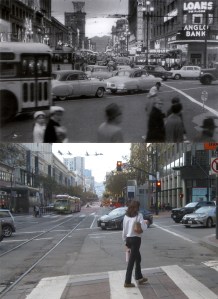 Where the California Street Cable Car Line comes into Market Street in the 1940s and now: This was as close to a line up as I could get. The Southern Pacific Building is on the right in both pictures. Back in August of 2015, when I did my first update of the old photo, the numbers 15 were on the Ferry Building commemorating the one hundred year anniversary of the 1915 Panama Pacific Exposition.