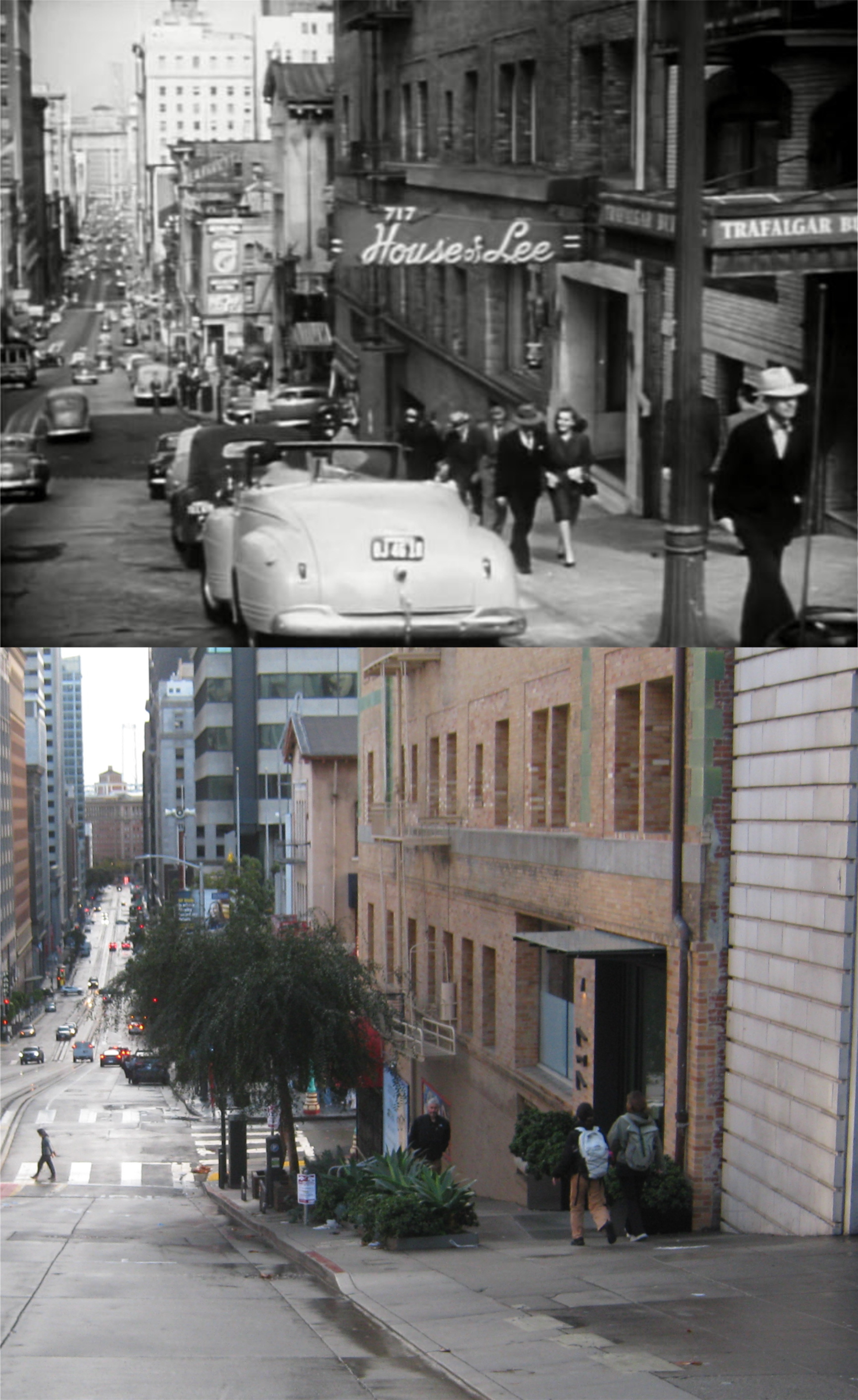 A movie scene on California Street up from Grant Ave in the 1947 film ‘My Favorite Brunette’: That’s Bob Hope, hot on a detective case, driving away from his office in the Trafalgar Building. The Trafalgar Building is gone now and was where the parking garage for the Ritz-Carton Hotel is now. Back in January of 2015 and also January of 2017, when I did an updates of this spot, the 717 entrance to the Sig Fat Building still had the white frame around the door entrance.