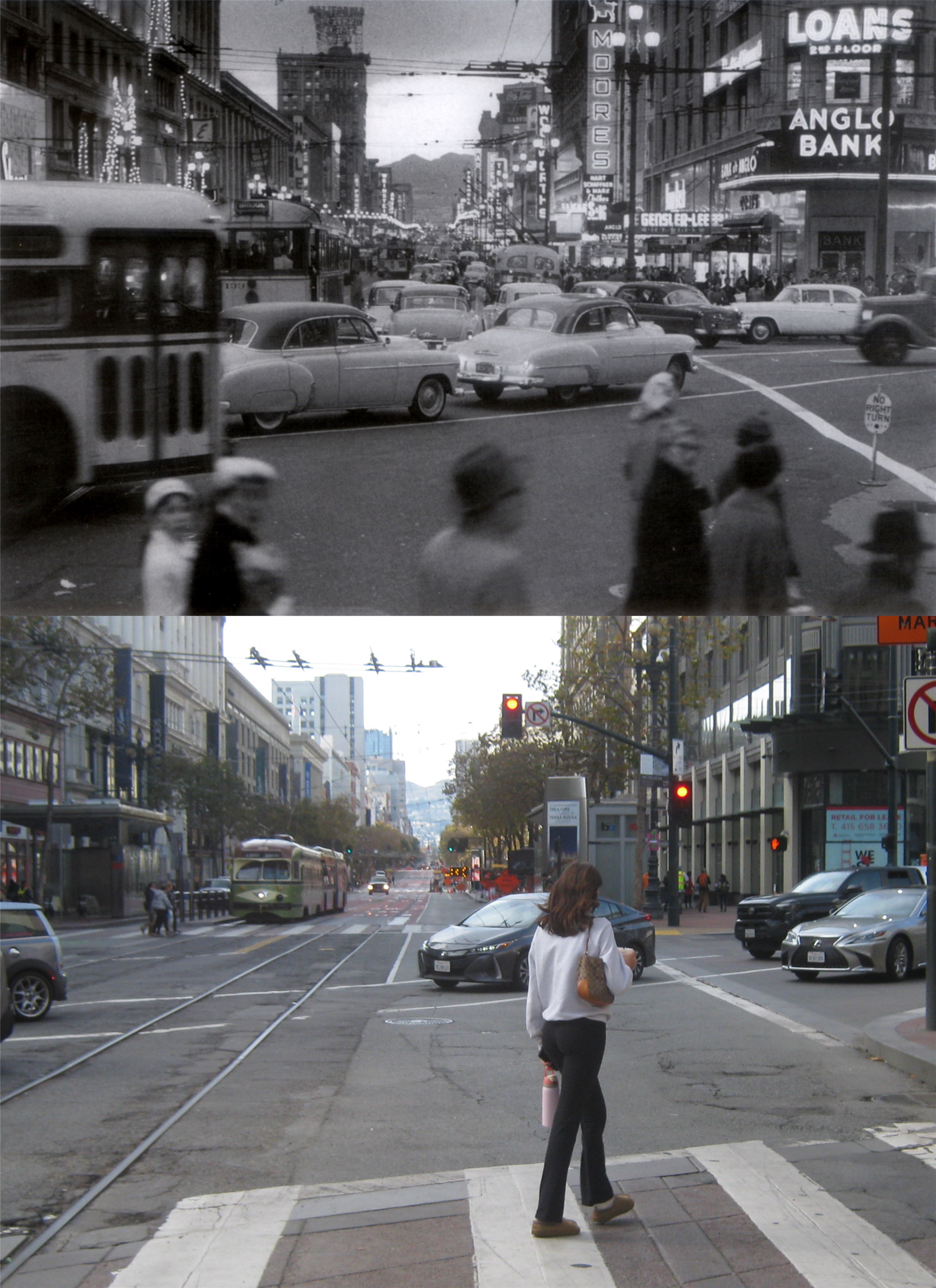 Traffic crossing Market Street from 4th Street to Stockton in the 1950s: Traffic runs only north to south from Stockton to 4th Street now.
