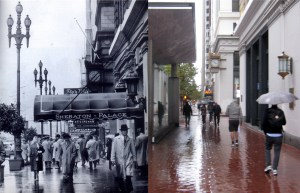 The entrance to the Palace Hotel on a rainy 1950s day: The clock is still there, but the Pig ‘n Whistle is gone. A blurry update on my part, but the vintage picture is too good to leave out.