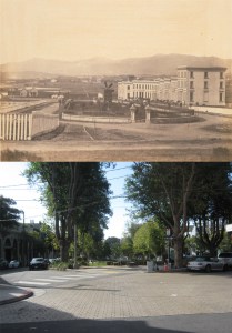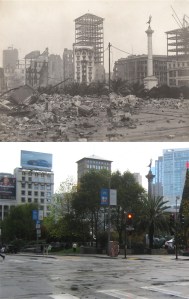 Union Square after the 1906 Earthquake: I got a better line up with the Dewey Monument than when I originally did an update of the vintage photo in January of 2016, although I had to cut out half of the Union Square 2024 Christmas tree, which is a shame because it’s such a nice tree.