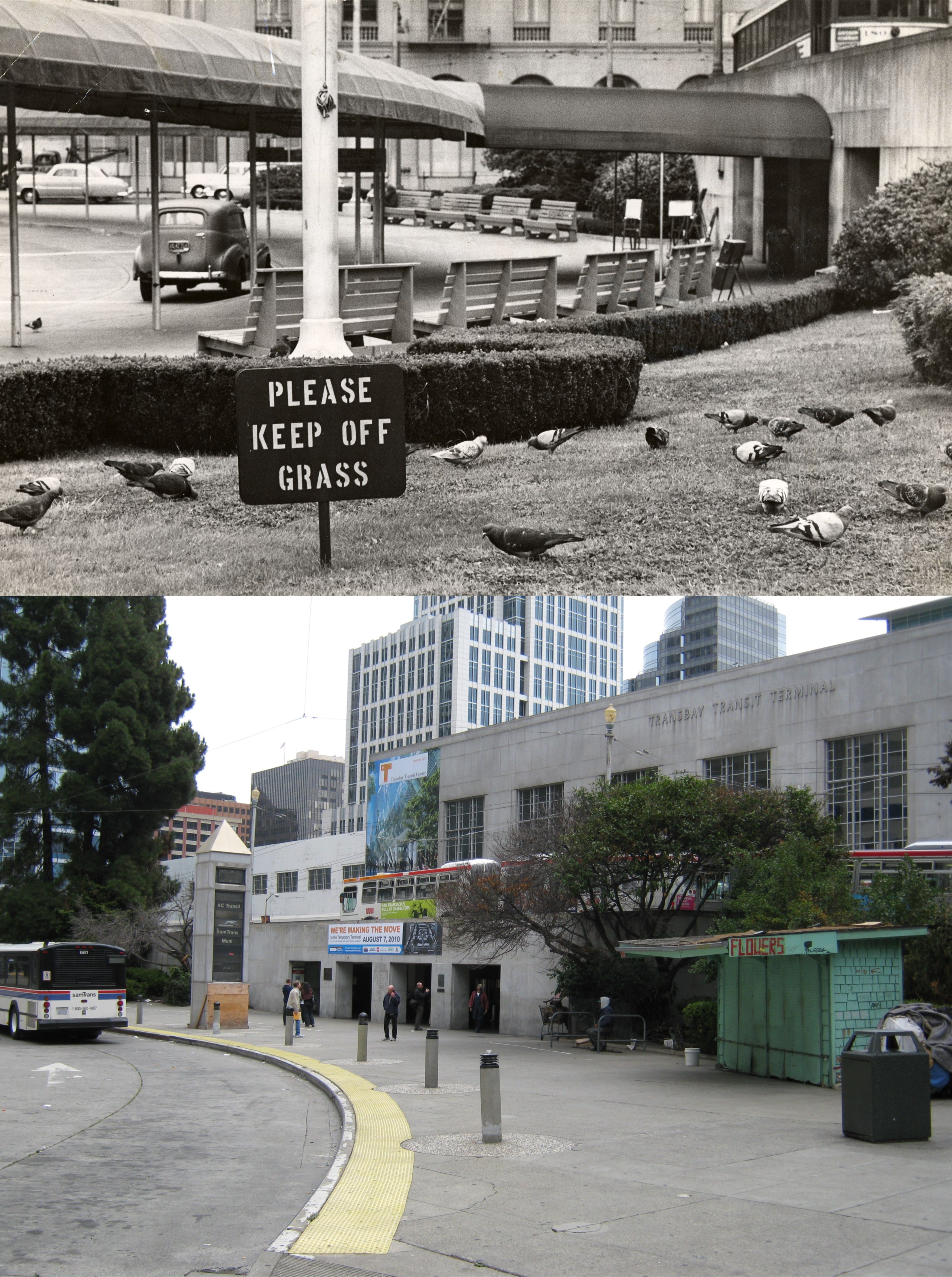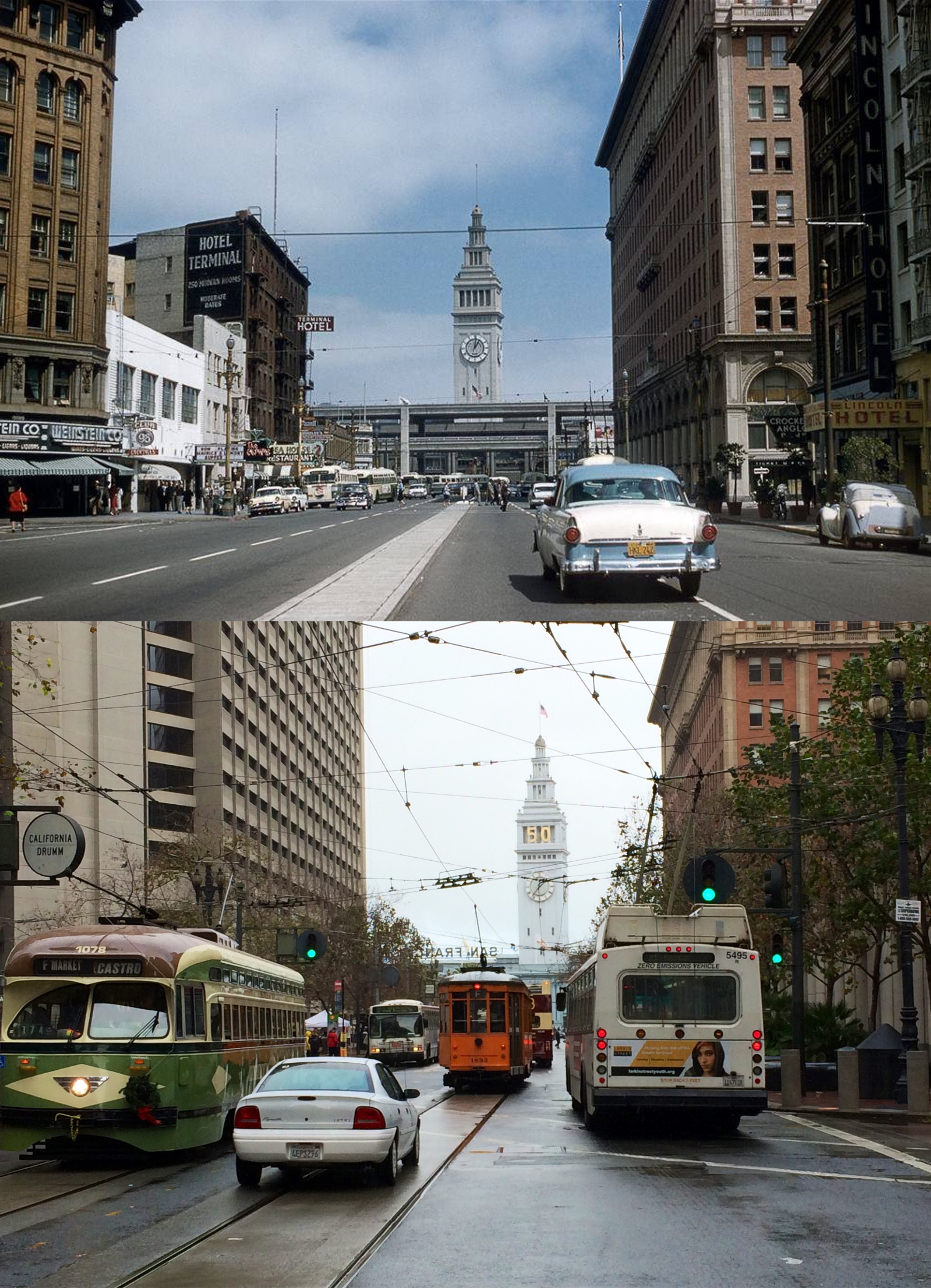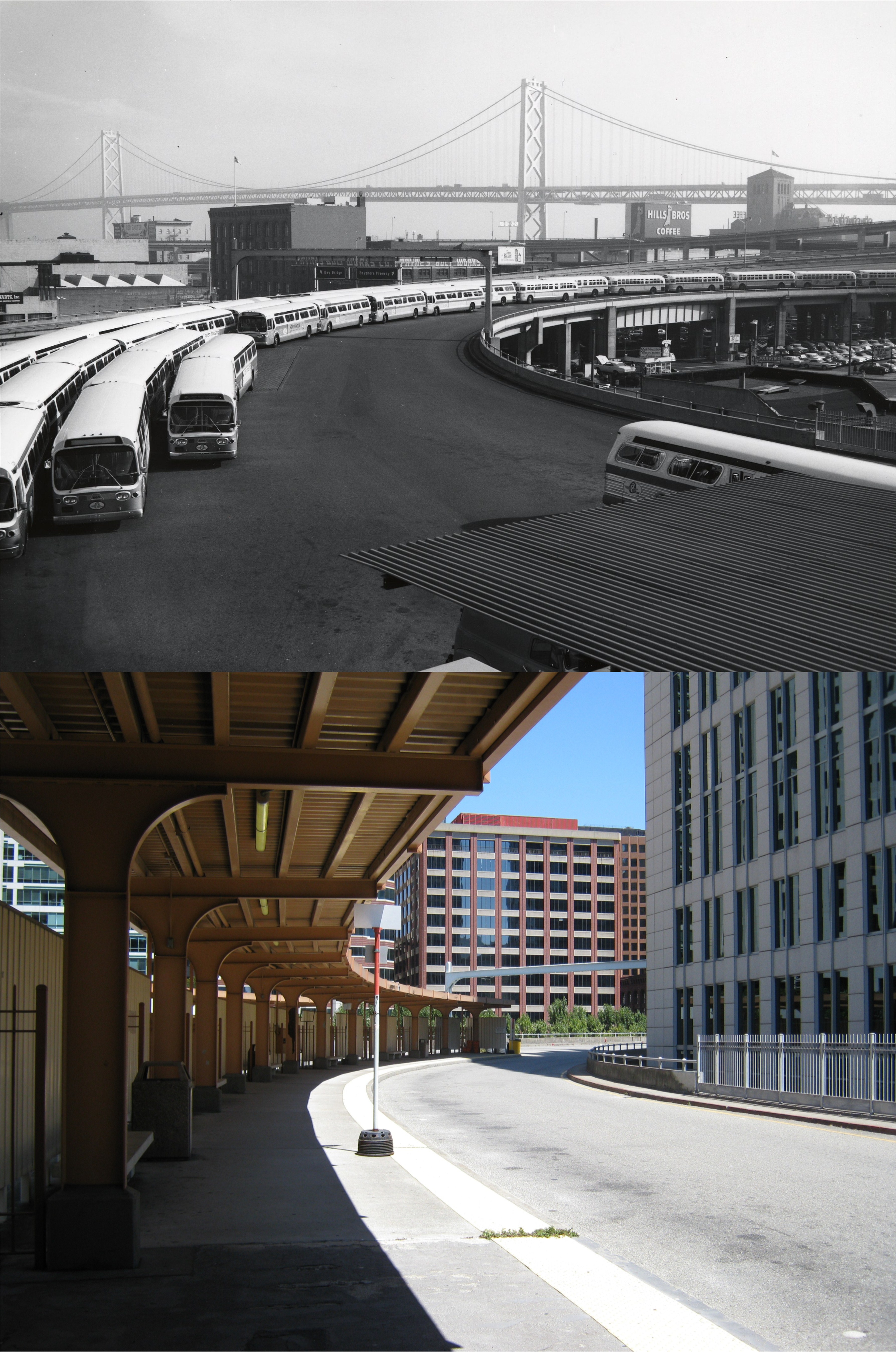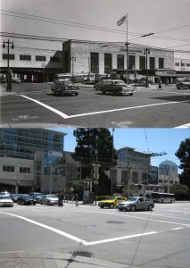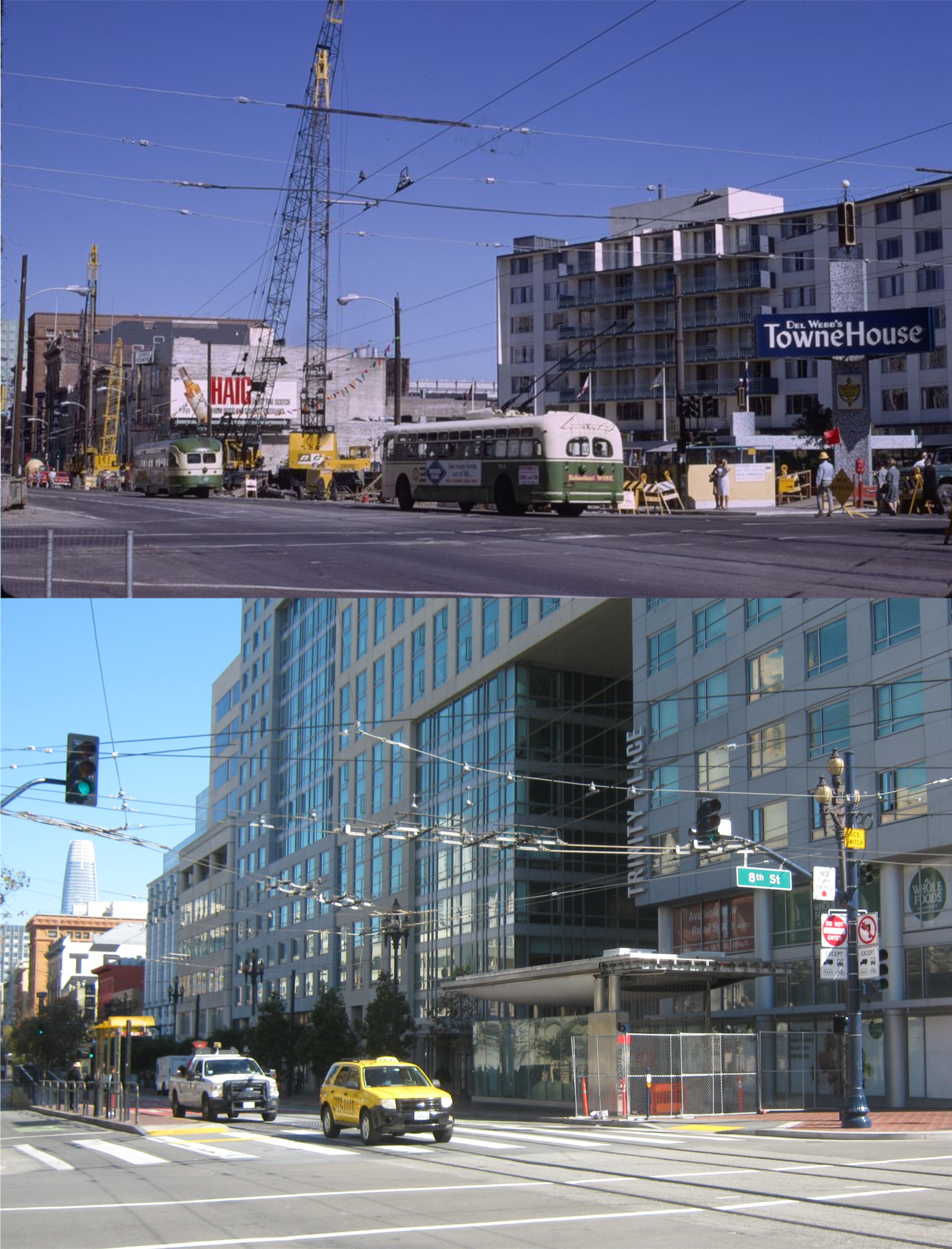 The intersection of Mission and Fremont Street, looking toward the terminal in the 1950s and August 7th, 2010: (SF Library Digital Archives)
