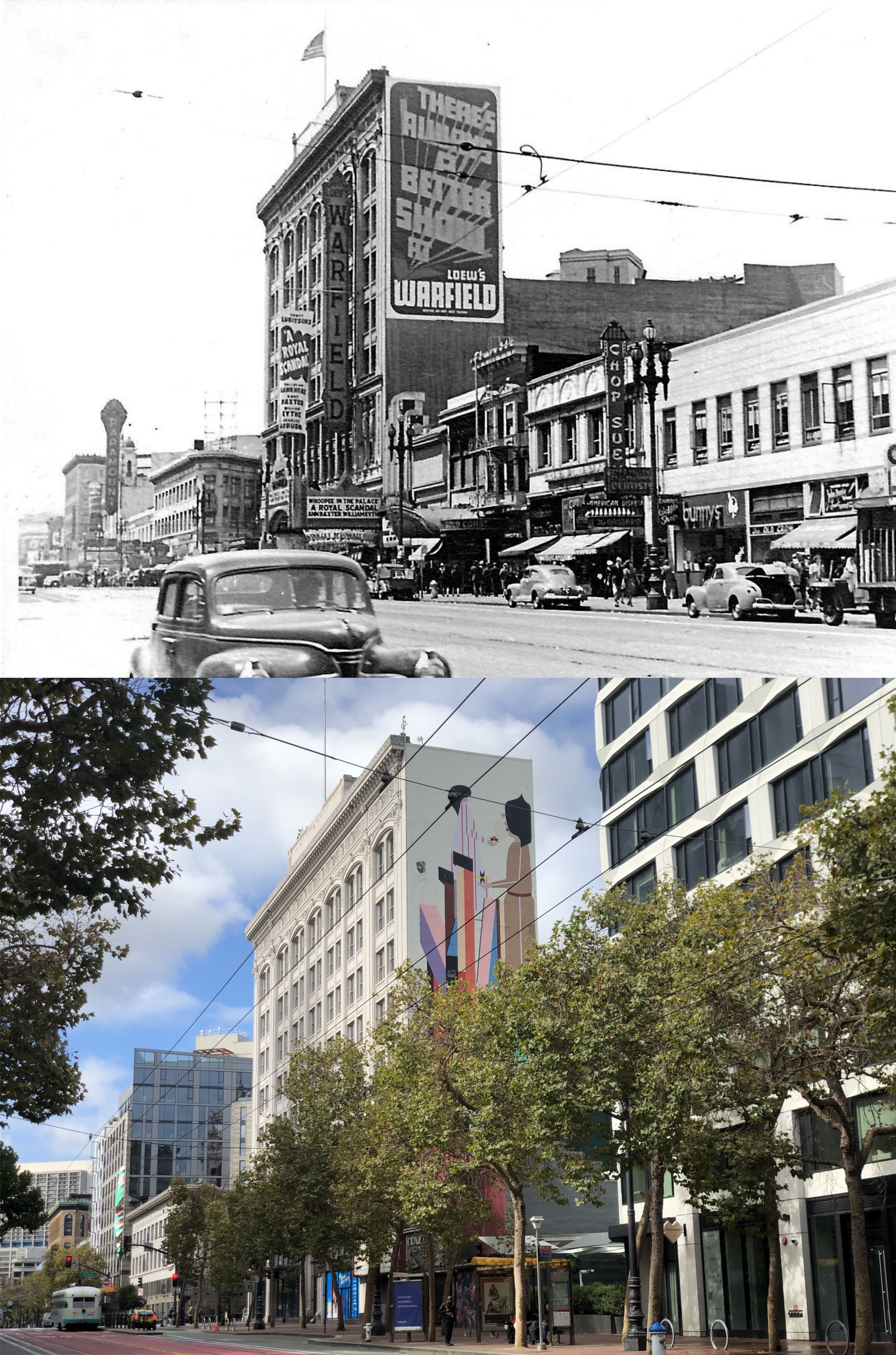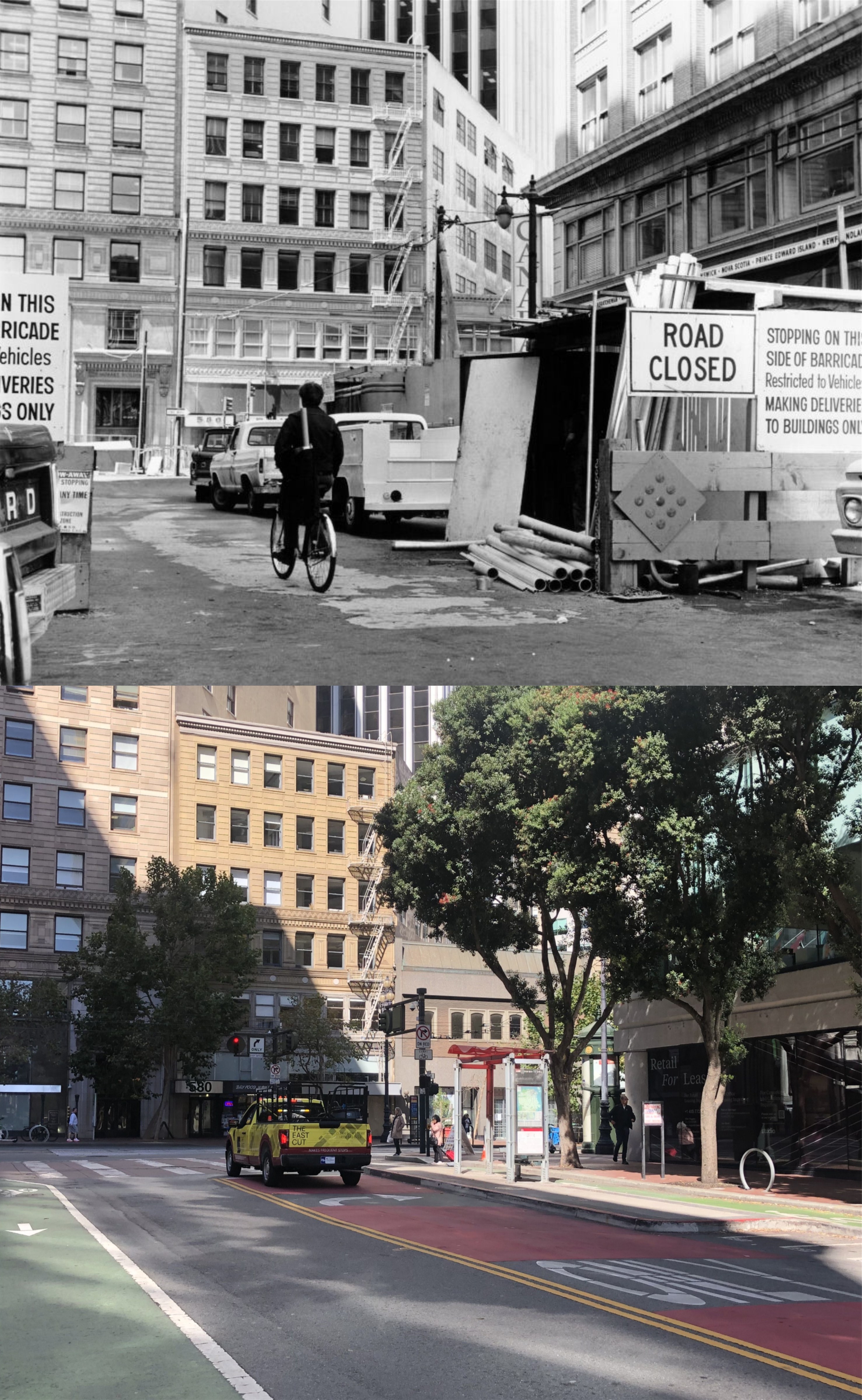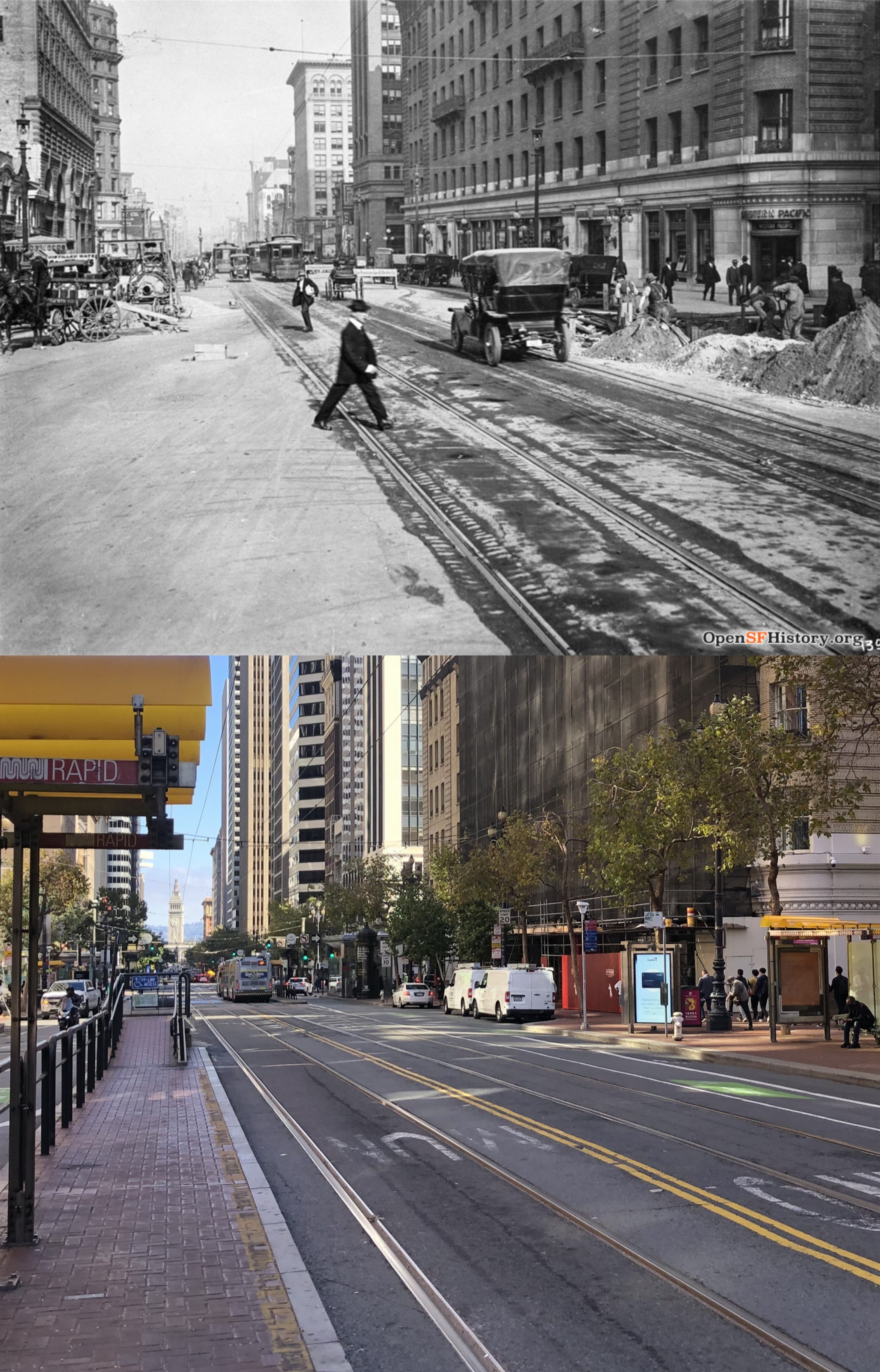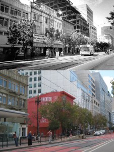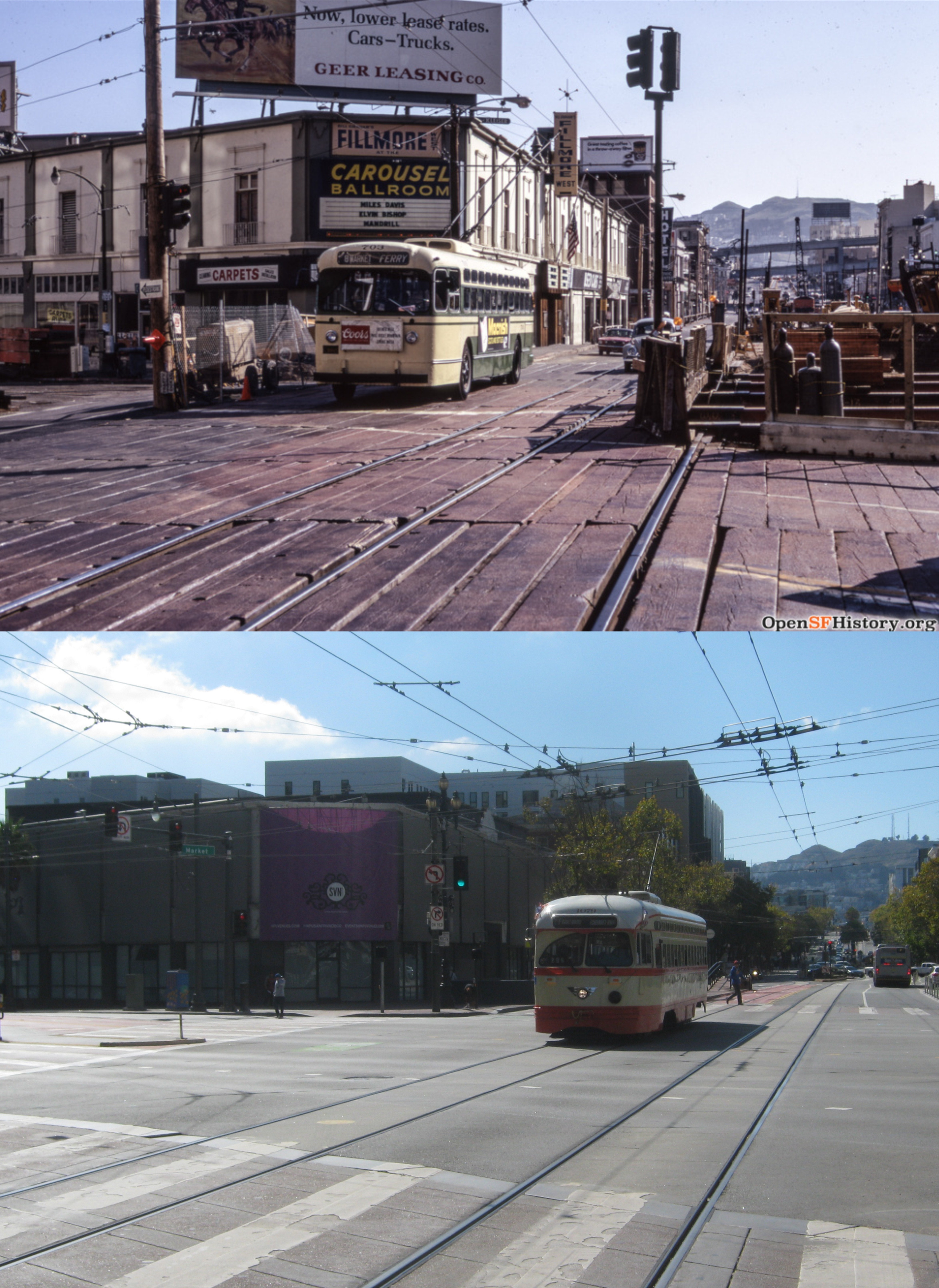 The intersection of Mission and Fremont Street, looking toward the terminal in the 1950s and August 7th, 2010: (SF Library Digital Archives)