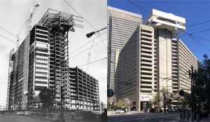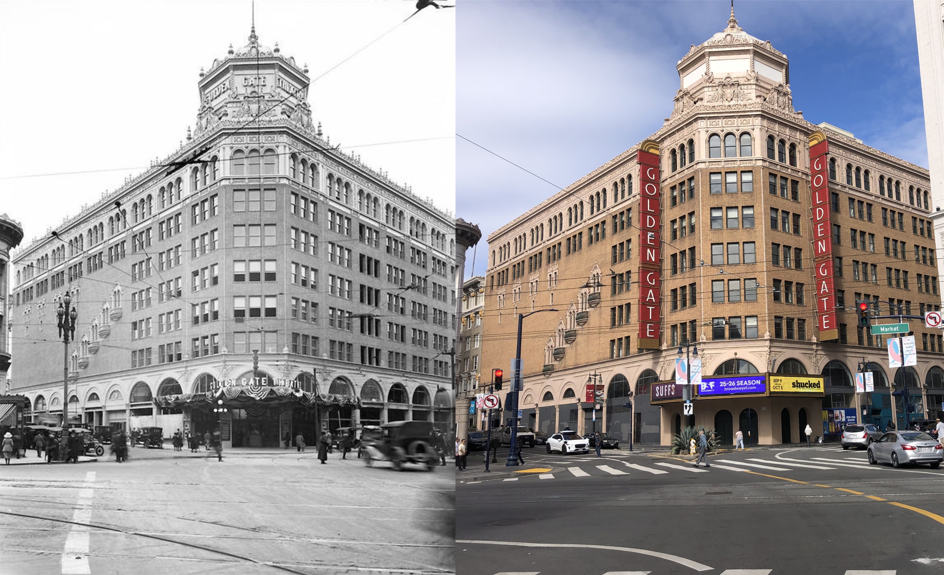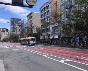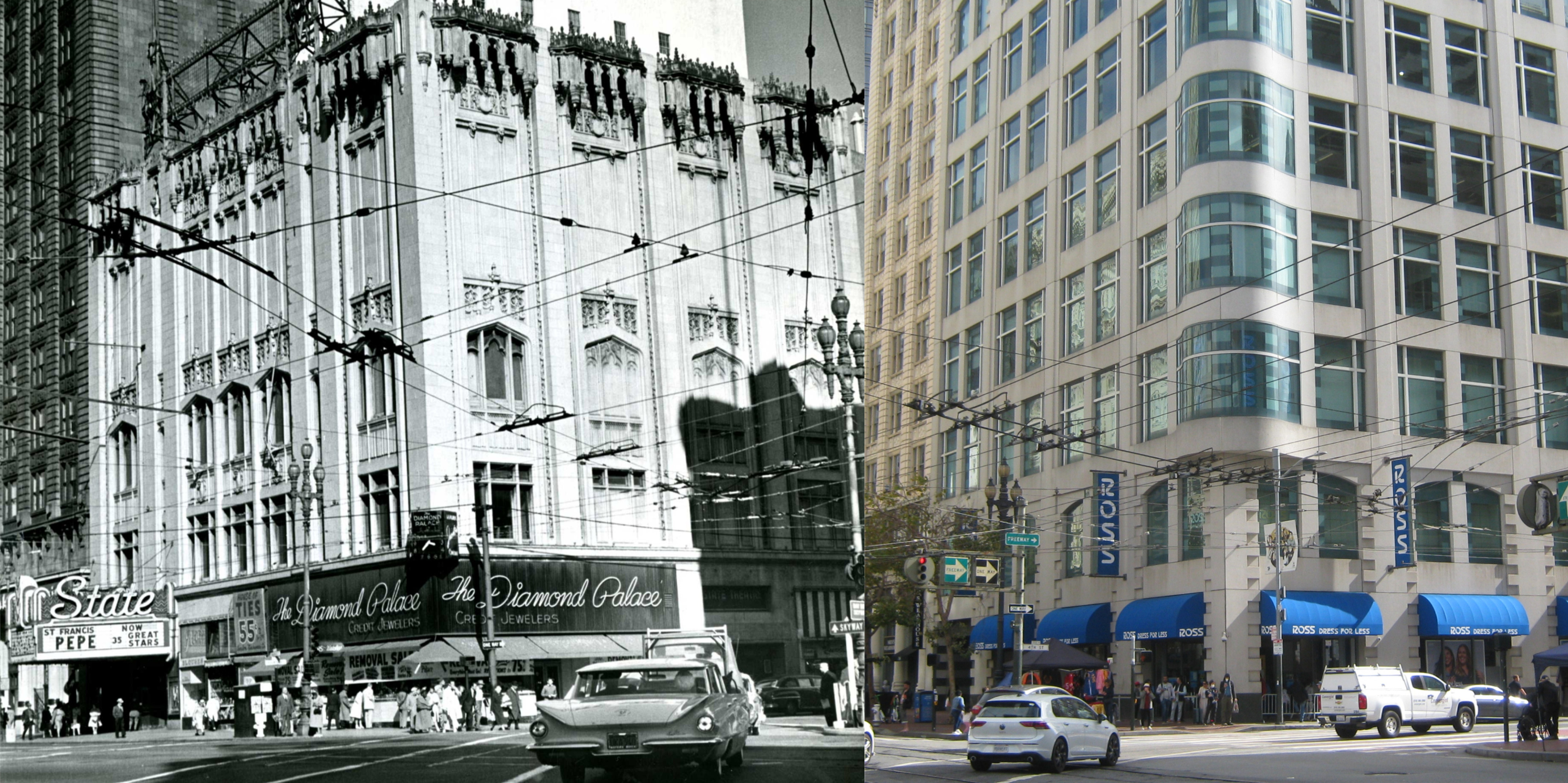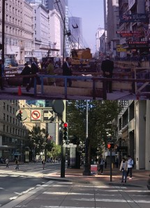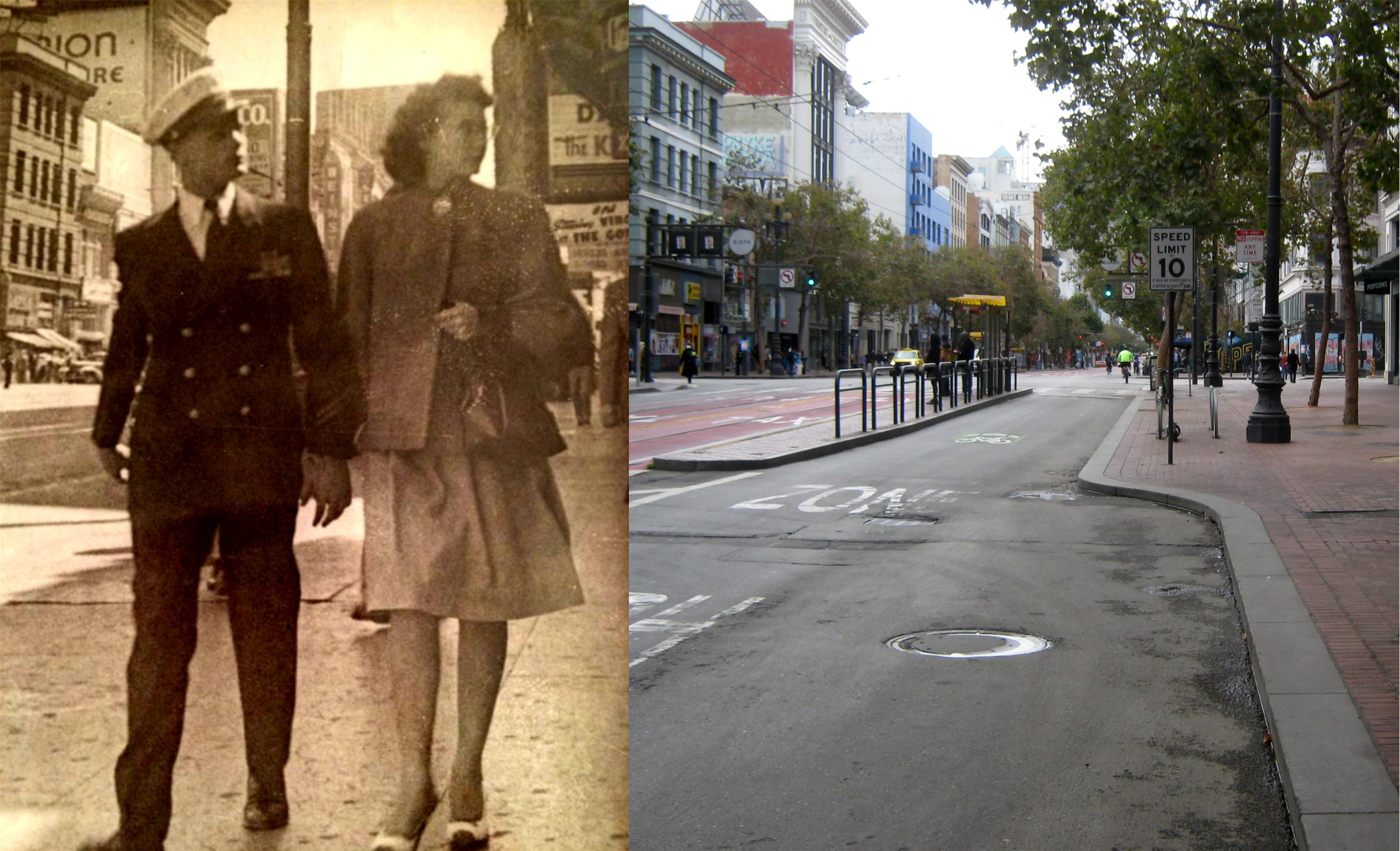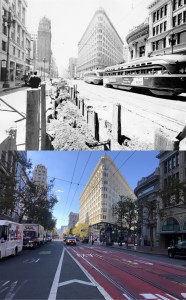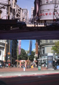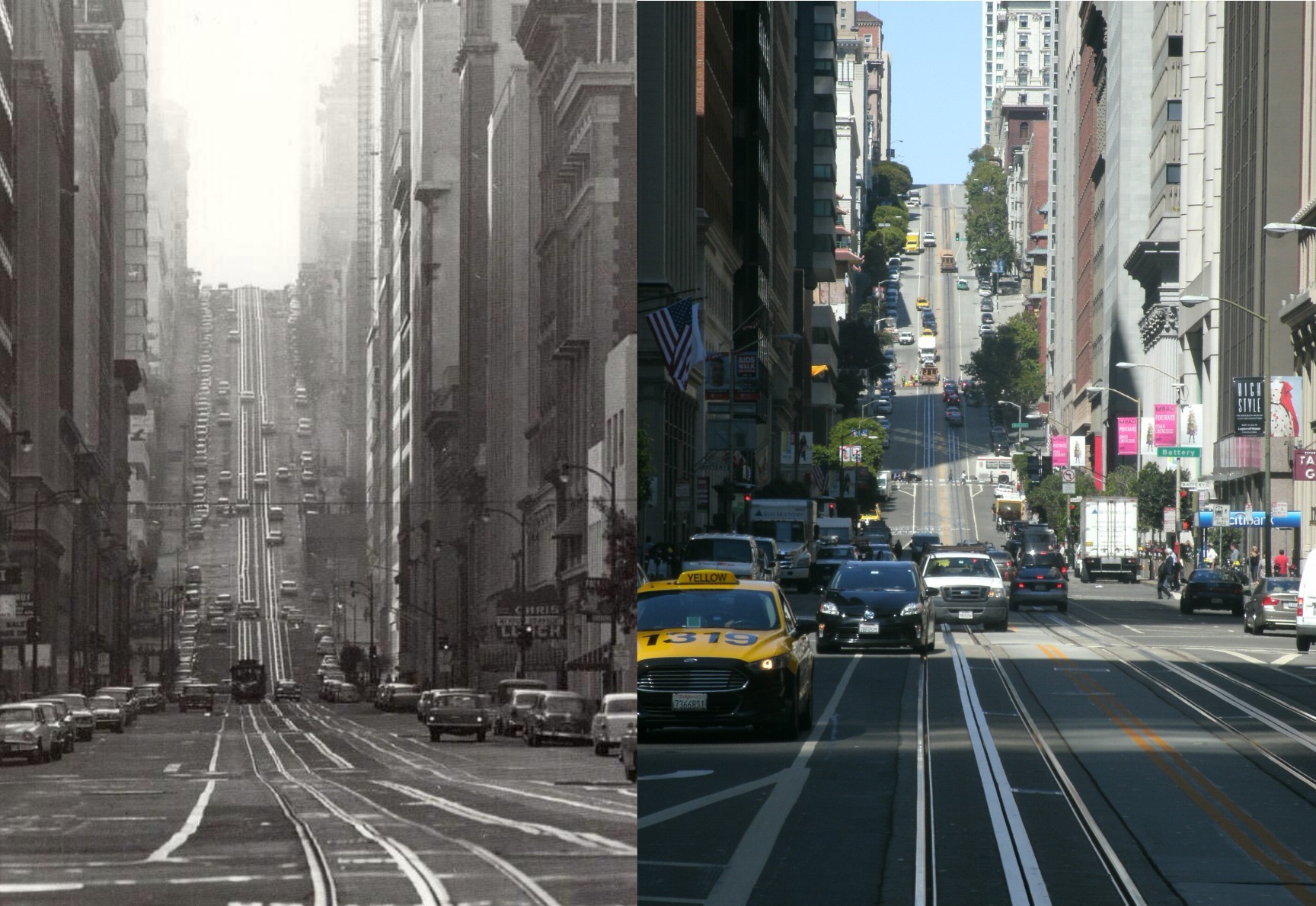 The intersection of Mission and Fremont Street, looking toward the terminal in the 1950s and August 7th, 2010: (SF Library Digital Archives)