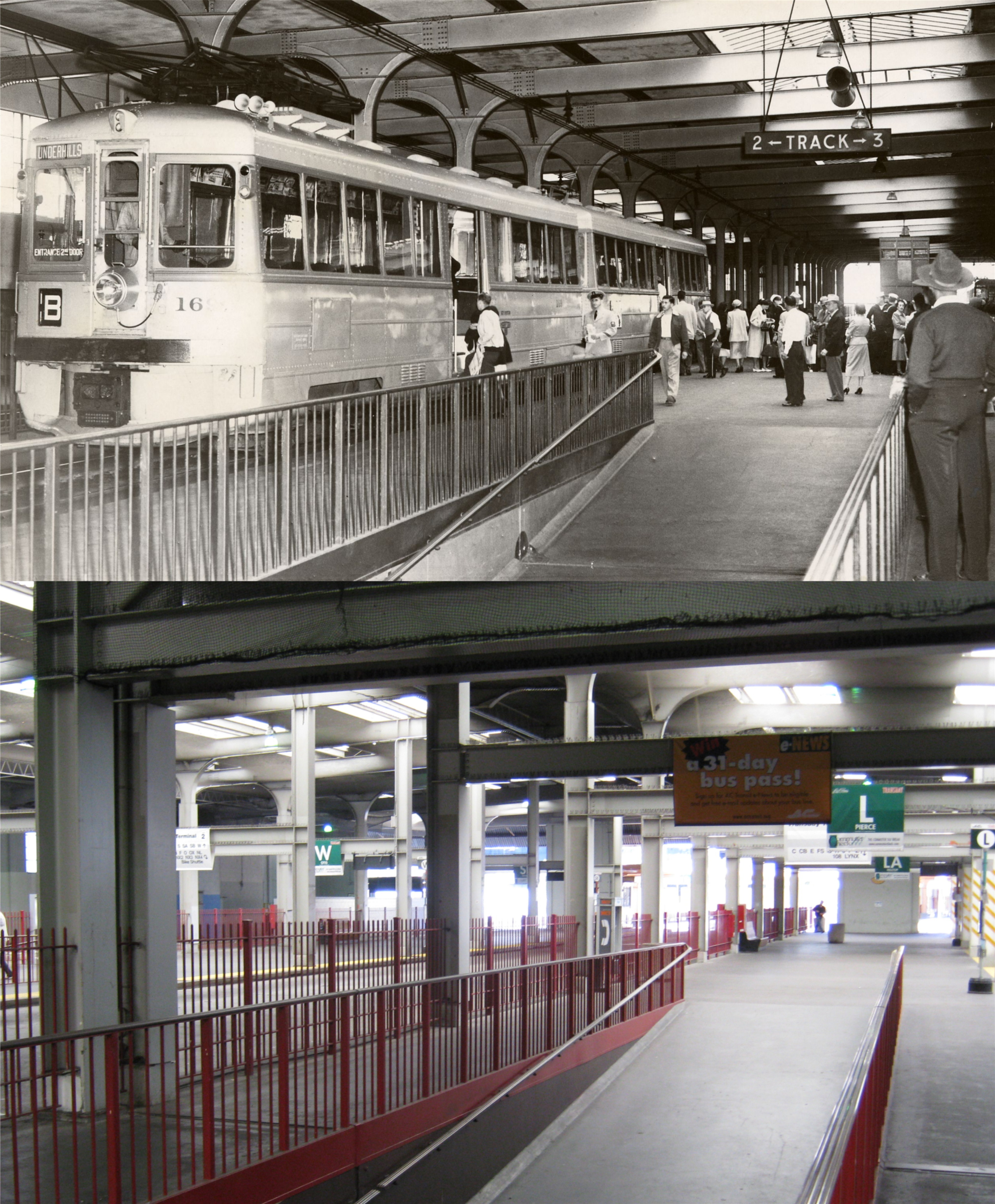 A Key System train in 1939,. and a bus in 2010: (UC Berkeley Library Archives)