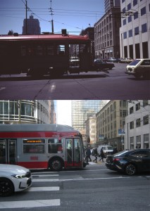 An old time streetcar leaving the Transbay Terminal, turns on to Mission Street from Fremont Street in August of 1983, (I think) and a bus leaving the Salesforce Terminal turns on to Mission from Fremont now. The Salesforce Tower blocks out the view of the old Pacific Telephone Building from here now.