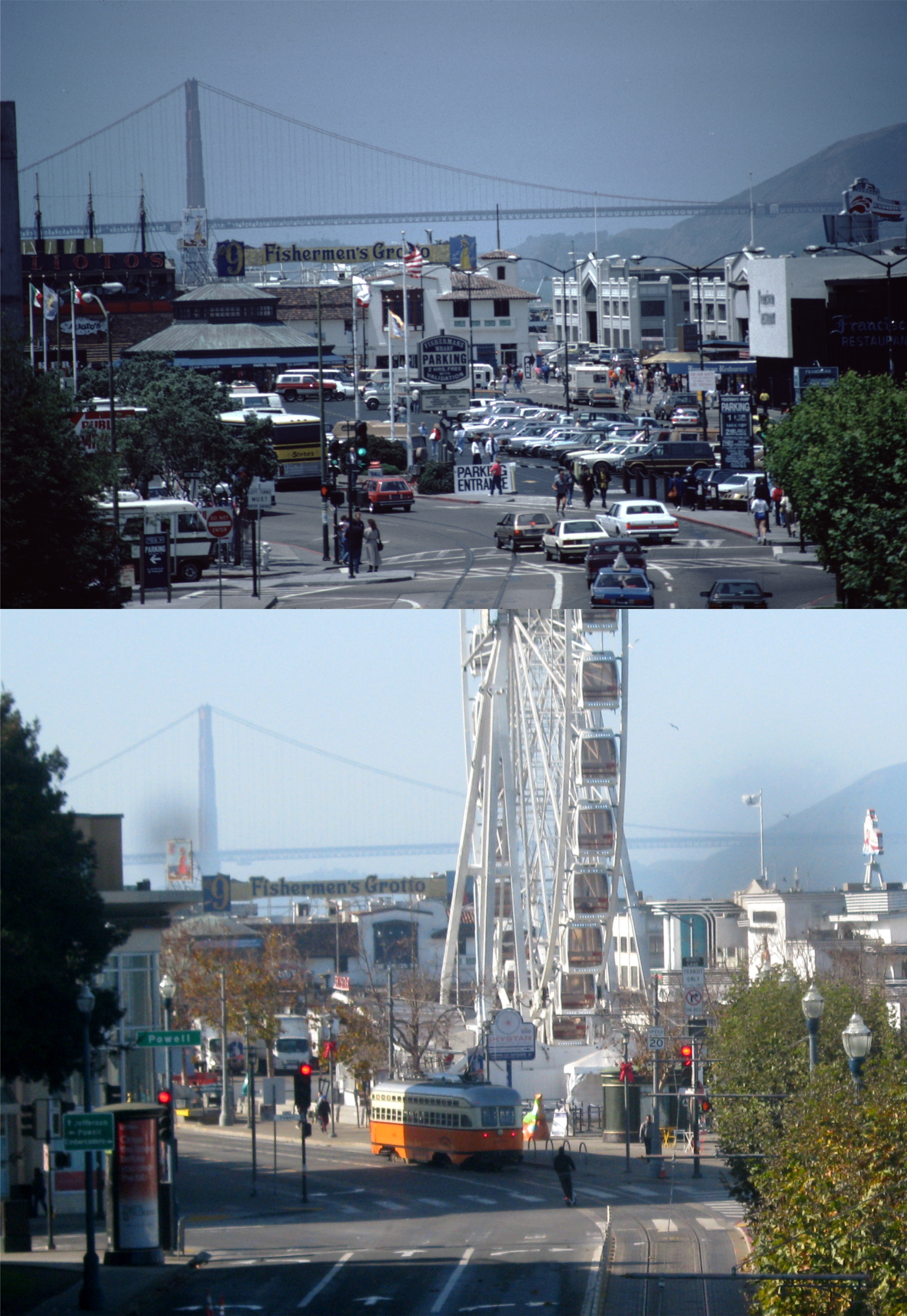 Fisherman’s Wharf from the footbridge that goes from Pier 39 to the parking garage: The SkyStar Wheel blocks the view now, but that doesn’t bother me, I like that thing.