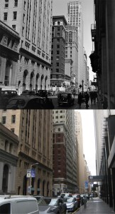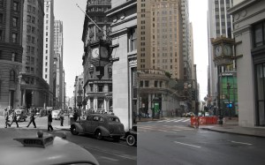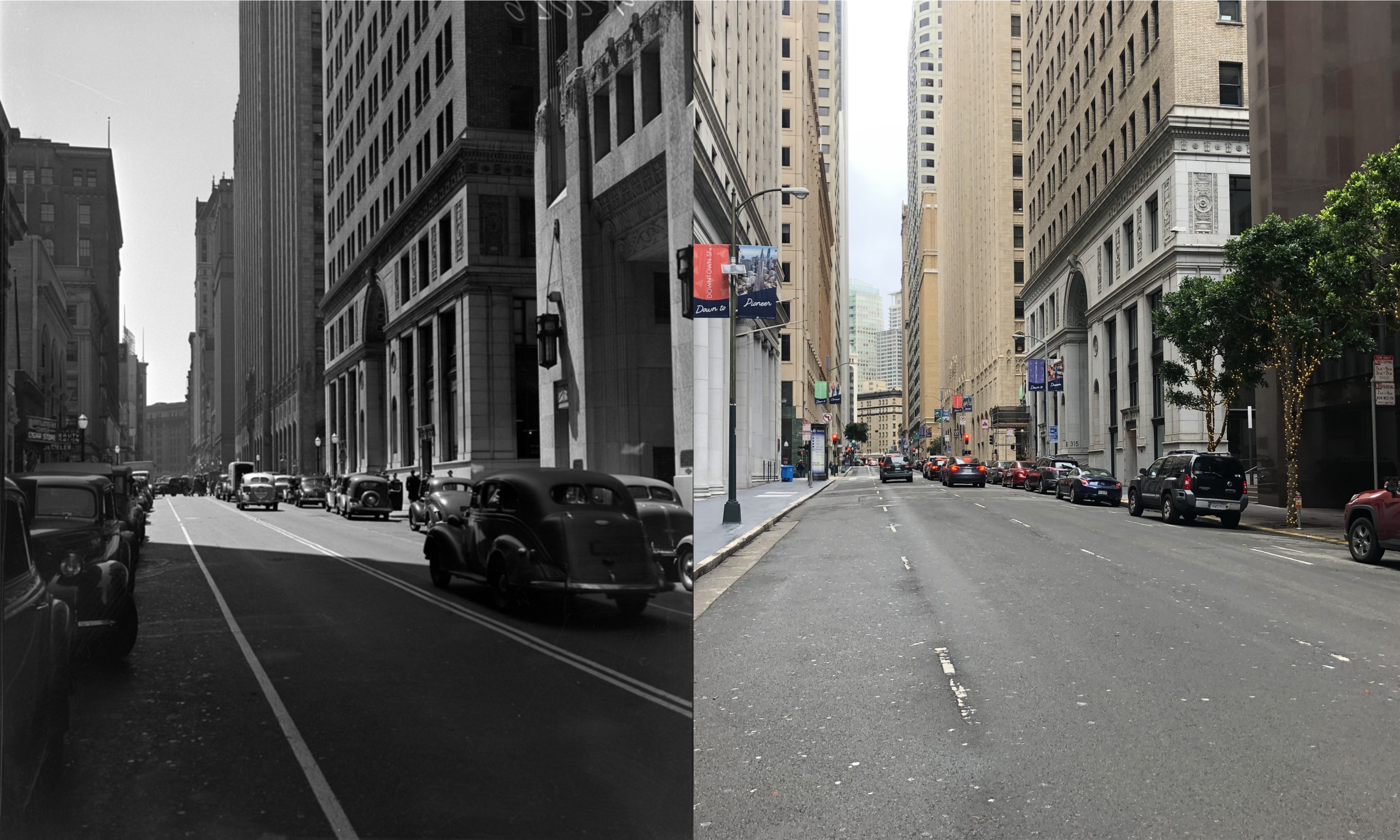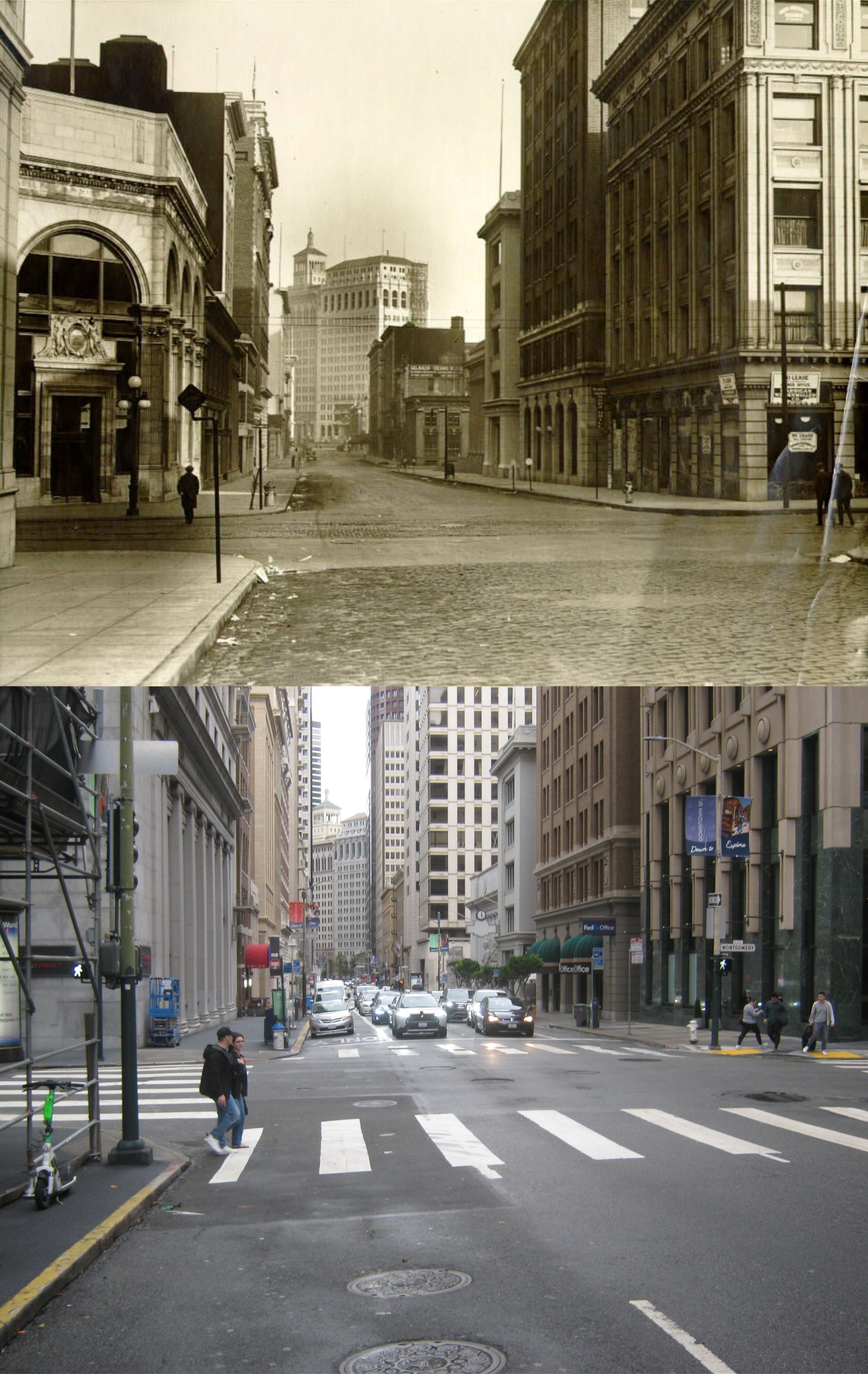 Looking north along Montgomery Street across Post Street in 1939. Post Street doesn’t cut across to Market Street here anymore. The building in the background is the Russ Building, the tallest building in San Francisco in 1939. You can see a portion of it in my picture. (UC Berkeley Library Archives)
