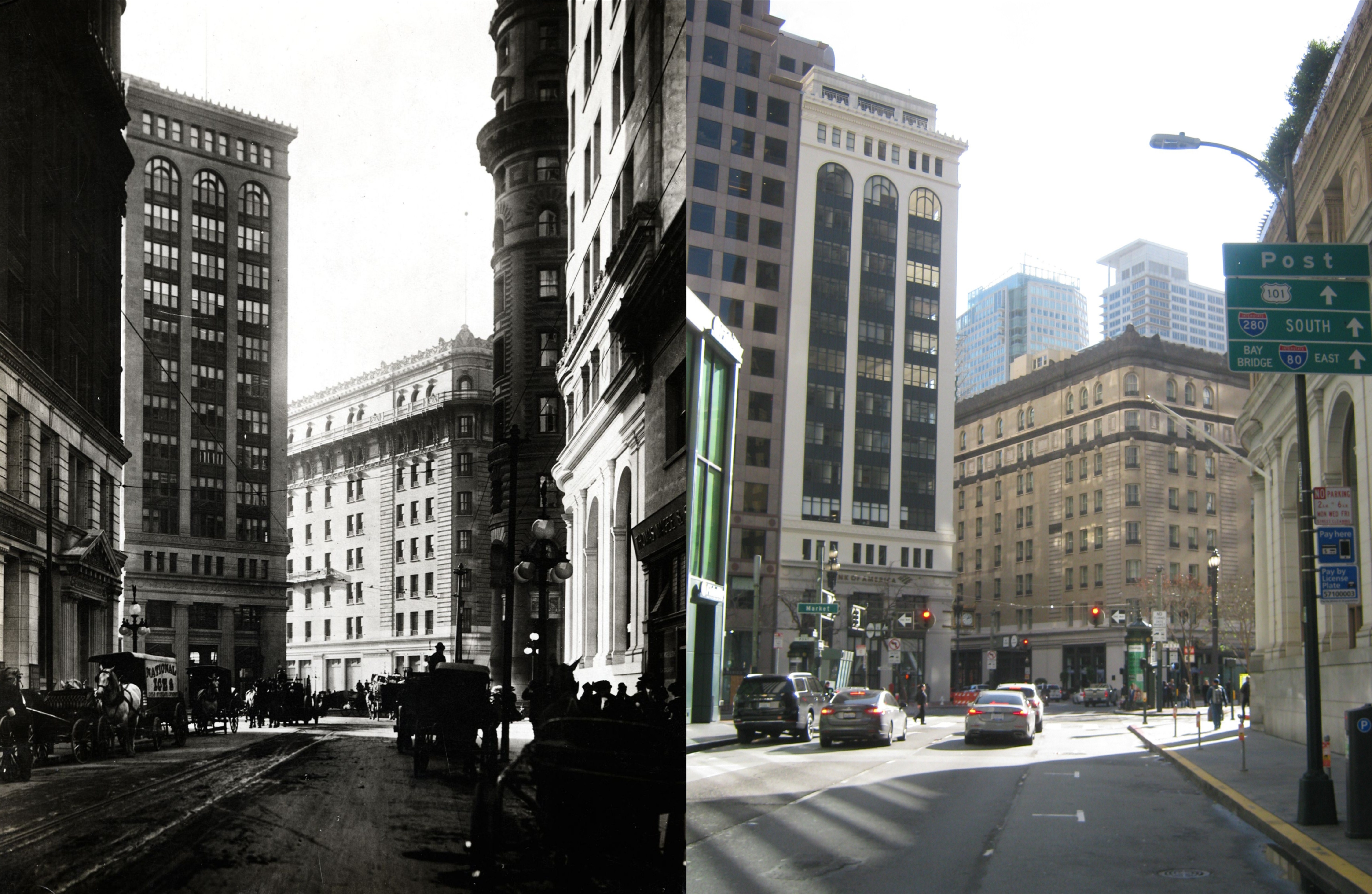 Looking back toward Market Street and the Palace Hotel in 1910: (San Francisco Library Digital Archives)