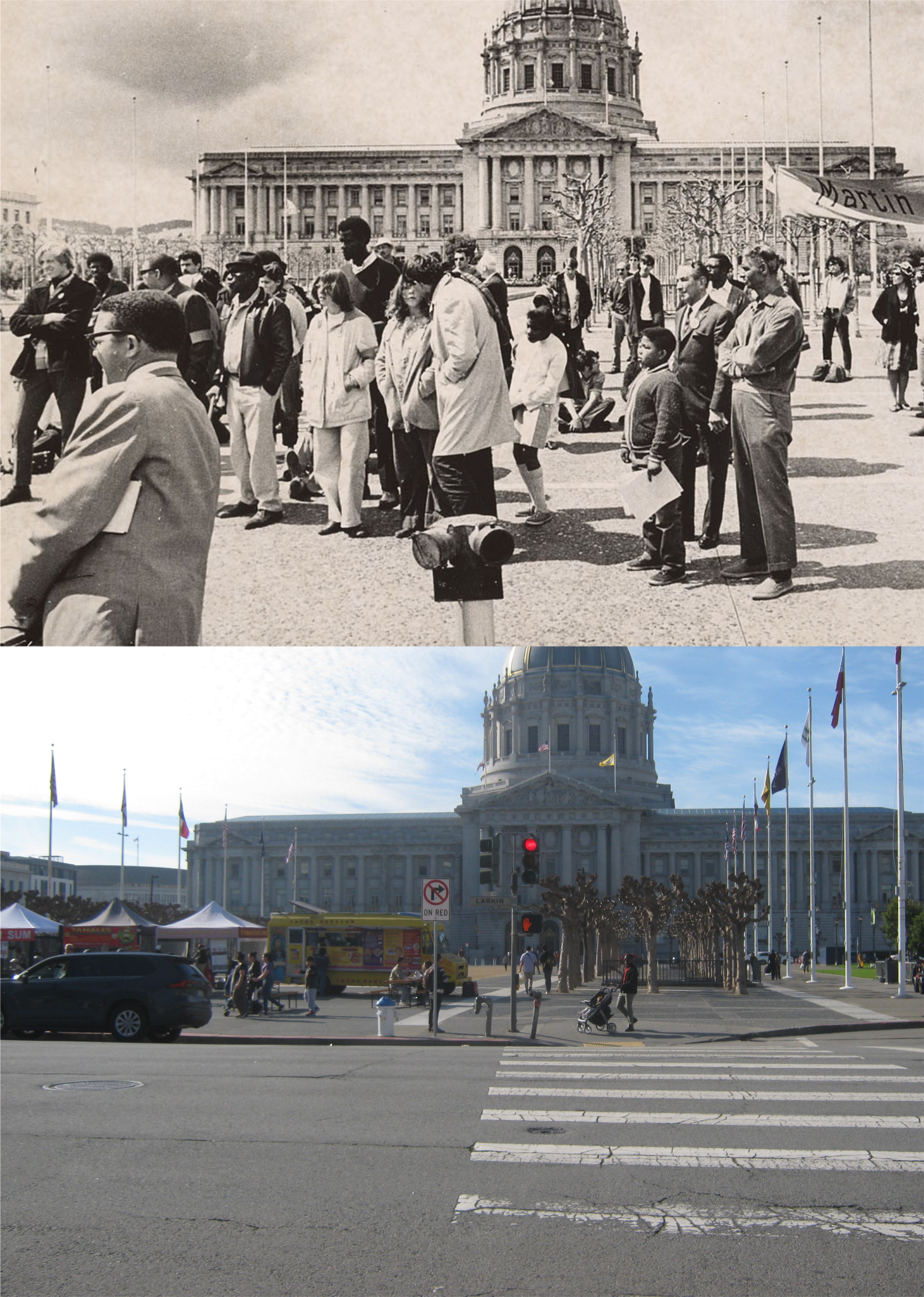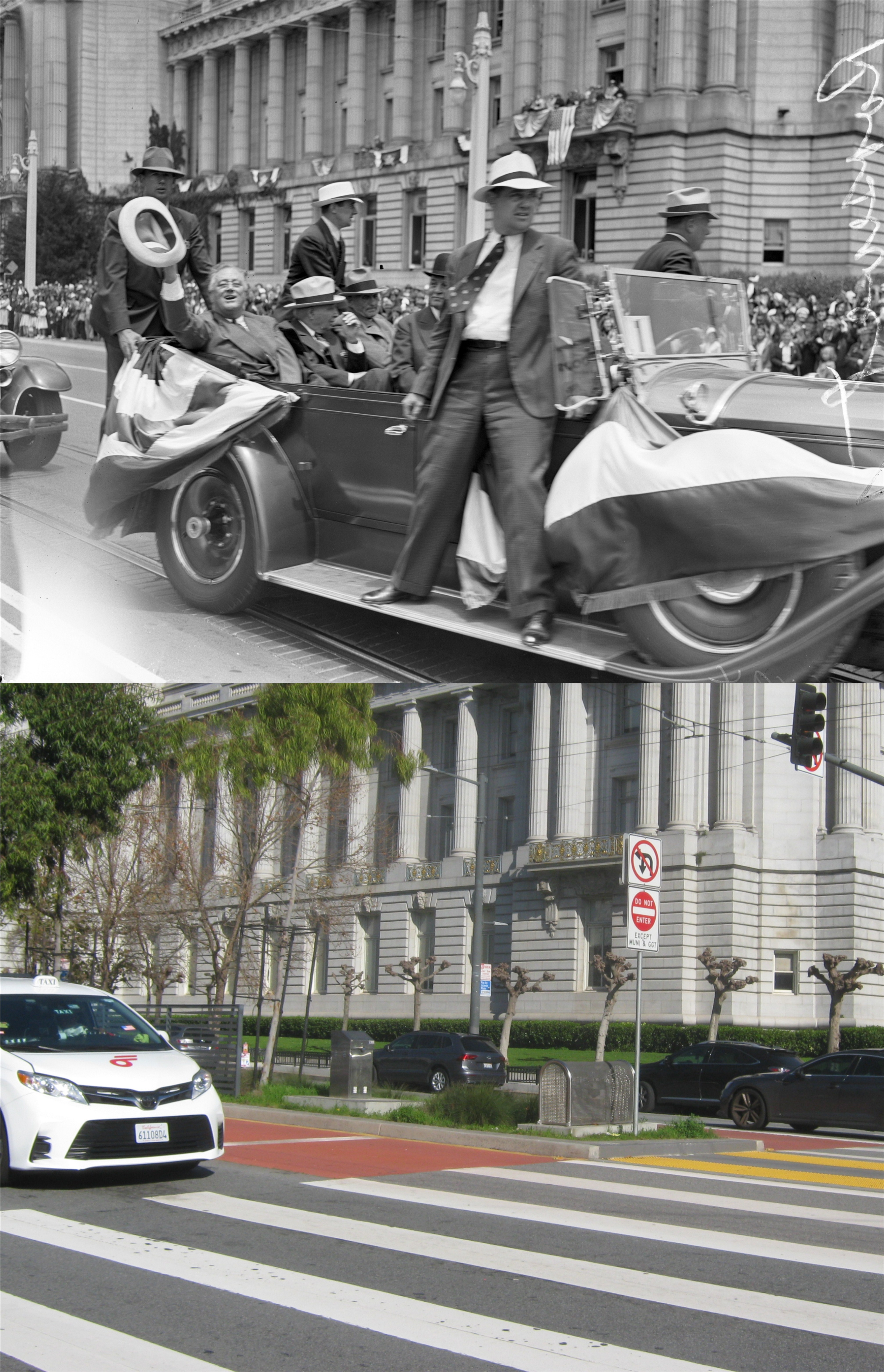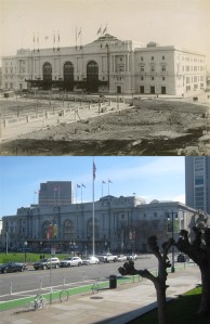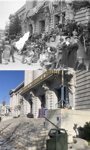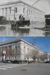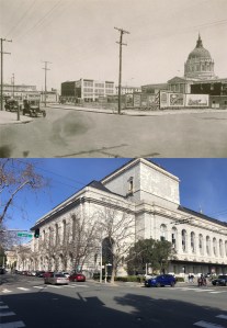There’s been a lot of events in and about San Francisco so far over the Martin Luther King Holiday weekend; such as the 49ers still playing in the Playoffs, (that turned out dismal) a tribute at Civic Center Plaza for Bob Wier of the Grateful Dead, and the first warm weather in the Bay Area for a couple of months. I visited the Civic Center area yesterday, Sunday, to take some comparison pictures around City Hall of vintage pictures from the UC Berkeley Library Archives. (Thumbnail images)