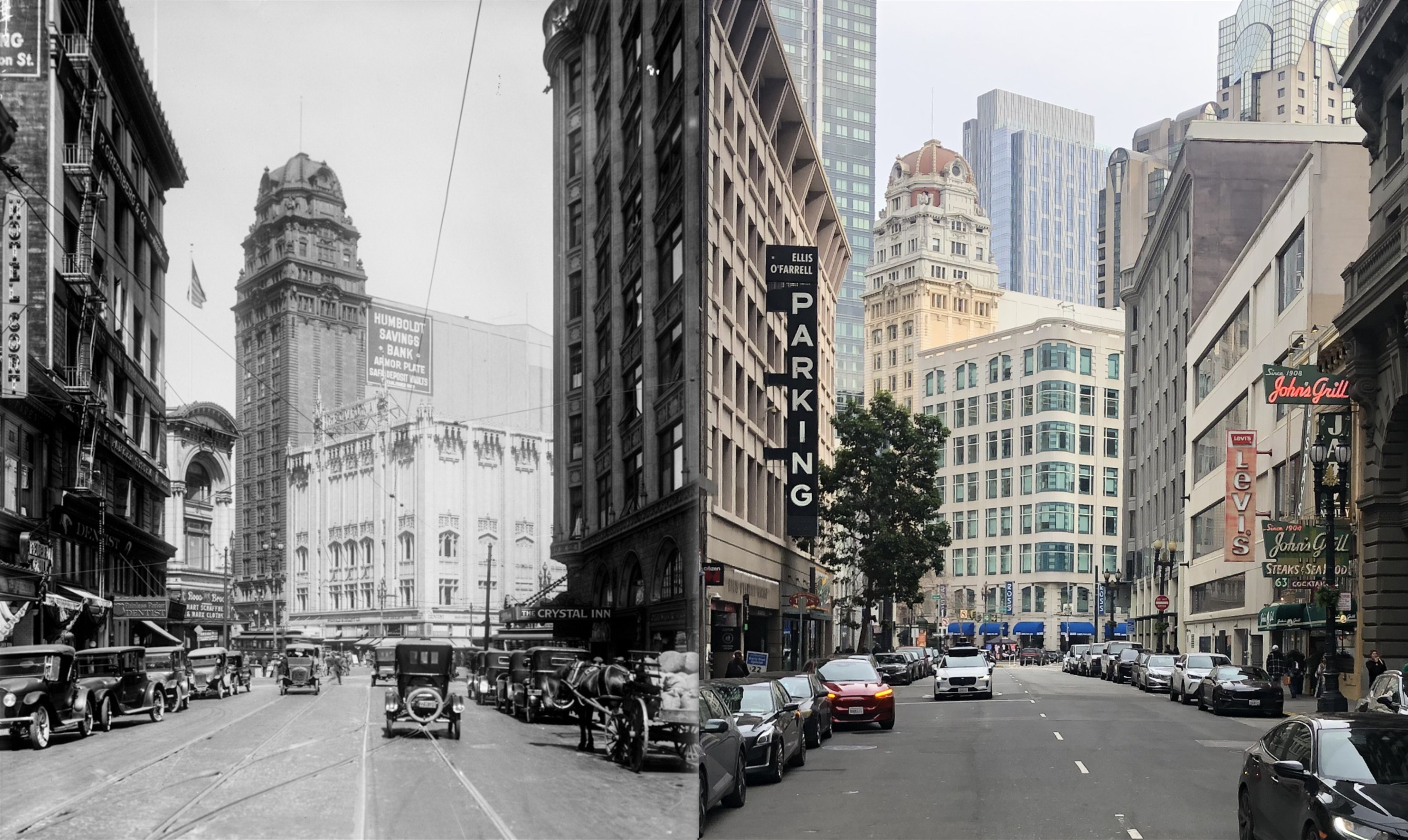 Looking down Ellis Street toward the Humboldt Building in 1922: I cropped my picture a little further to the right to get John’s Grill in.