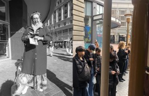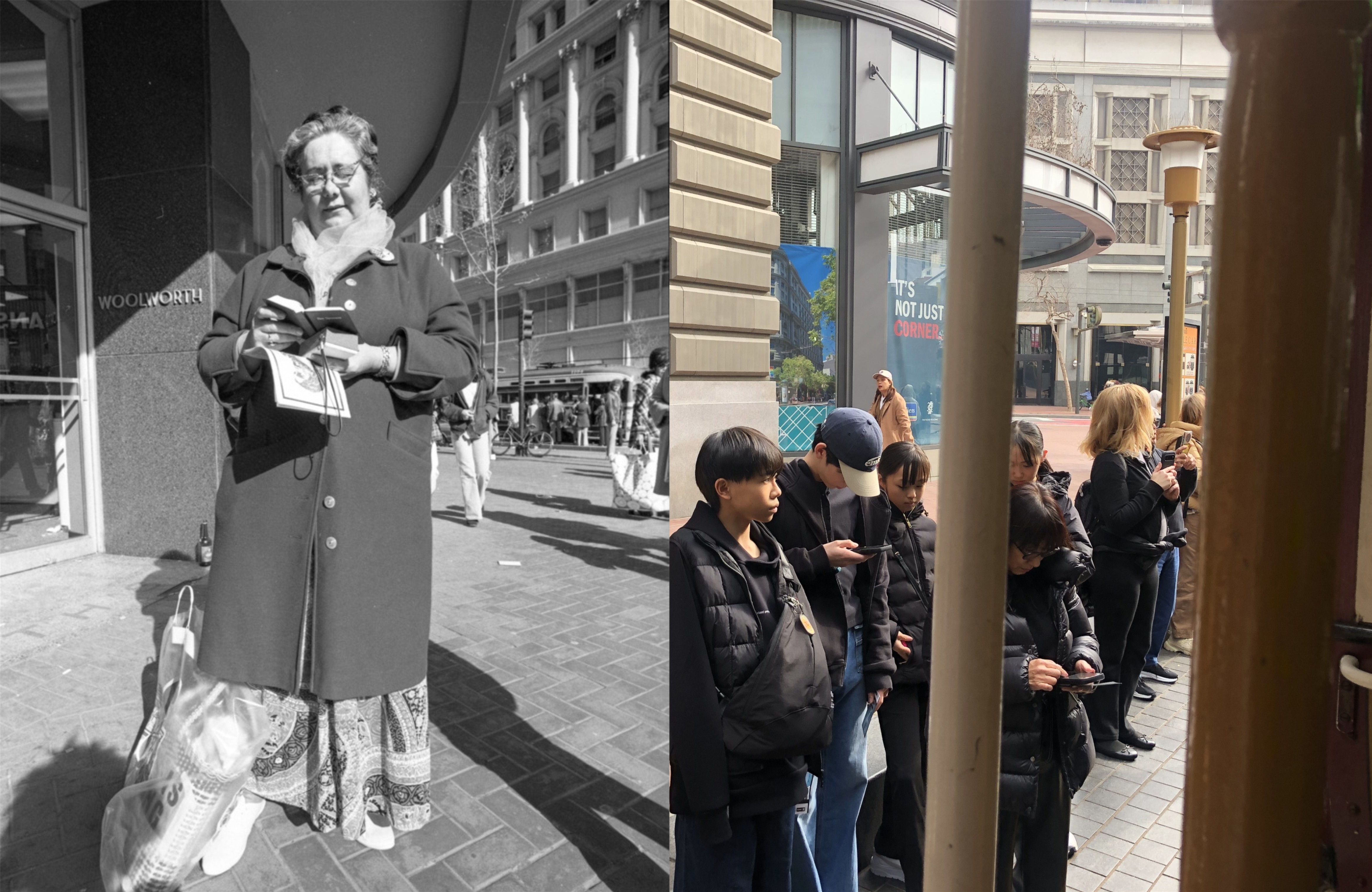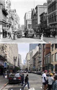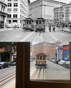 The ten or so people in line in front of me for the cable car wanted to catch the next one going to Hyde Street after this one, so I got right on. As we took off, I decided to take some pictures along the way, and try to match them up with vintage pictures near the same locations when I got back to the office; I call these “now and thens”, rather than “then and nows”. There is no better website on the internet for vintage San Francisco pictures than opensfhistory.org, where I found these vintage photos. As we took off from Market Street at Powell, I thought to myself that you don’t see as many street preachers at this location anymore; they’ve probably given up on me anyway. The vintage picture is from 1974.
