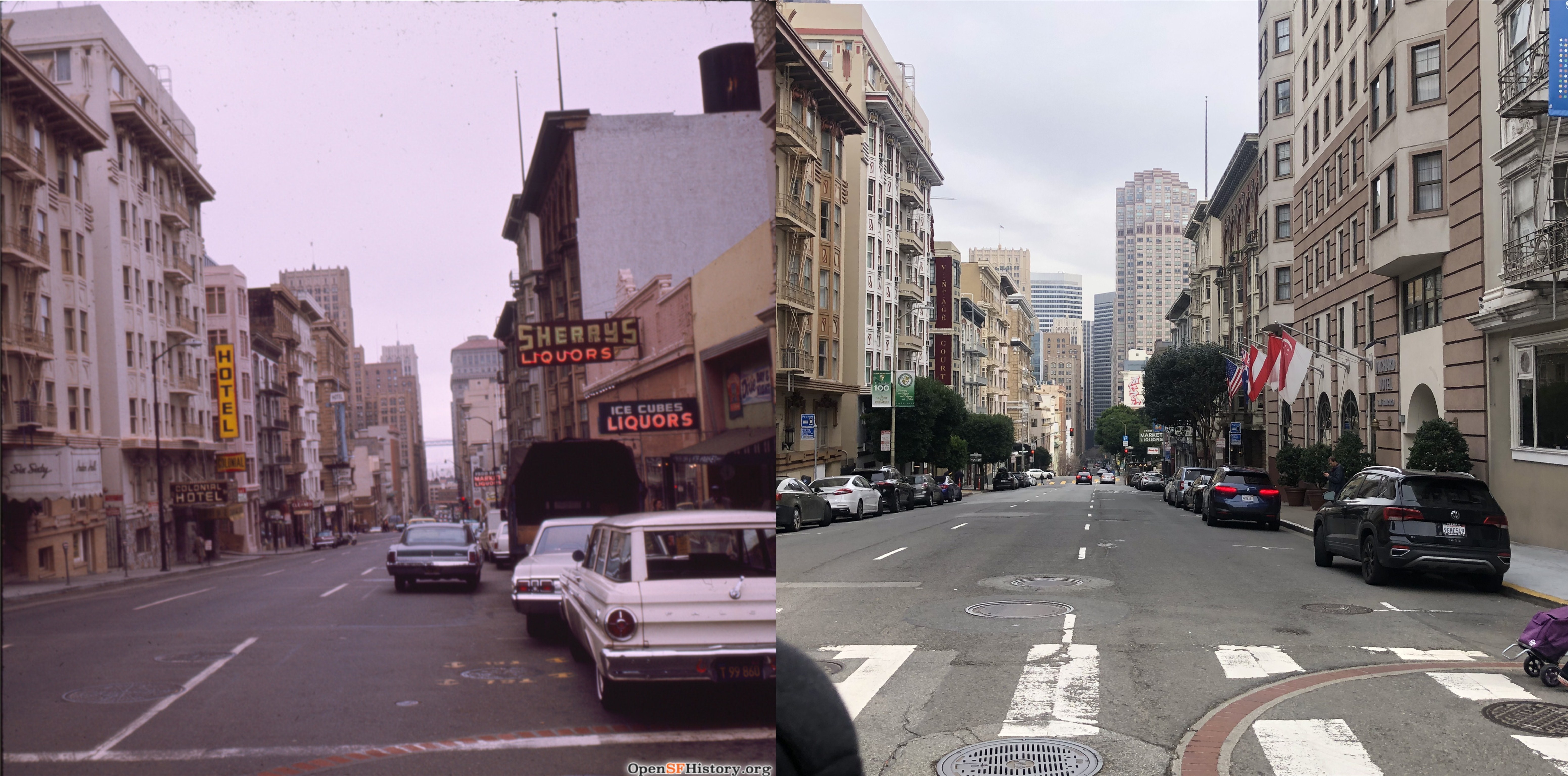 Looking down Bush Street in 1968: You can see the Russ Building on the left in both pictures. Hmm, Sherry’s Liquors with Ice Cubes and Liquors, and further down Bush Street was another Market with Liquors. Looks like this might have been a good spot to get drunk back then!