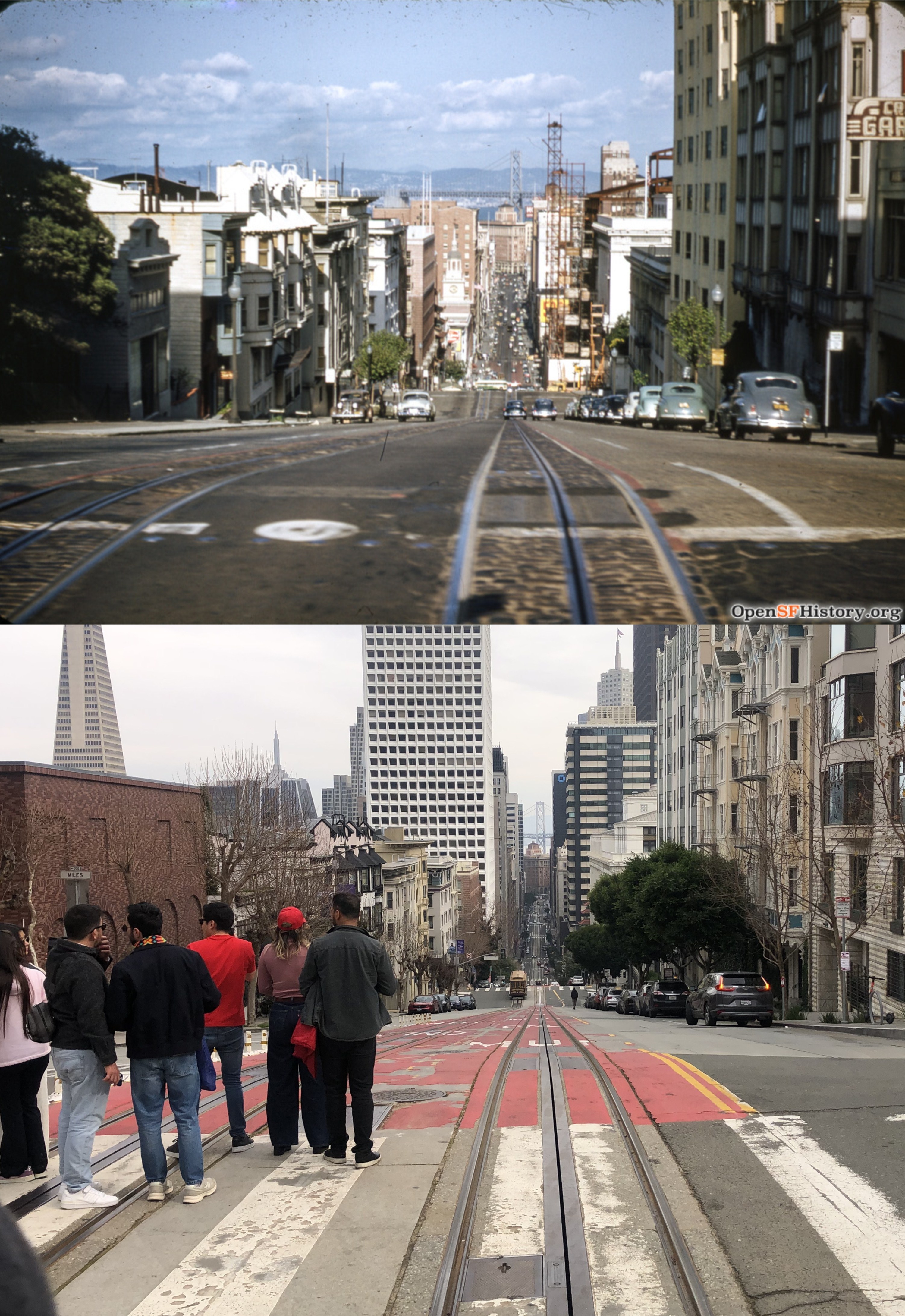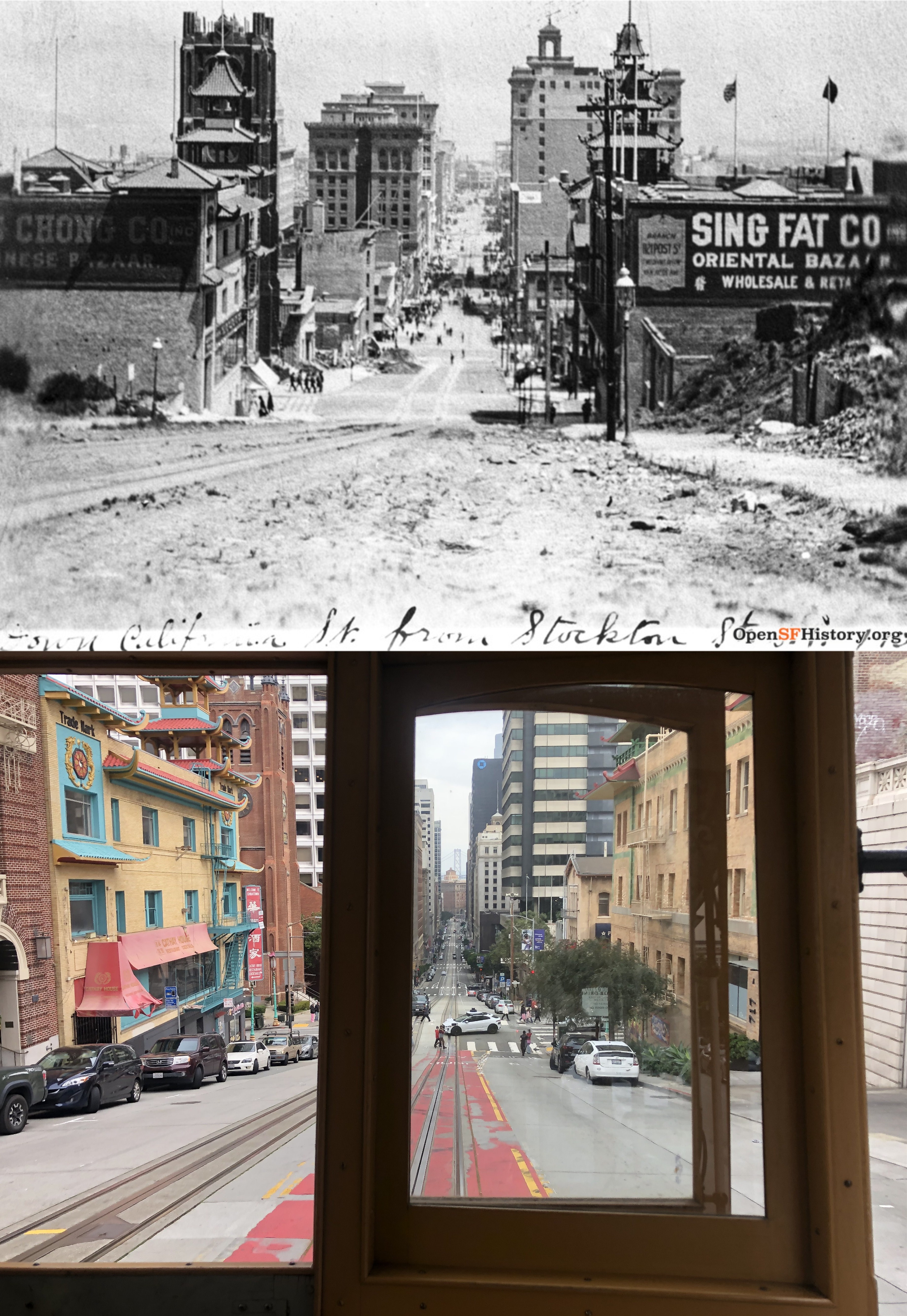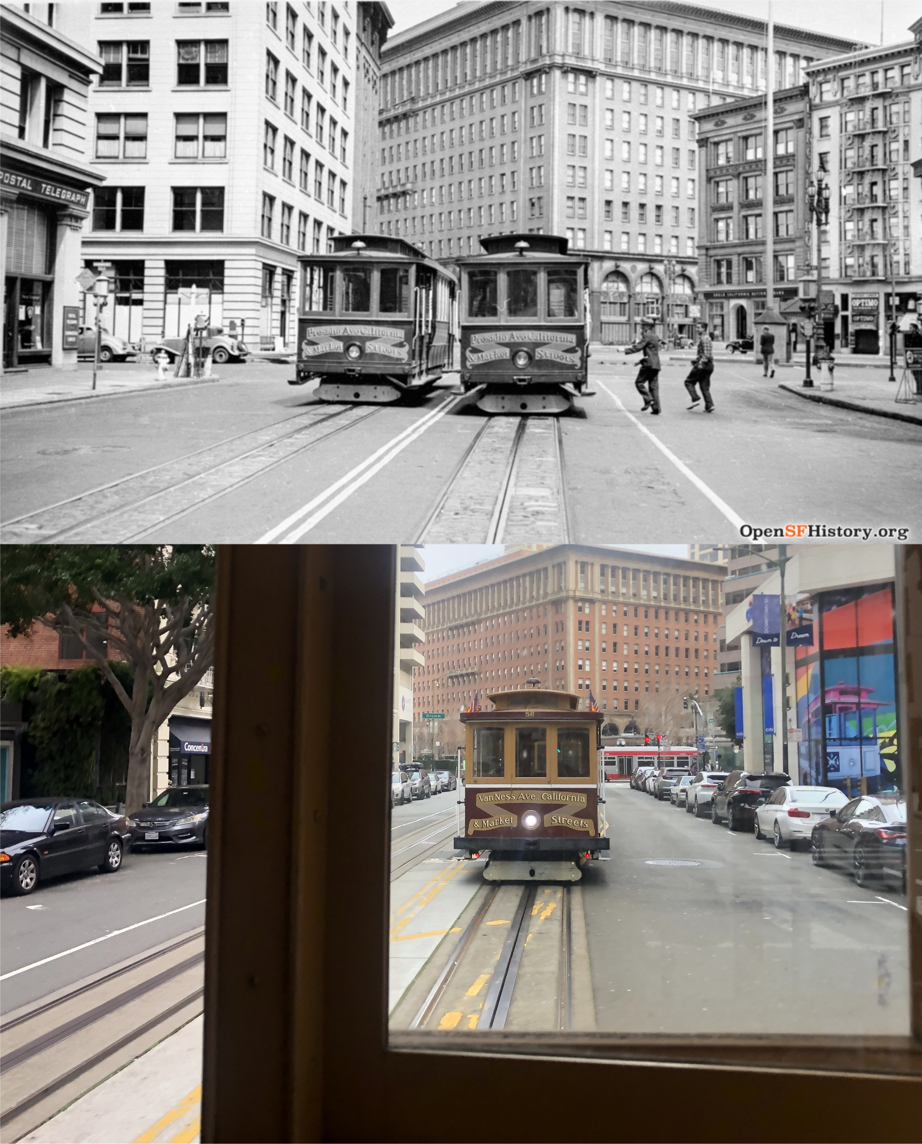 At California Street I switched to the California Street Cable Car Line as we plunged down Nob Hill from Powell Street. The vintage picture is from 1952