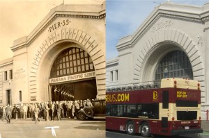 #11 Pier 35 in 1939: The Hop-On, Hop-Off tour bus parked in front of the pier kind of steals the show, but they’re okay. (UC Berkeley Library Archives)