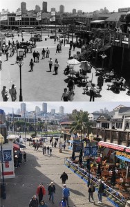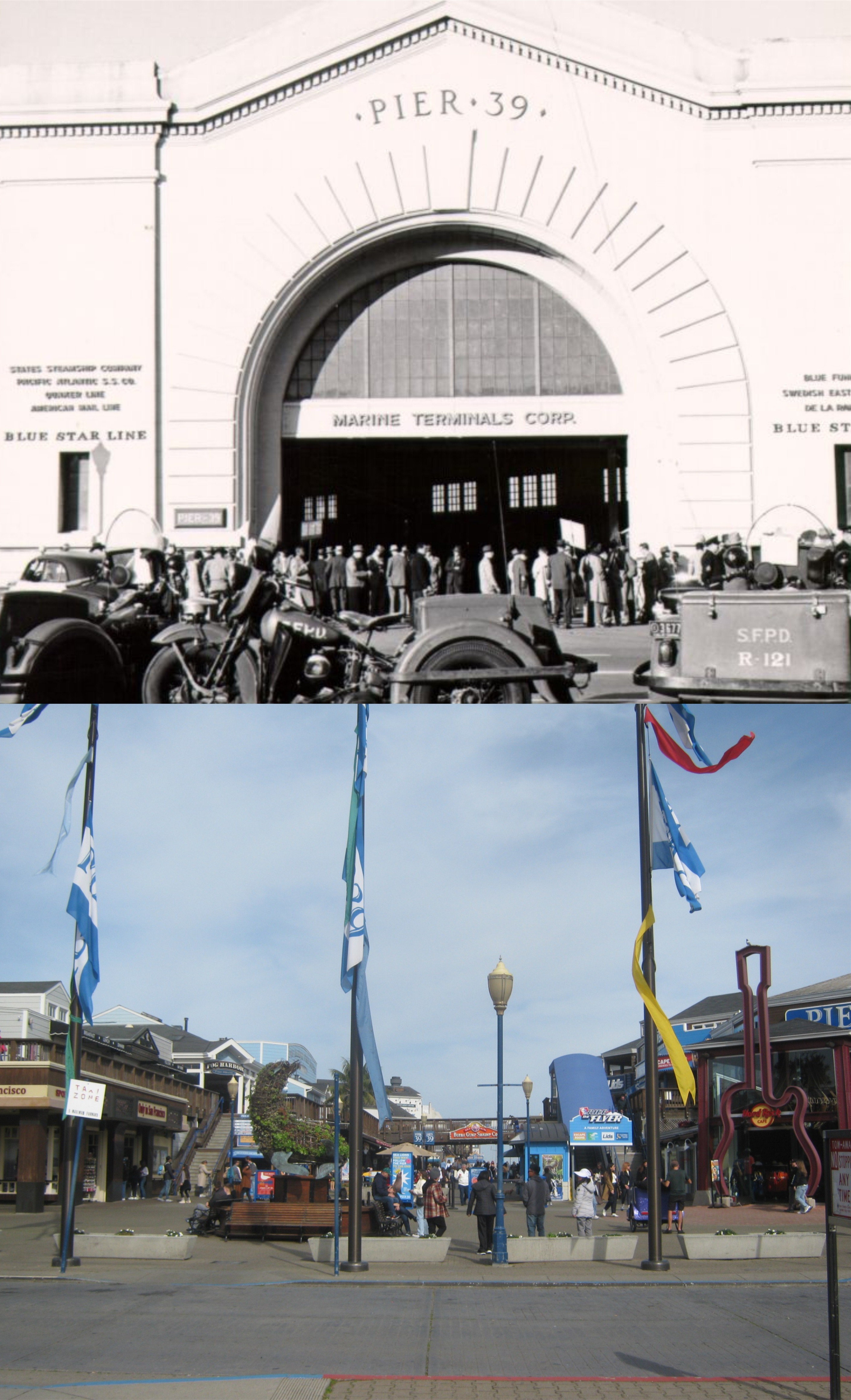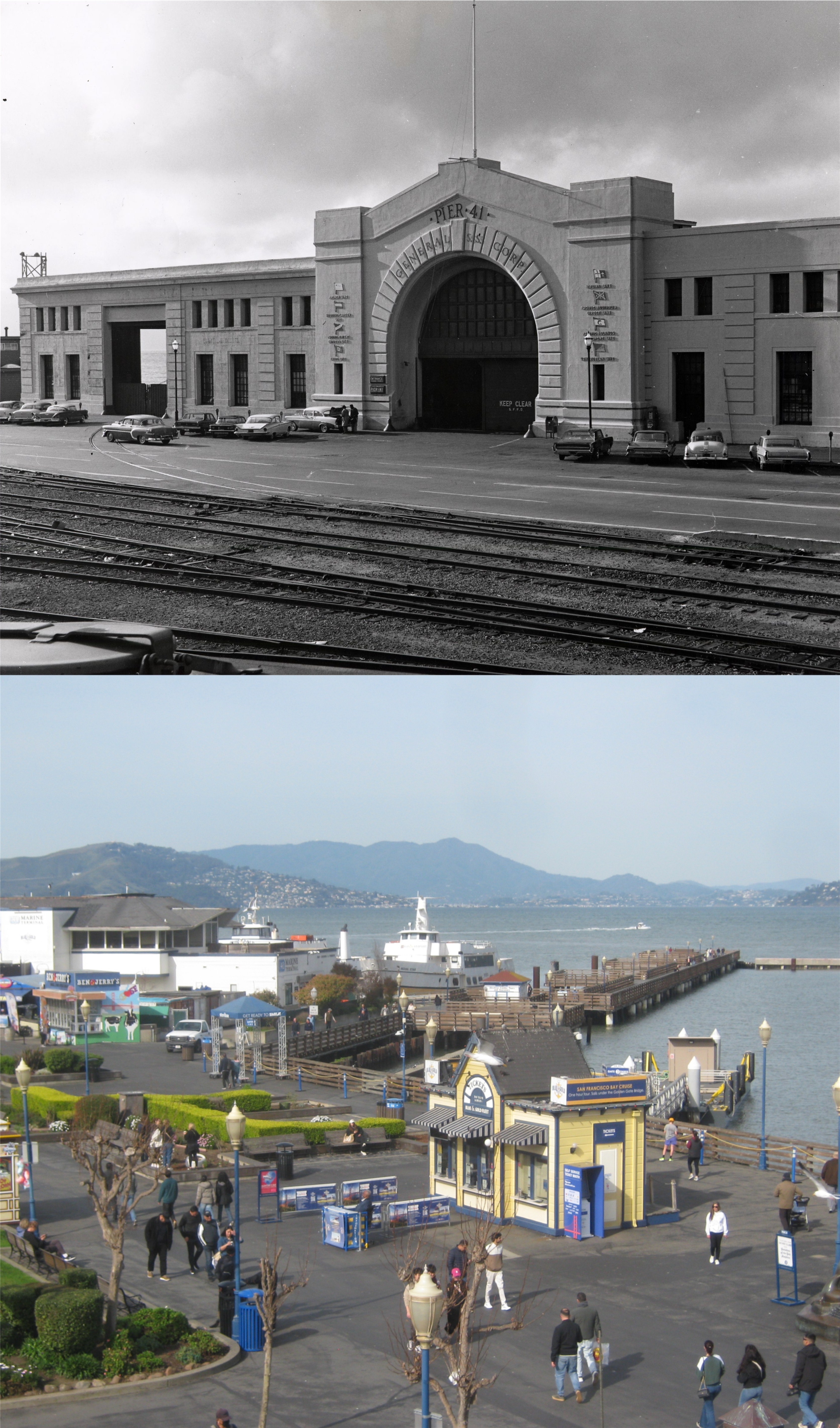 #13 An undated picture of Pier 39 from probably the 1950s, and the same spot today now. (San Francisco Library Digital Archives)