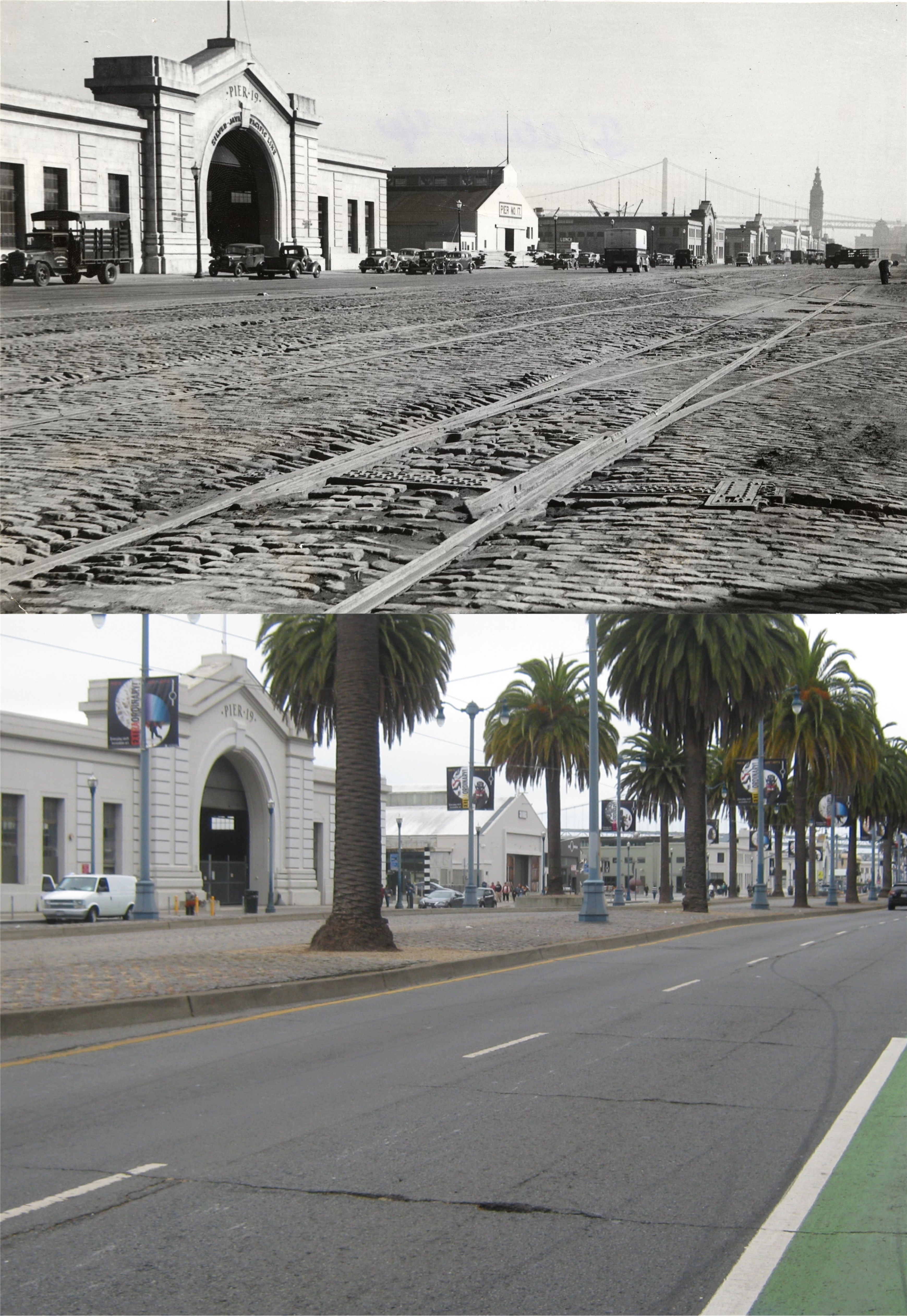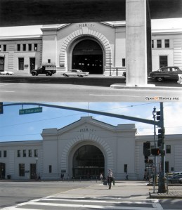 #9 Looking toward Piers 19 and 17 in 1940: The Bay Bridge and Ferry Building are on the far right in the vintage picture. (San Francisco Library Digital Archives)