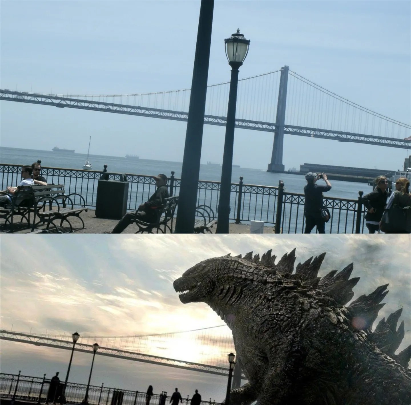 #5 Godzilla leaves San Francisco past the Pier 7 Walking Pier after destroying most of San Francisco in the 2014 ‘Godzilla’ film.